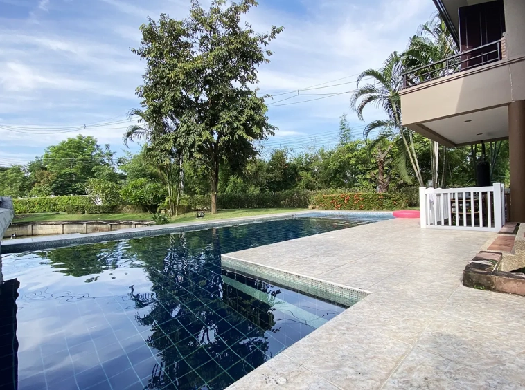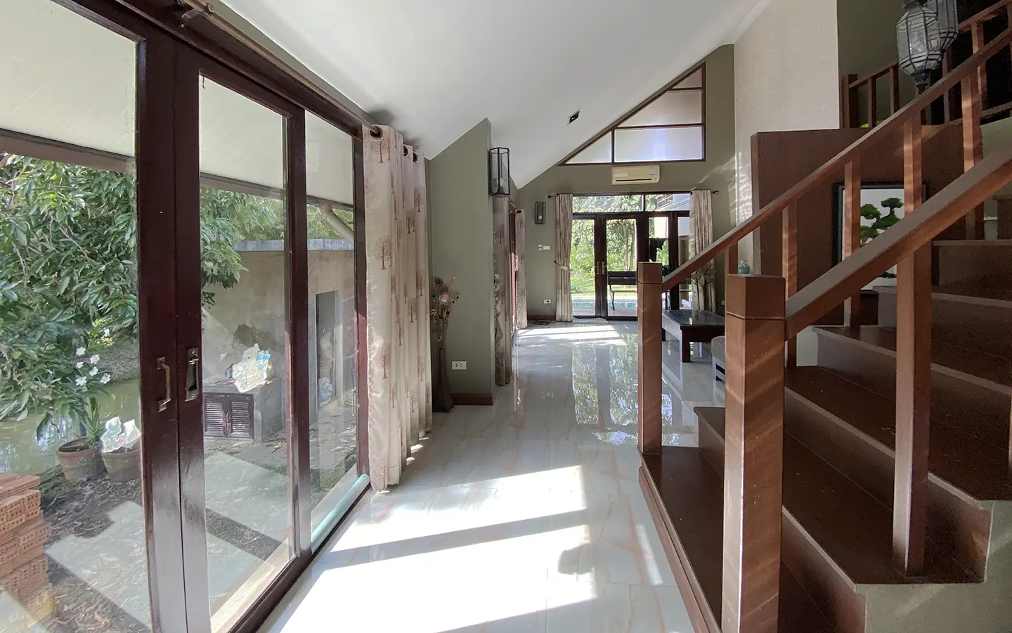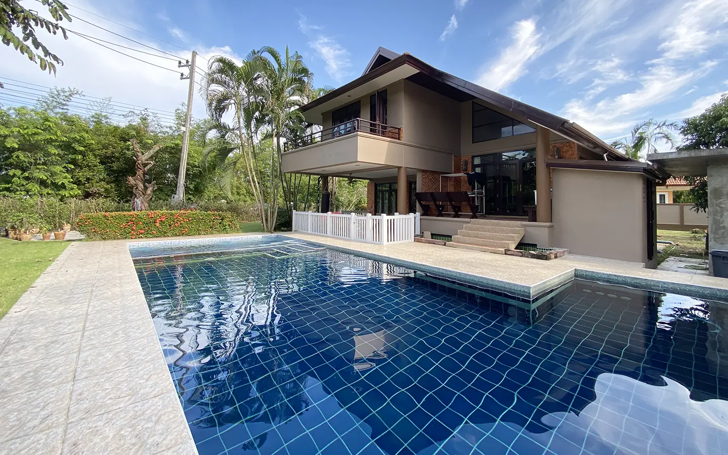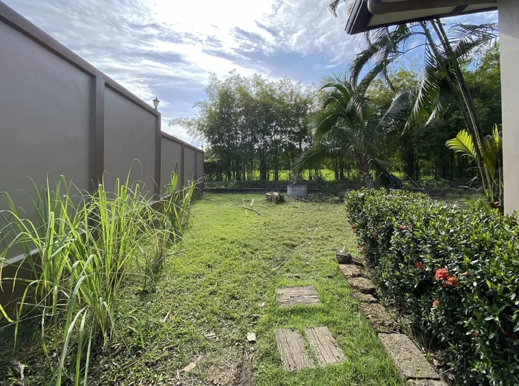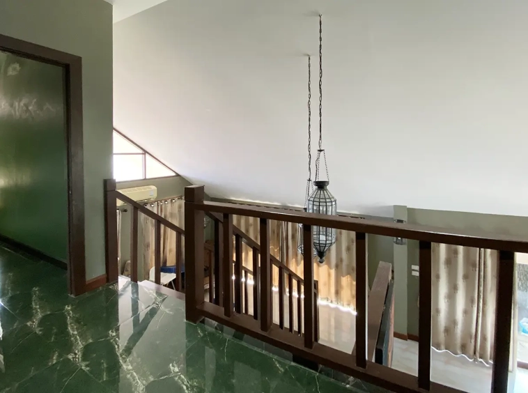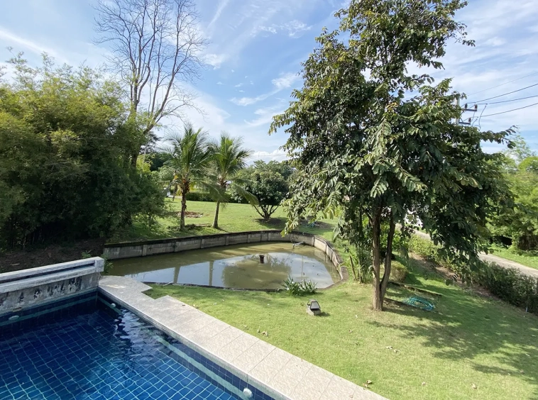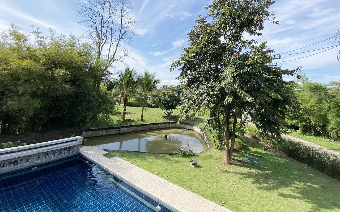 The house was built 15 years ago using high-standard materials and just underwent a full renovation this year. In this serene and peaceful little village, the property sits on a well-kept garden with a swimming pool, pond, mature trees and lawn. The living area is spacious with the TV area, the dining area and the Western kitchen with a built-in oven and breakfast counter island. There is an additional sitting room which can be used as a third bedroom if one is needed. Upstairs, there are 2 large comfortable bedrooms, both are ensuite, one with a jacuzzi and one with a walk-in shower. Both bedrooms have their own terraces of which one is large and overlooks the pool.