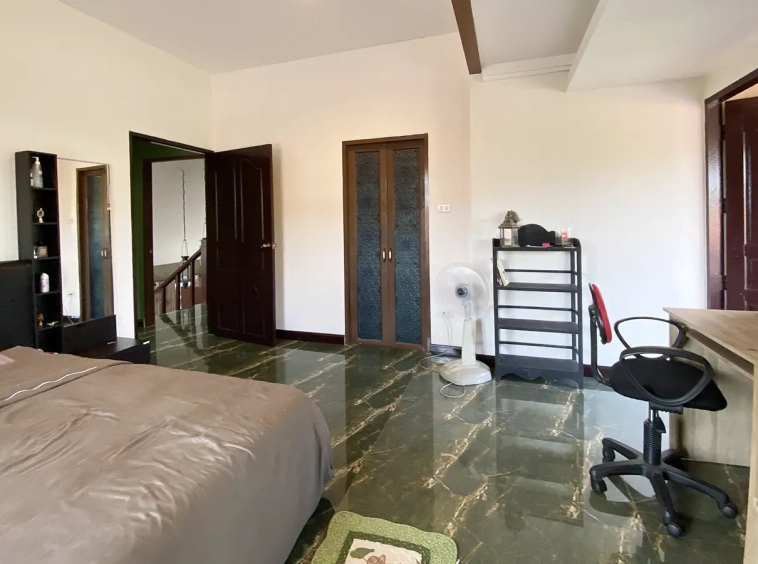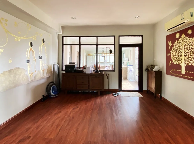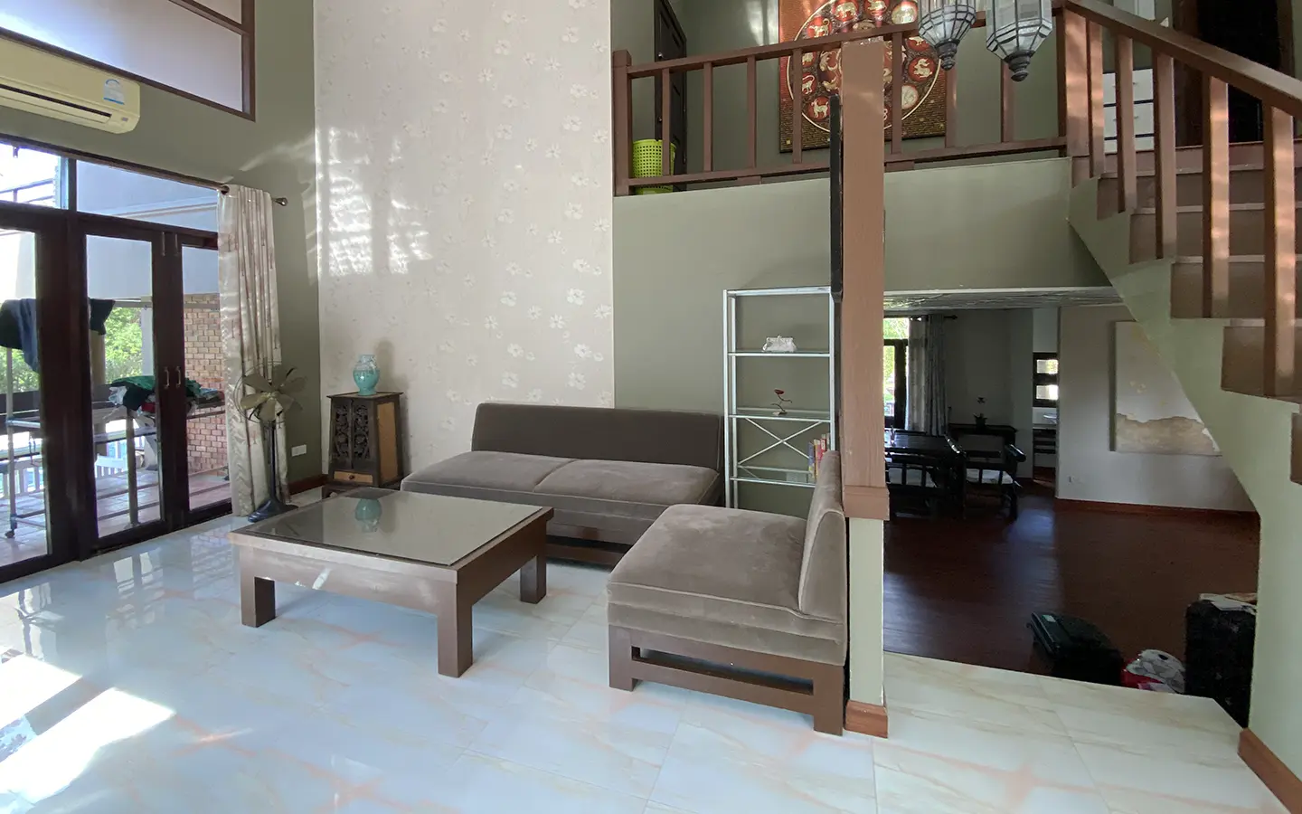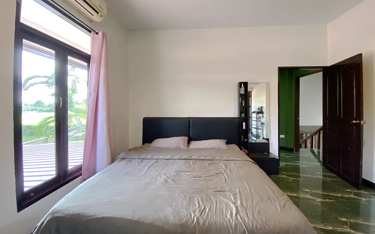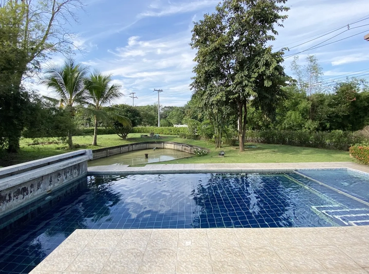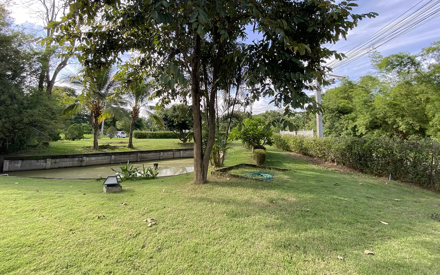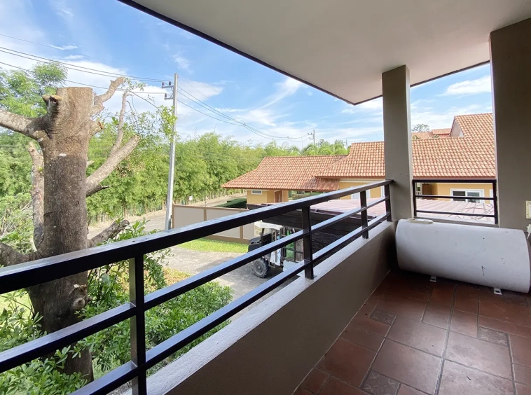 The house was built 15 years ago using high-standard materials and just underwent a full renovation this year. In this serene and peaceful little village, the property sits on a well-kept garden with a swimming pool, pond, mature trees and lawn. The living area is spacious with the TV area, the dining area and the Western kitchen with a built-in oven and breakfast counter island. There is an additional sitting room which can be used as a third bedroom if one is needed. Upstairs, there are 2 large comfortable bedrooms, both are ensuite, one with a jacuzzi and one with a walk-in shower. Both bedrooms have their own terraces of which one is large and overlooks the pool.