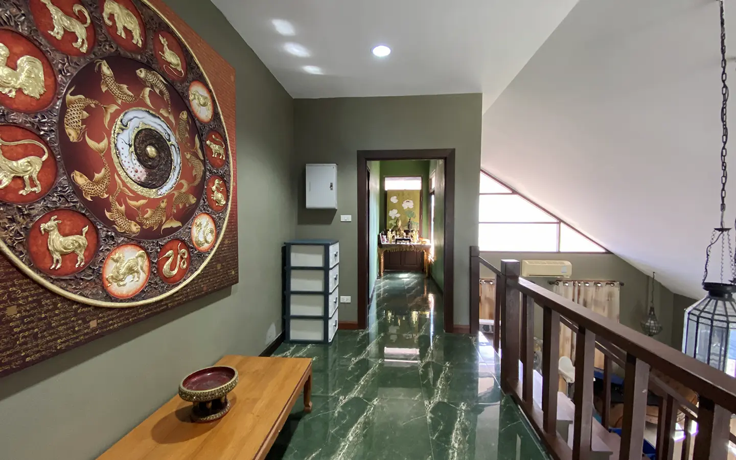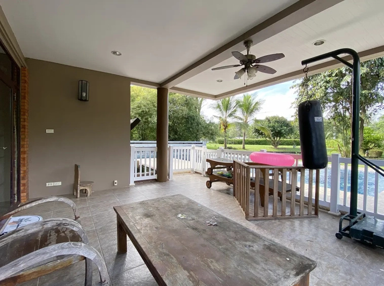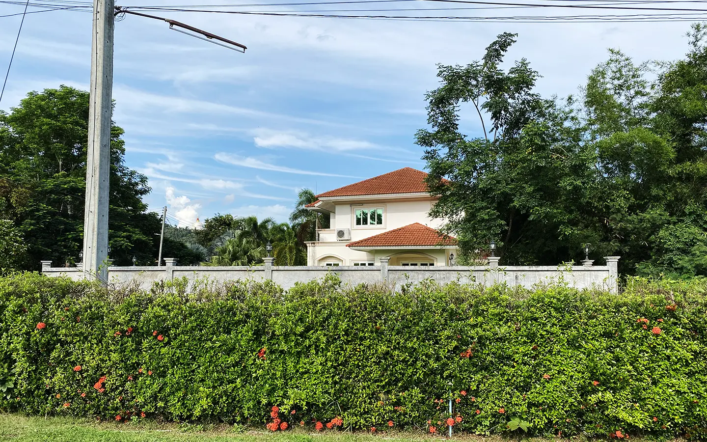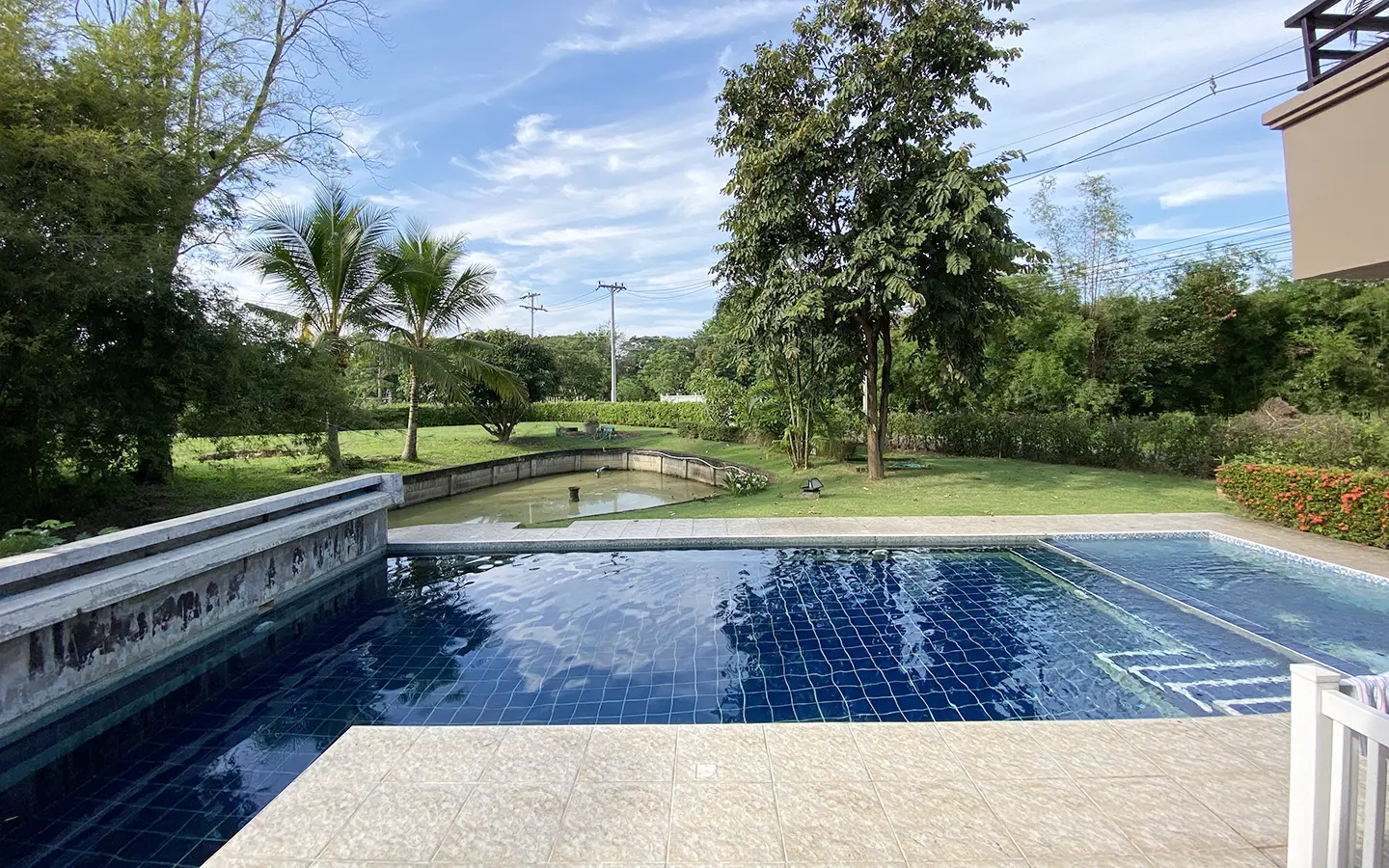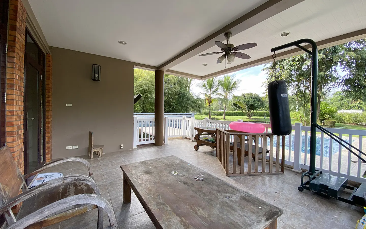 The house was built 15 years ago using high-standard materials and just underwent a full renovation this year. In this serene and peaceful little village, the property sits on a well-kept garden with a swimming pool, pond, mature trees and lawn. The living area is spacious with the TV area, the dining area and the Western kitchen with a built-in oven and breakfast counter island. There is an additional sitting room which can be used as a third bedroom if one is needed. Upstairs, there are 2 large comfortable bedrooms, both are ensuite, one with a jacuzzi and one with a walk-in shower. Both bedrooms have their own terraces of which one is large and overlooks the pool.