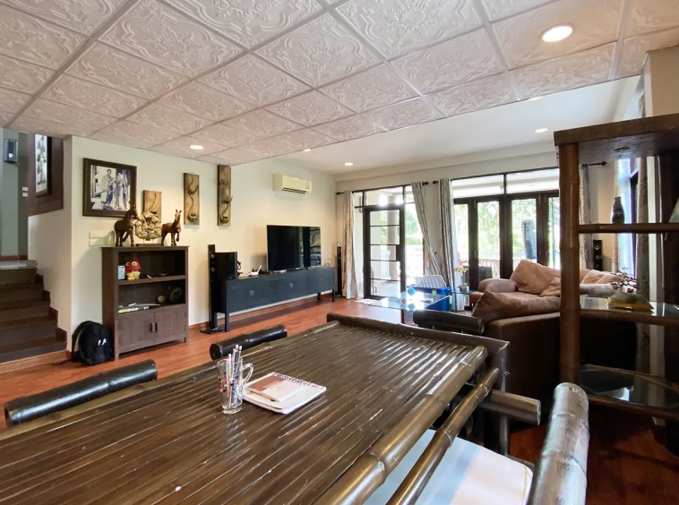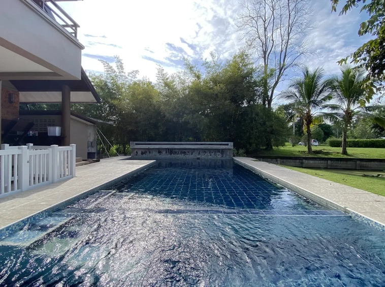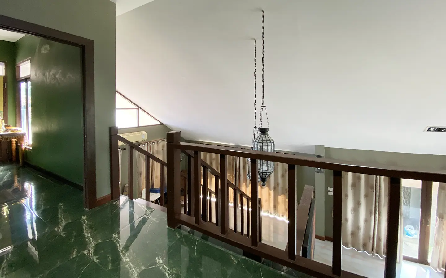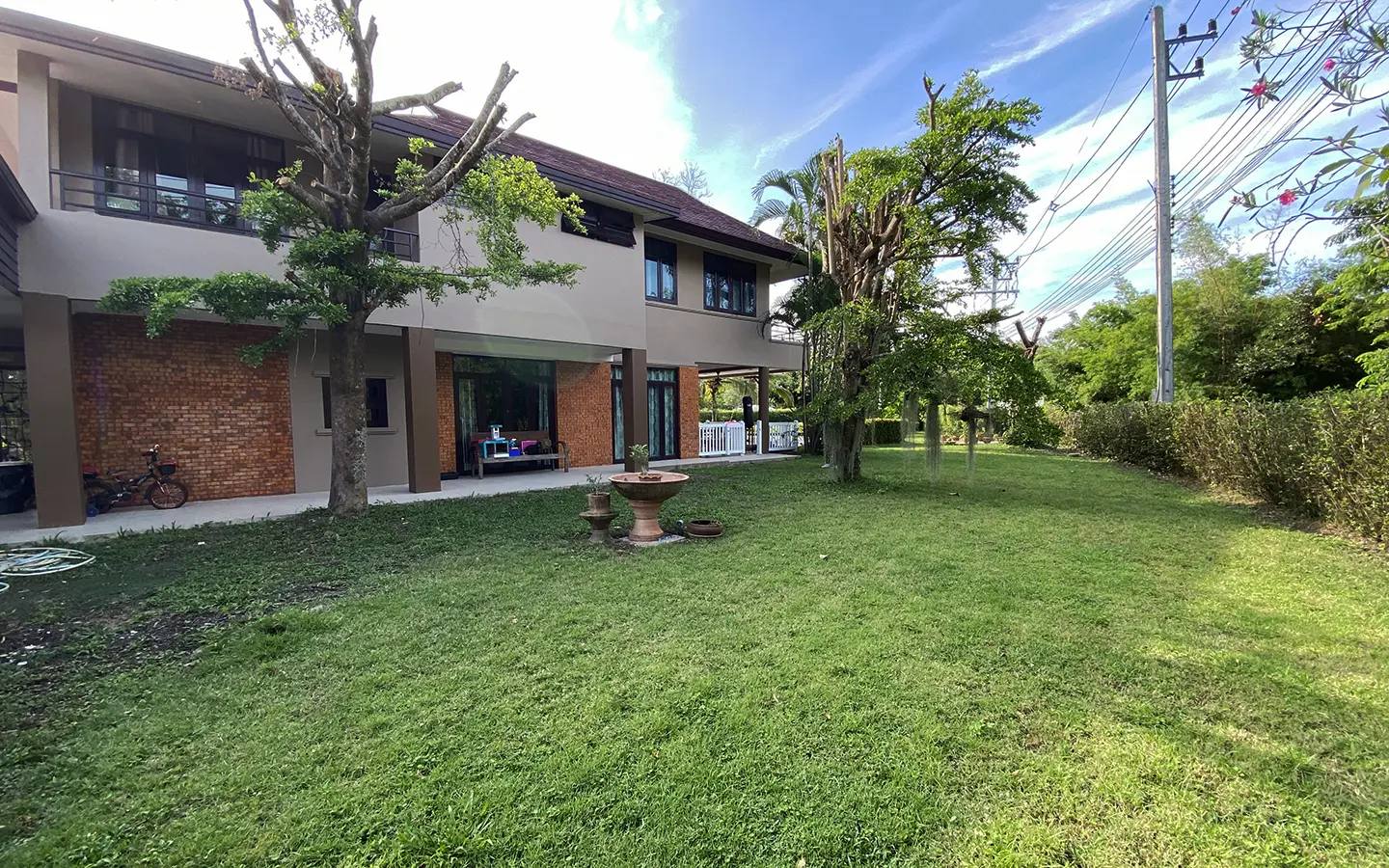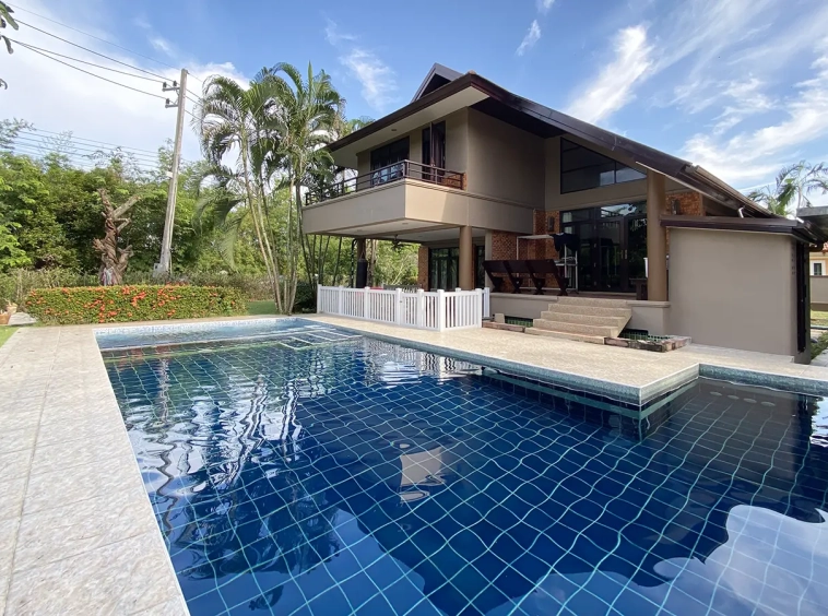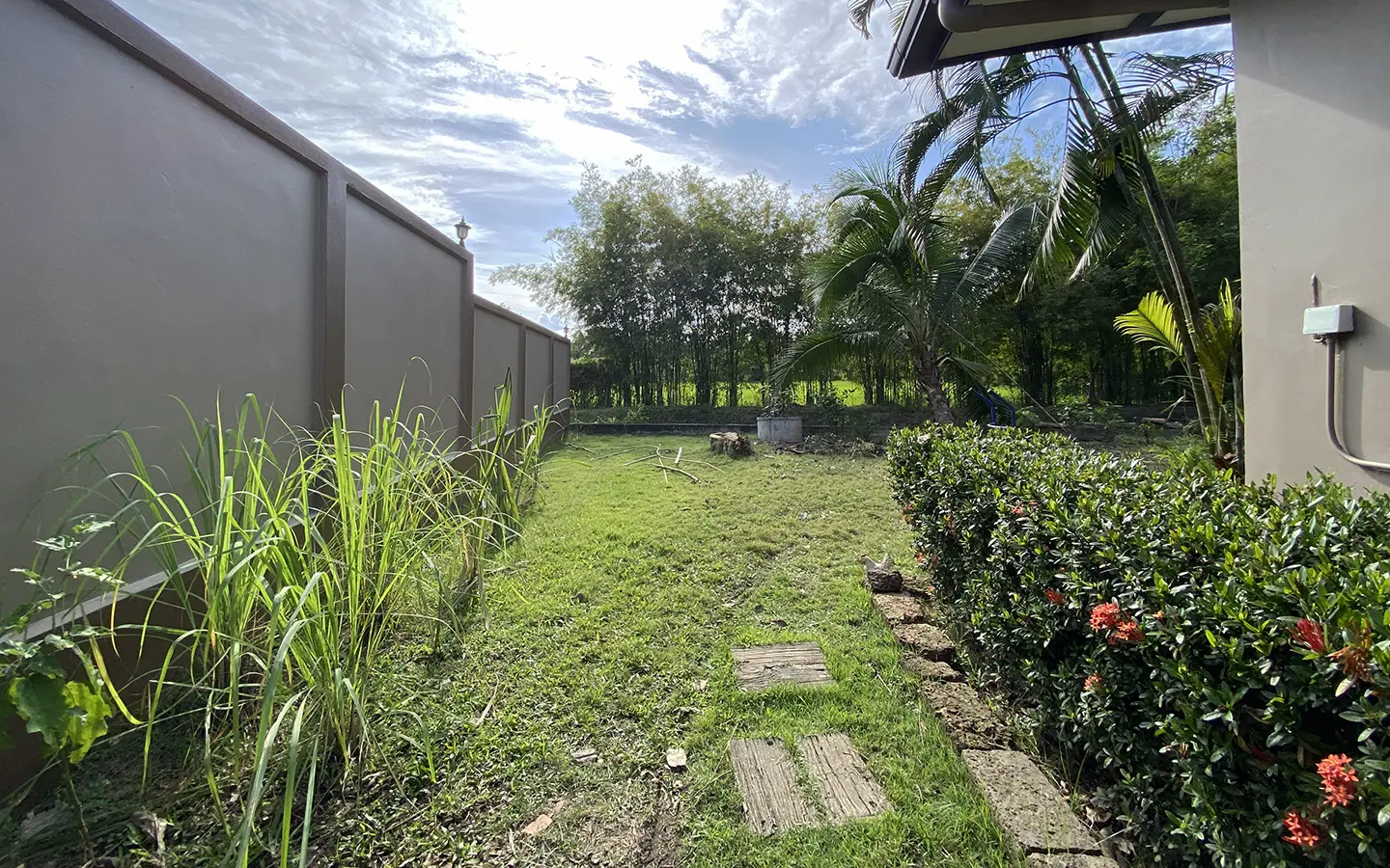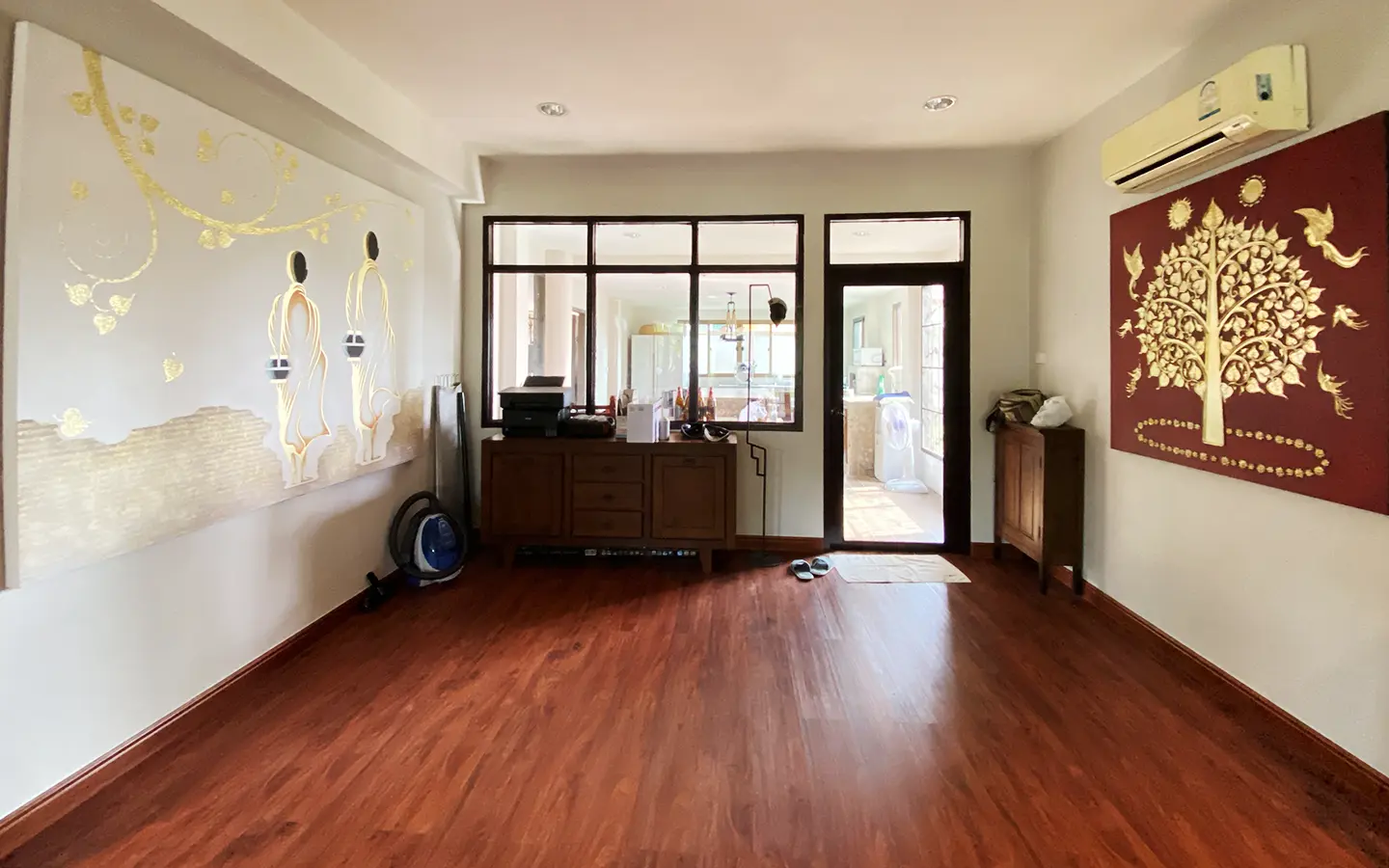 The house was built 15 years ago using high-standard materials and just underwent a full renovation this year. In this serene and peaceful little village, the property sits on a well-kept garden with a swimming pool, pond, mature trees and lawn. The living area is spacious with the TV area, the dining area and the Western kitchen with a built-in oven and breakfast counter island. There is an additional sitting room which can be used as a third bedroom if one is needed. Upstairs, there are 2 large comfortable bedrooms, both are ensuite, one with a jacuzzi and one with a walk-in shower. Both bedrooms have their own terraces of which one is large and overlooks the pool.