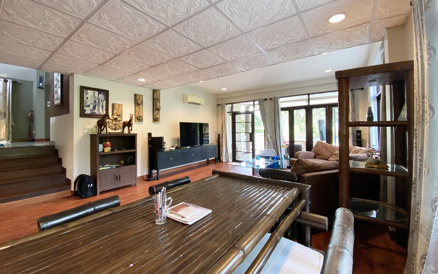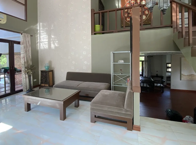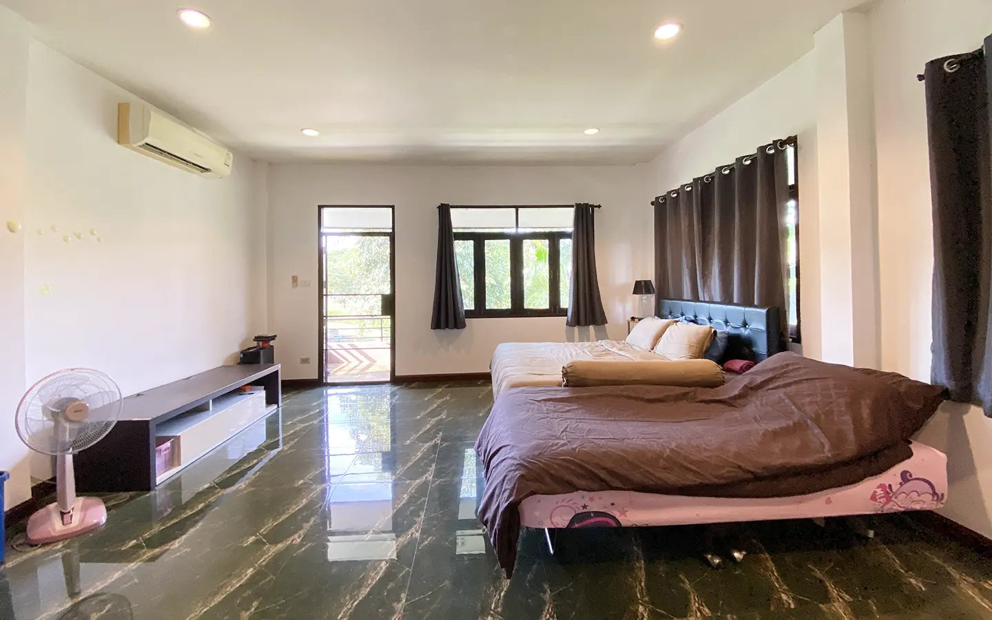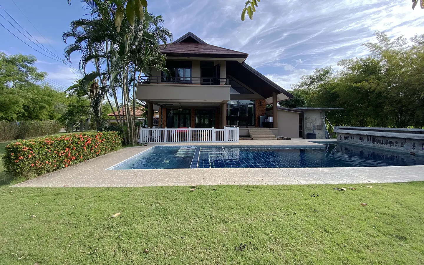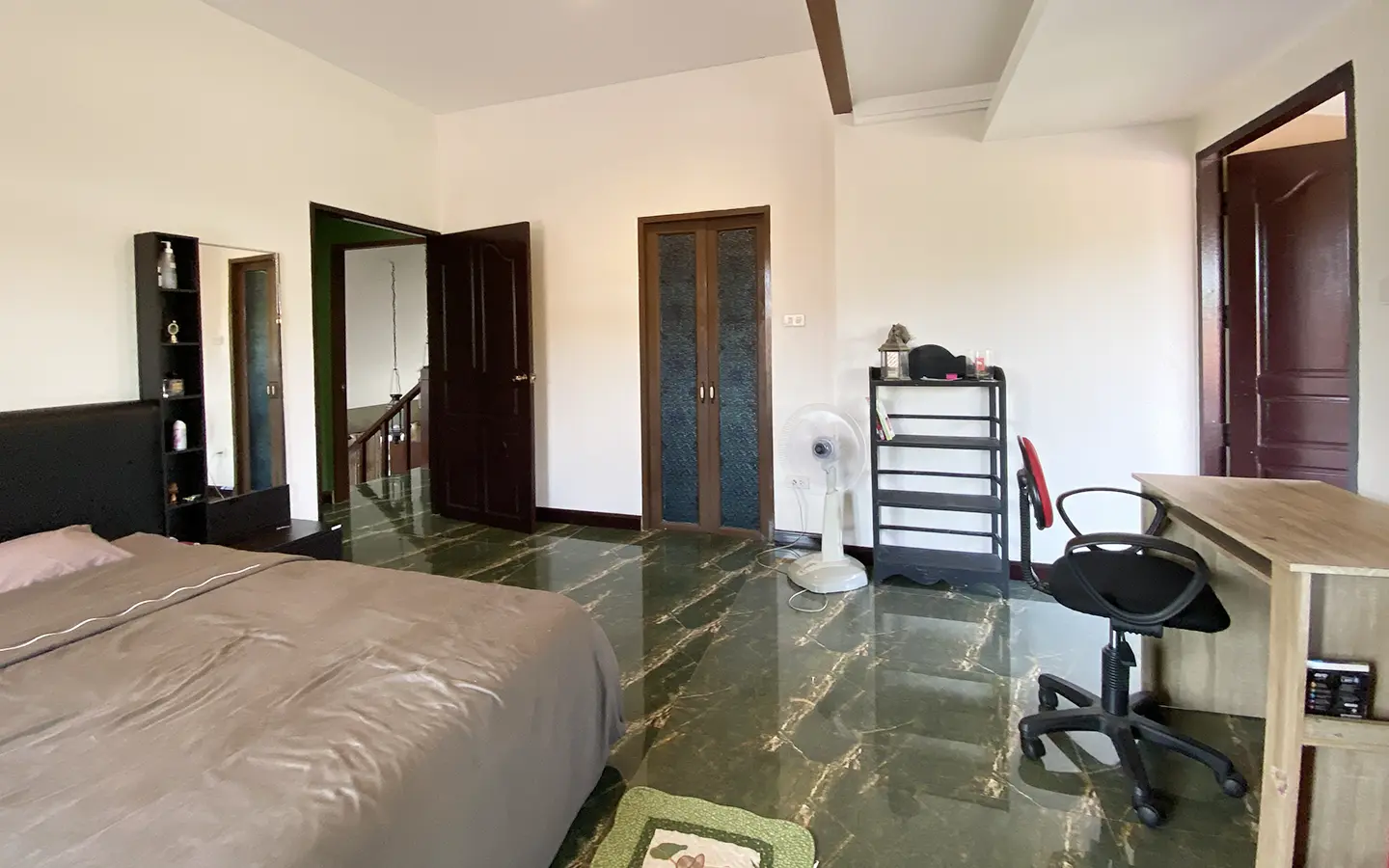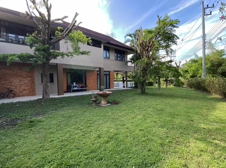 The house was built 15 years ago using high-standard materials and just underwent a full renovation this year. In this serene and peaceful little village, the property sits on a well-kept garden with a swimming pool, pond, mature trees and lawn. The living area is spacious with the TV area, the dining area and the Western kitchen with a built-in oven and breakfast counter island. There is an additional sitting room which can be used as a third bedroom if one is needed. Upstairs, there are 2 large comfortable bedrooms, both are ensuite, one with a jacuzzi and one with a walk-in shower. Both bedrooms have their own terraces of which one is large and overlooks the pool.