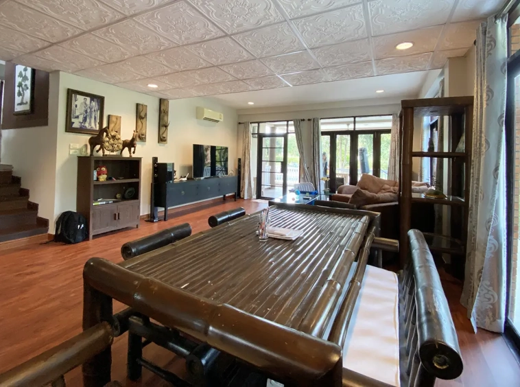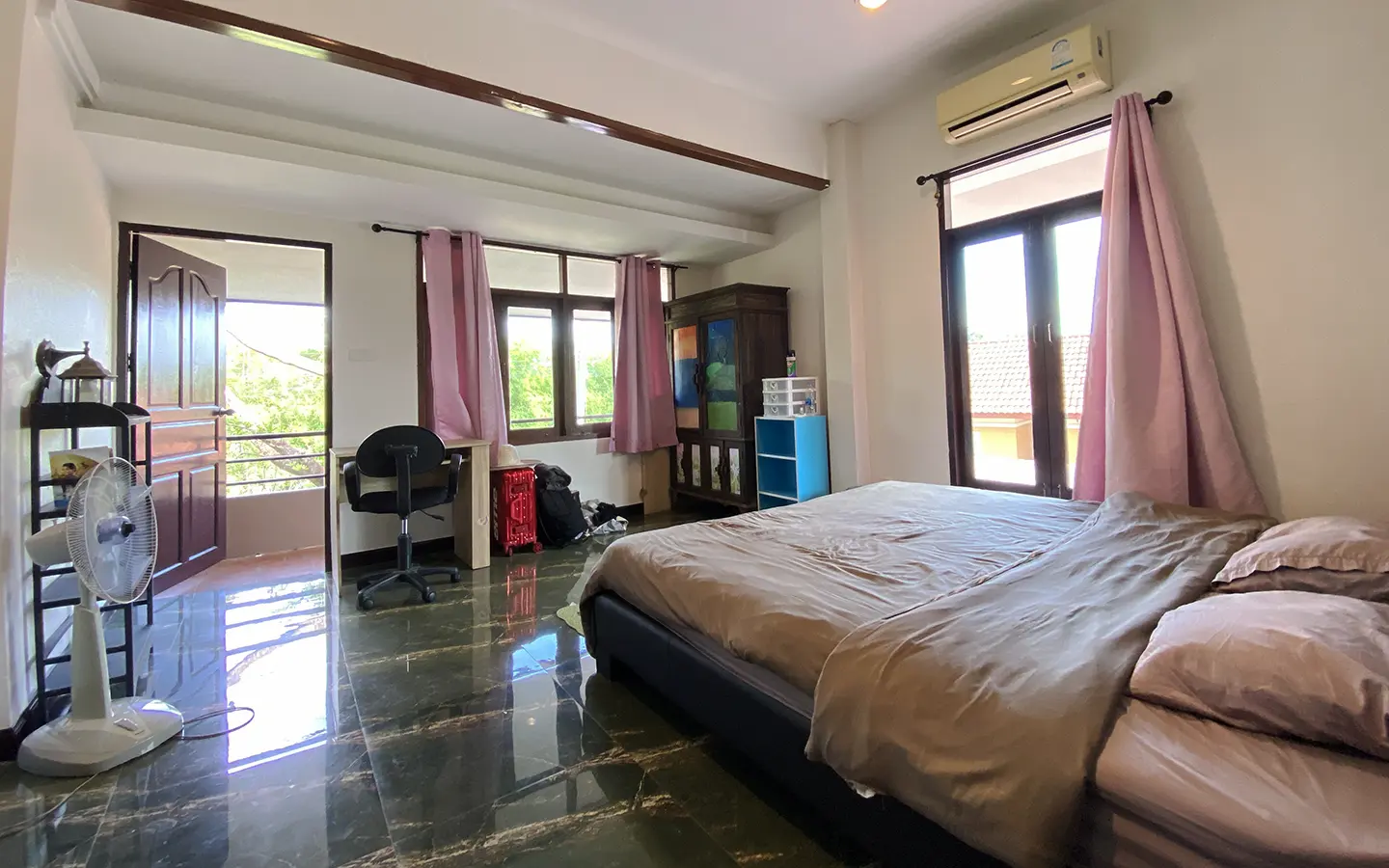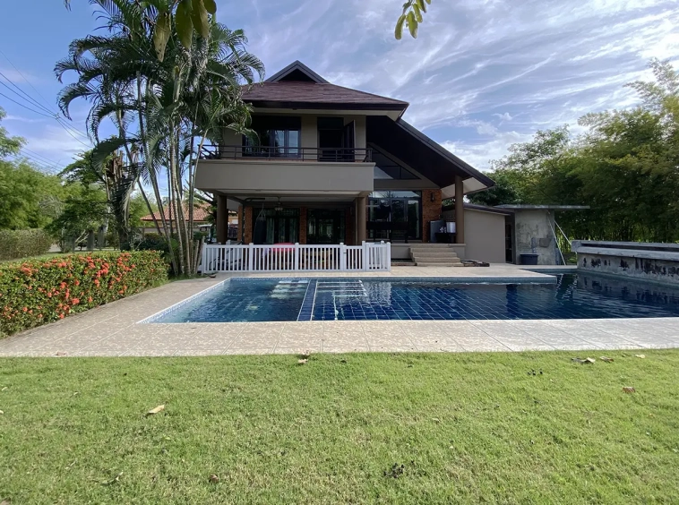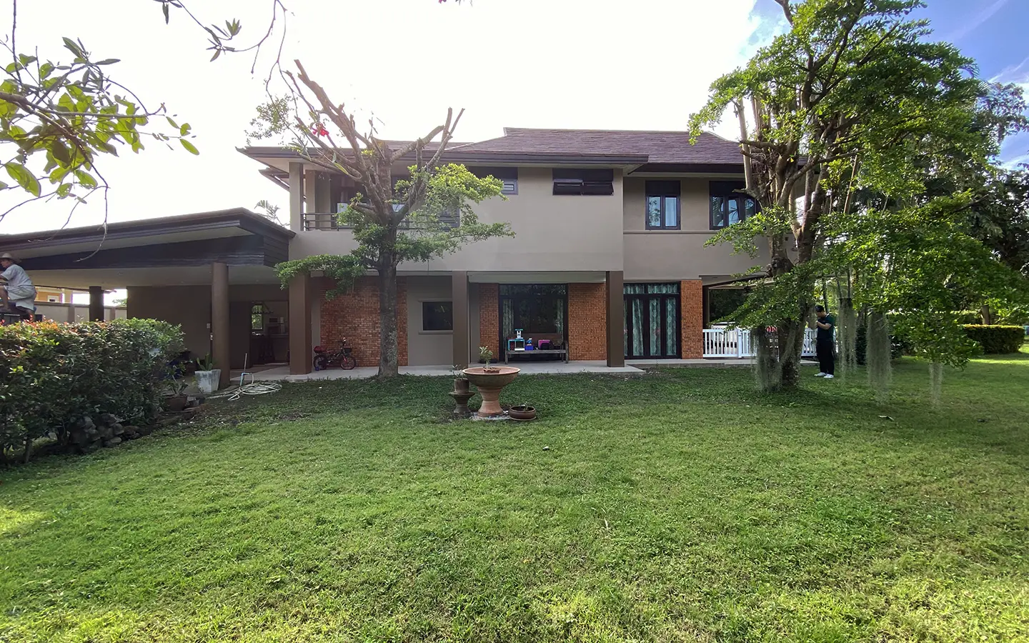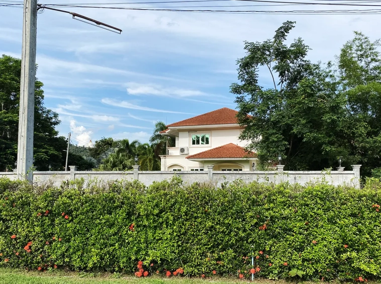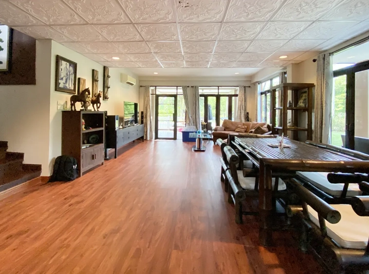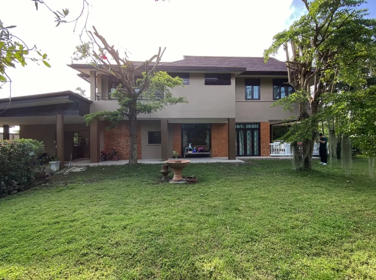 The house was built 15 years ago using high-standard materials and just underwent a full renovation this year. In this serene and peaceful little village, the property sits on a well-kept garden with a swimming pool, pond, mature trees and lawn. The living area is spacious with the TV area, the dining area and the Western kitchen with a built-in oven and breakfast counter island. There is an additional sitting room which can be used as a third bedroom if one is needed. Upstairs, there are 2 large comfortable bedrooms, both are ensuite, one with a jacuzzi and one with a walk-in shower. Both bedrooms have their own terraces of which one is large and overlooks the pool.