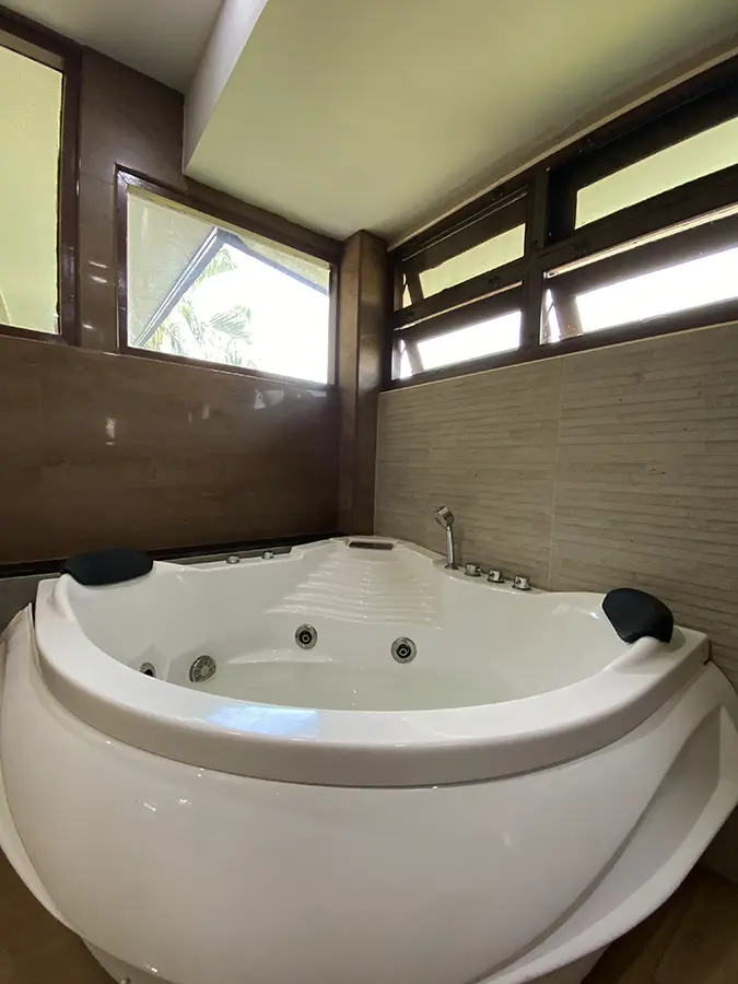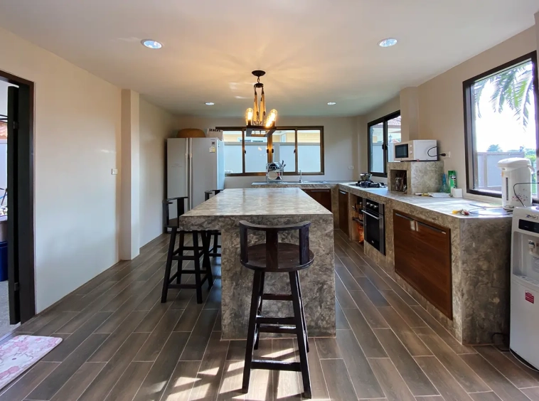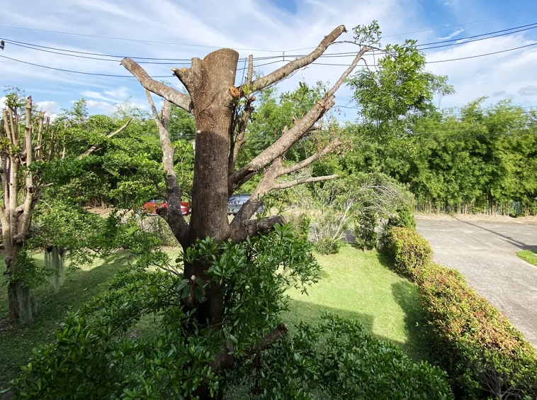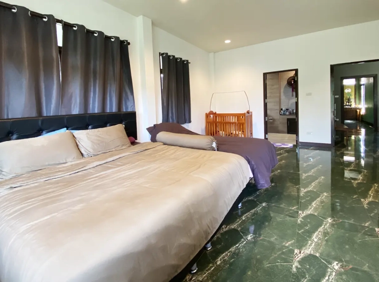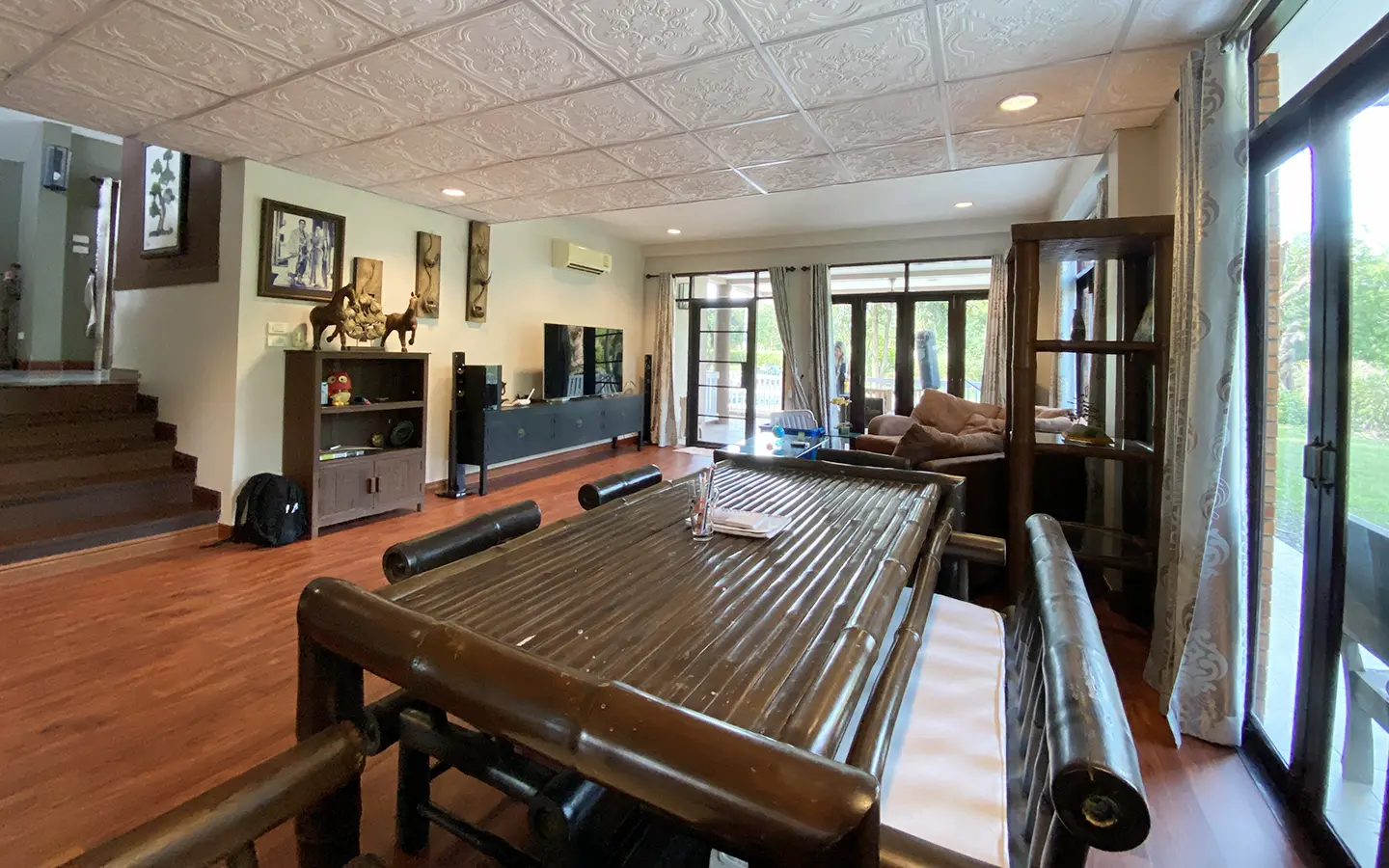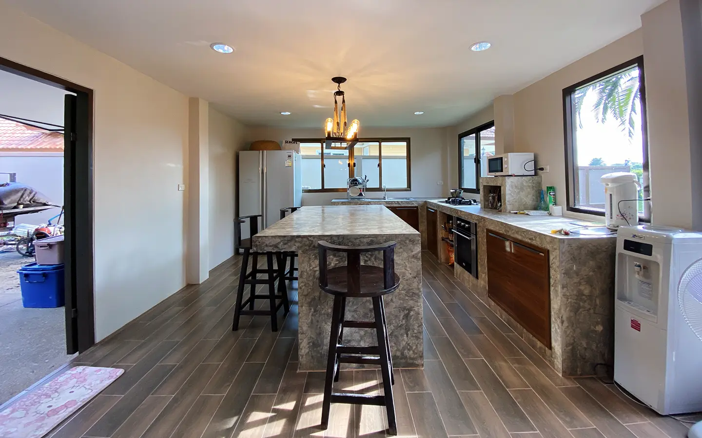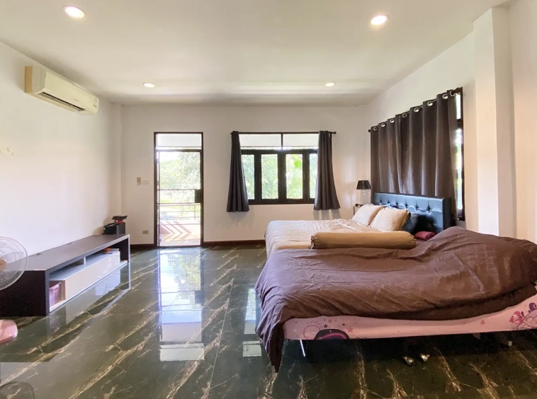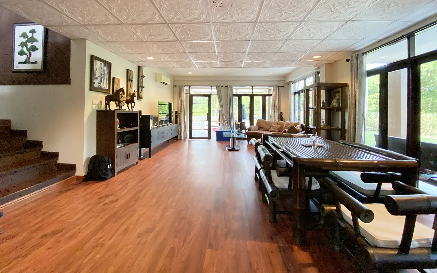 The house was built 15 years ago using high-standard materials and just underwent a full renovation this year. In this serene and peaceful little village, the property sits on a well-kept garden with a swimming pool, pond, mature trees and lawn. The living area is spacious with the TV area, the dining area and the Western kitchen with a built-in oven and breakfast counter island. There is an additional sitting room which can be used as a third bedroom if one is needed. Upstairs, there are 2 large comfortable bedrooms, both are ensuite, one with a jacuzzi and one with a walk-in shower. Both bedrooms have their own terraces of which one is large and overlooks the pool.