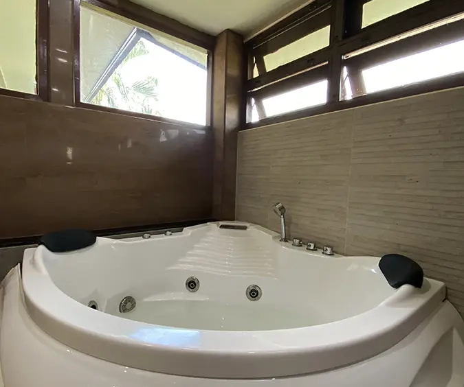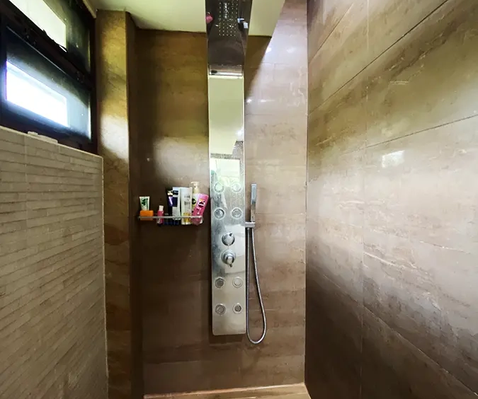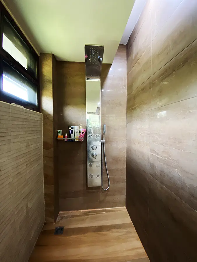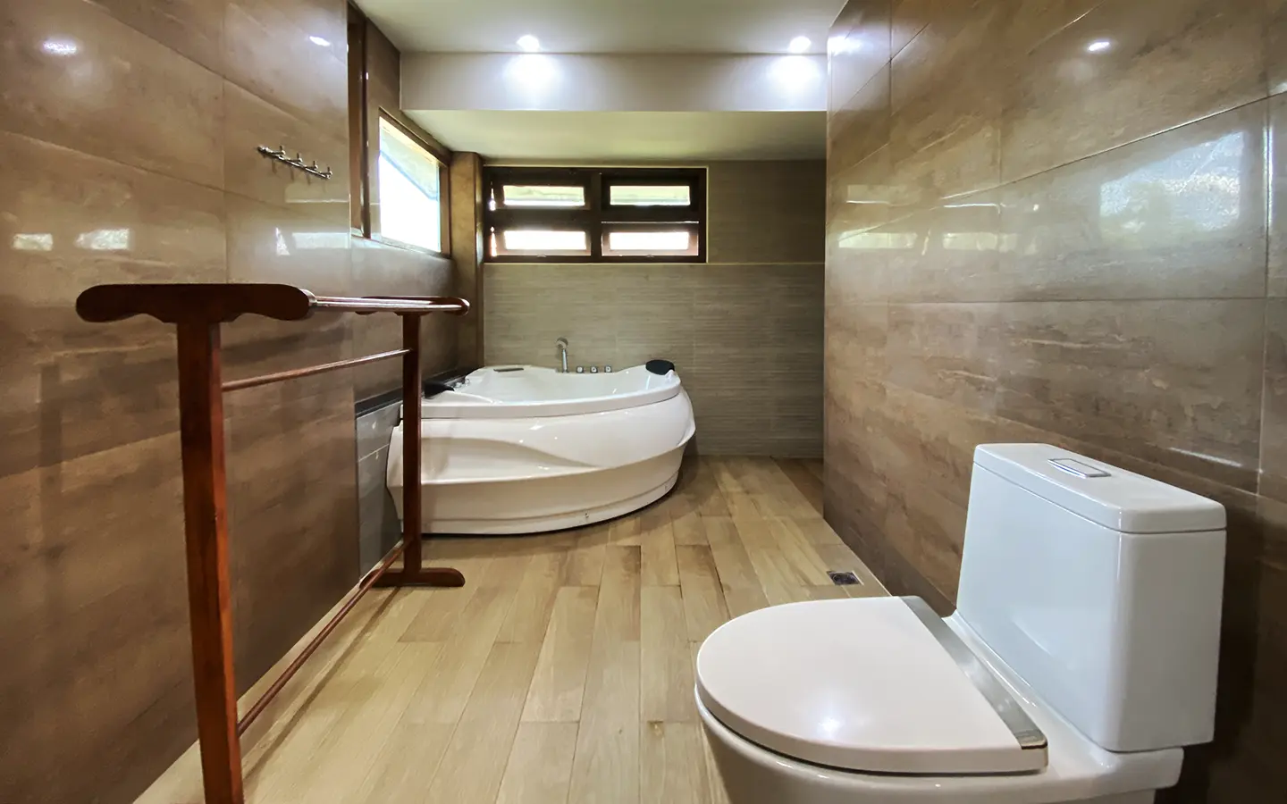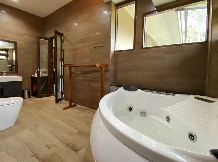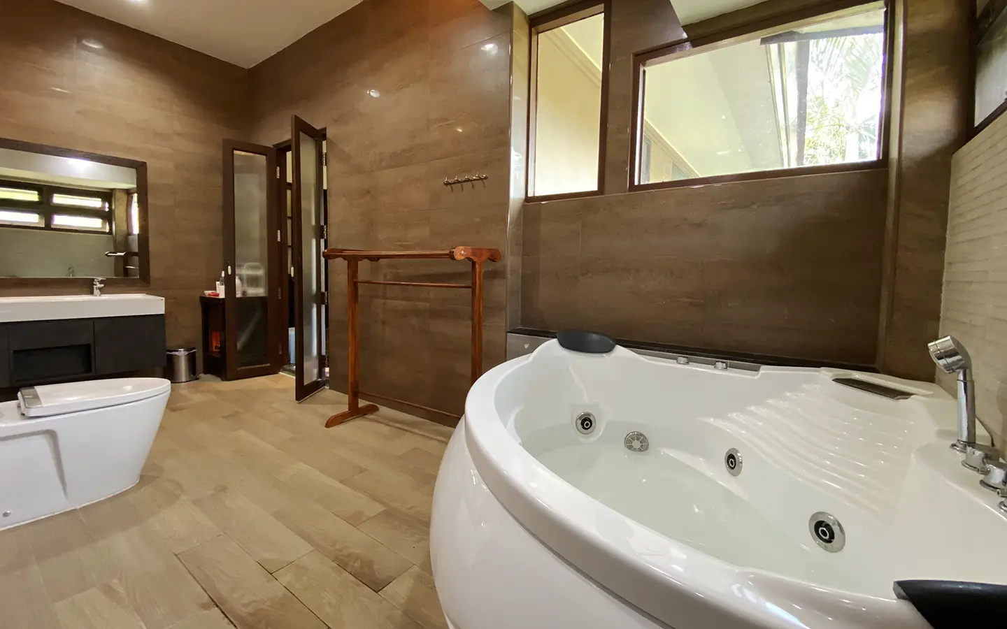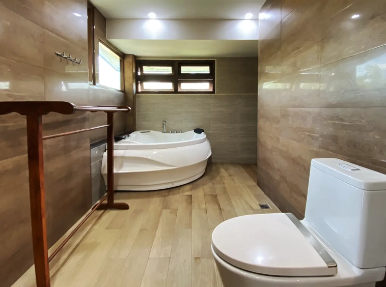 Outside, the beautiful swimming pool is a 4mx8m semi L-shape overlooking the lovely garden. There is ample poolside area and also a separate sauna room and a guest bathroom.