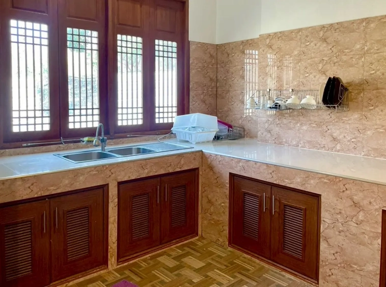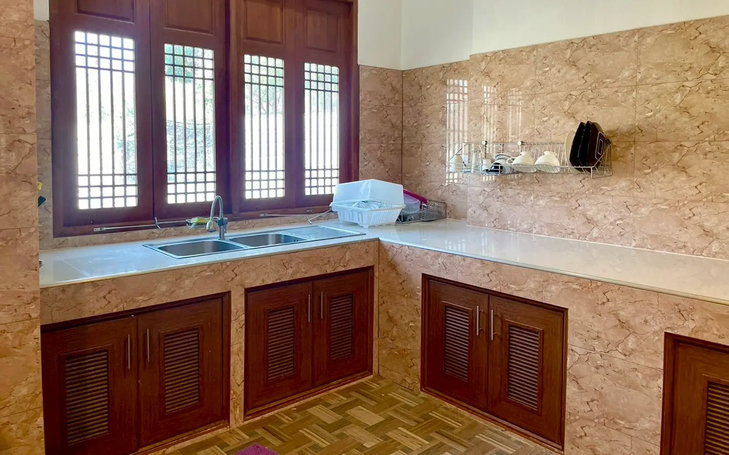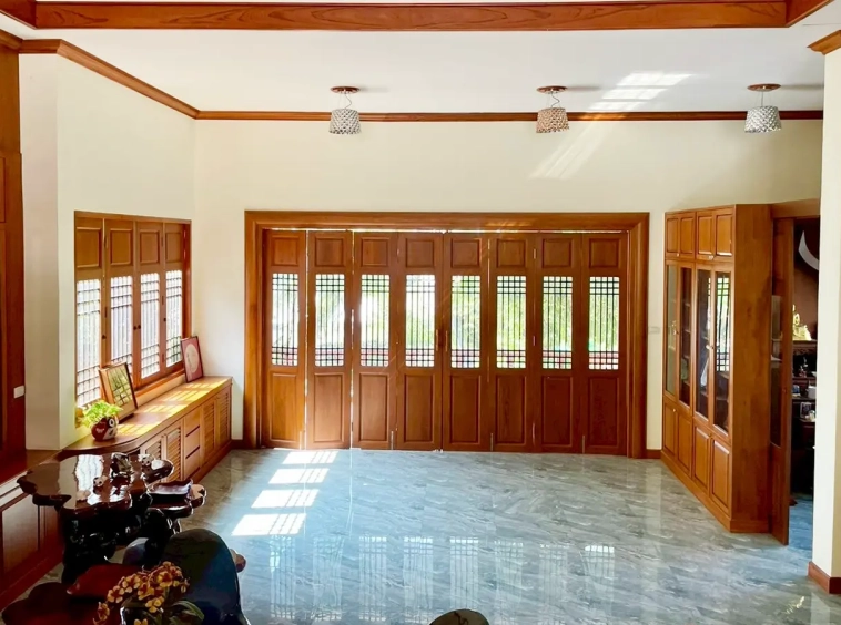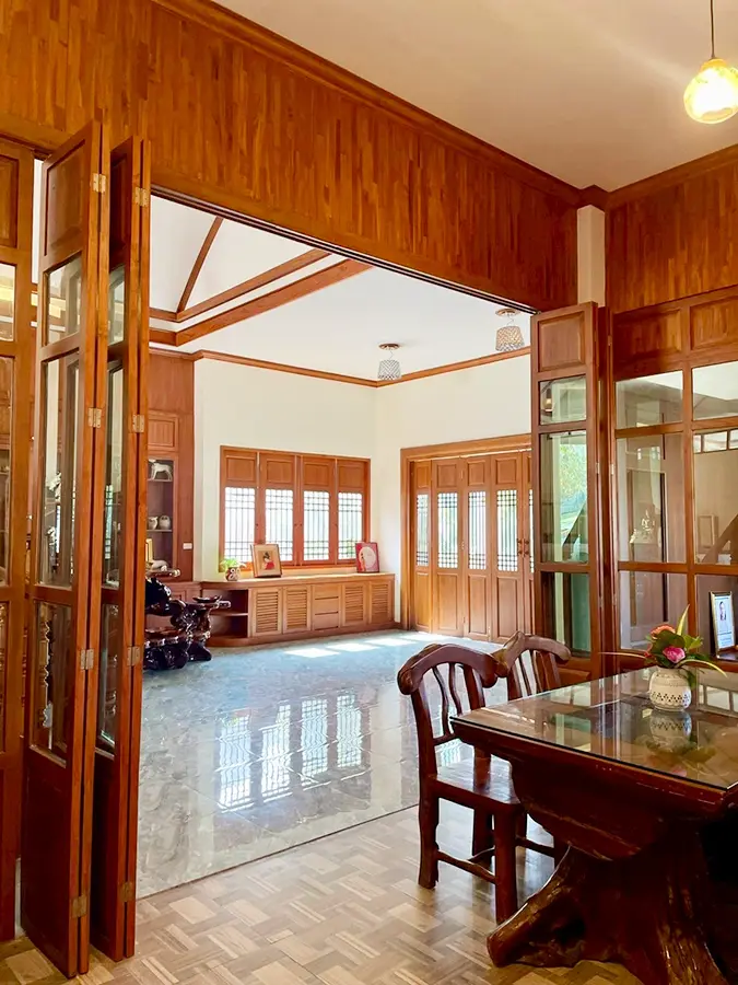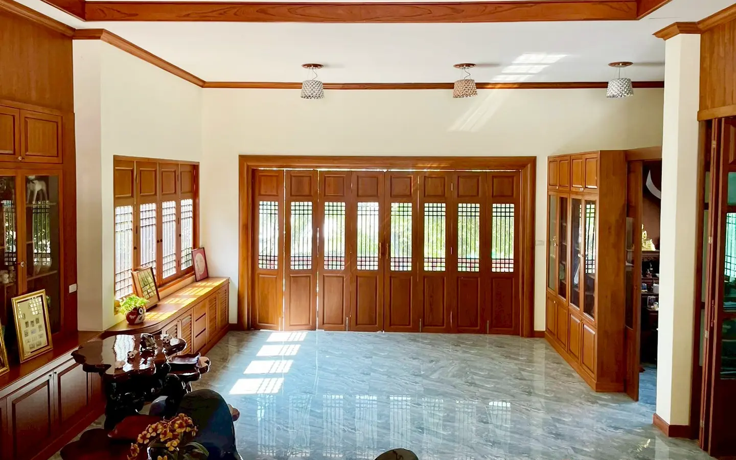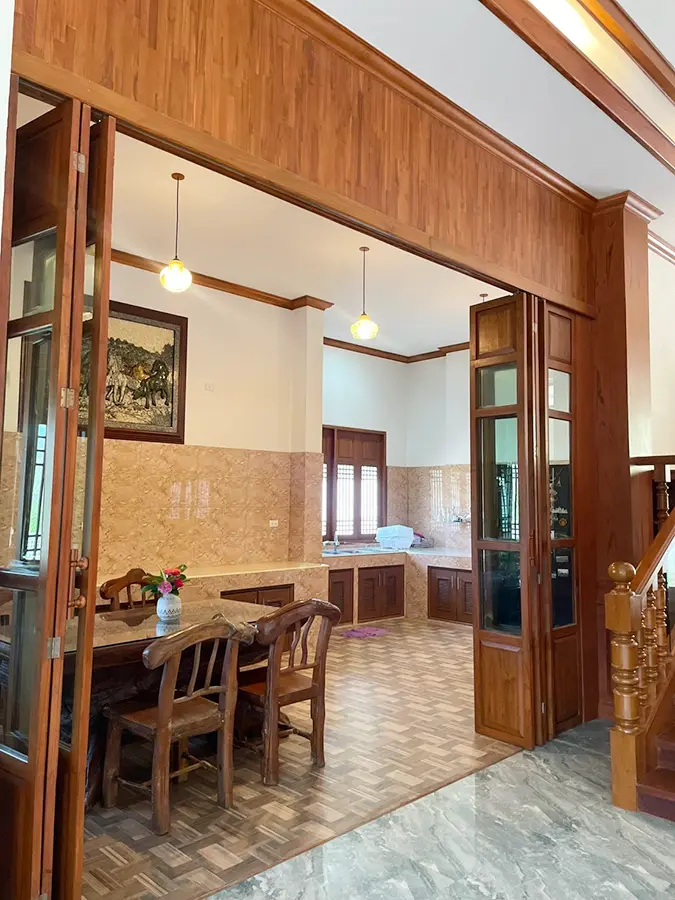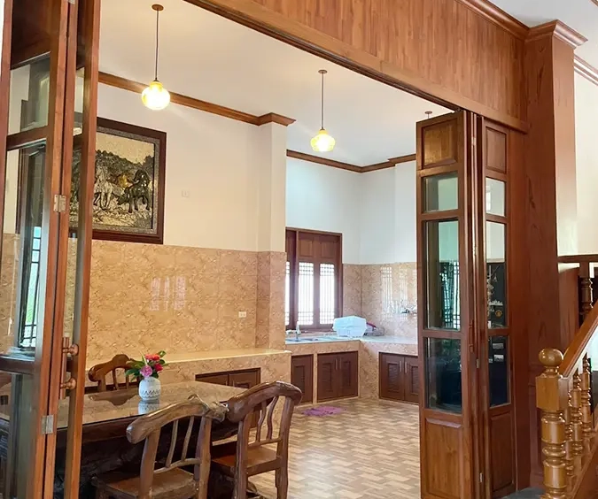 Entering through the front door, you are welcomed into a bright living room featuring a high, uniquely designed ceiling. To the right are a guest bathroom and a prayer room. A few steps down from the living area is another level that includes the dining room and a large kitchen with abundant natural light. All windows, doors, and cabinets are custom-made from teakwood.