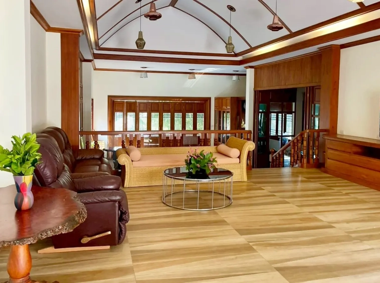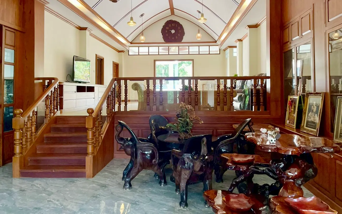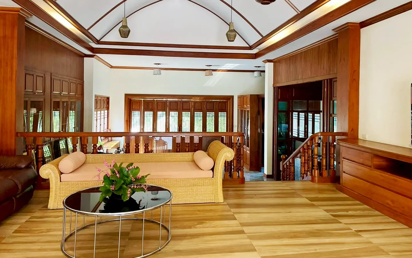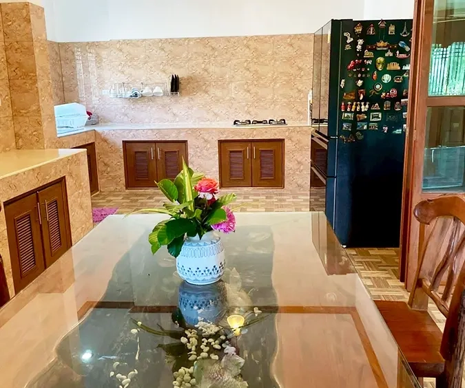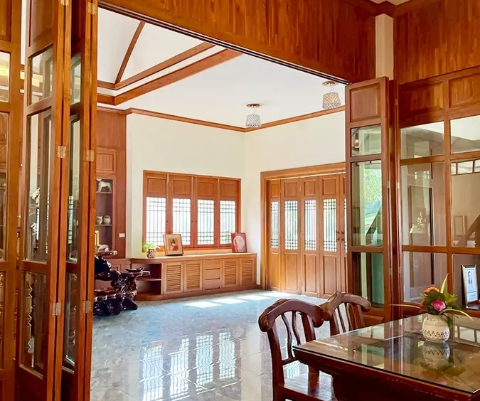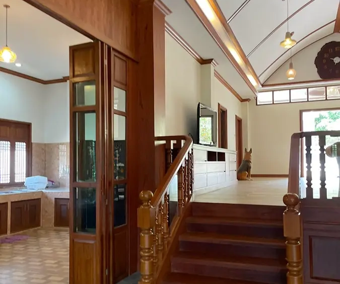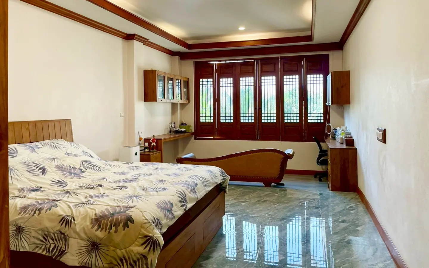 Entering through the front door, you are welcomed into a bright living room featuring a high, uniquely designed ceiling. To the right are a guest bathroom and a prayer room. A few steps down from the living area is another level that includes the dining room and a large kitchen with abundant natural light. All windows, doors, and cabinets are custom-made from teakwood.
