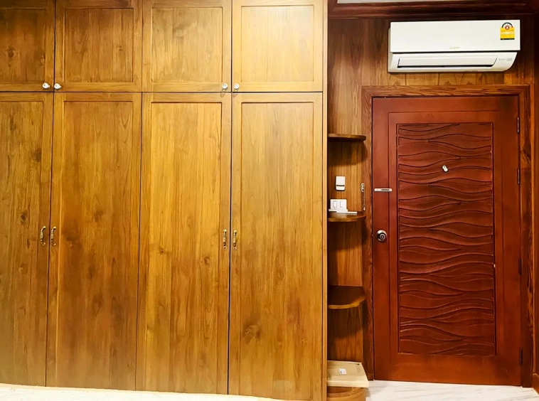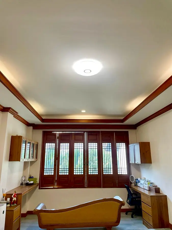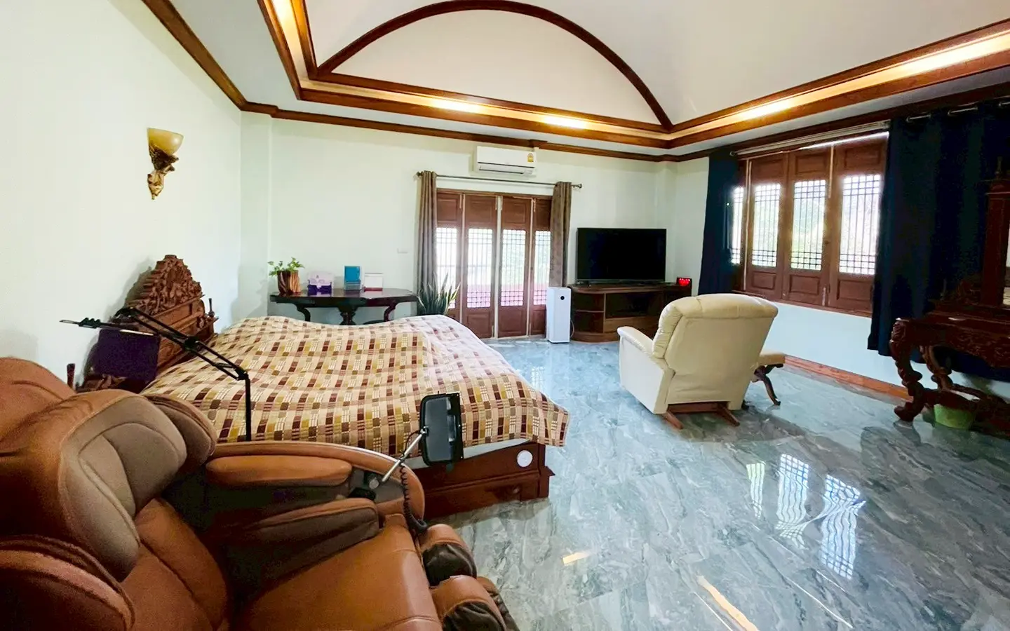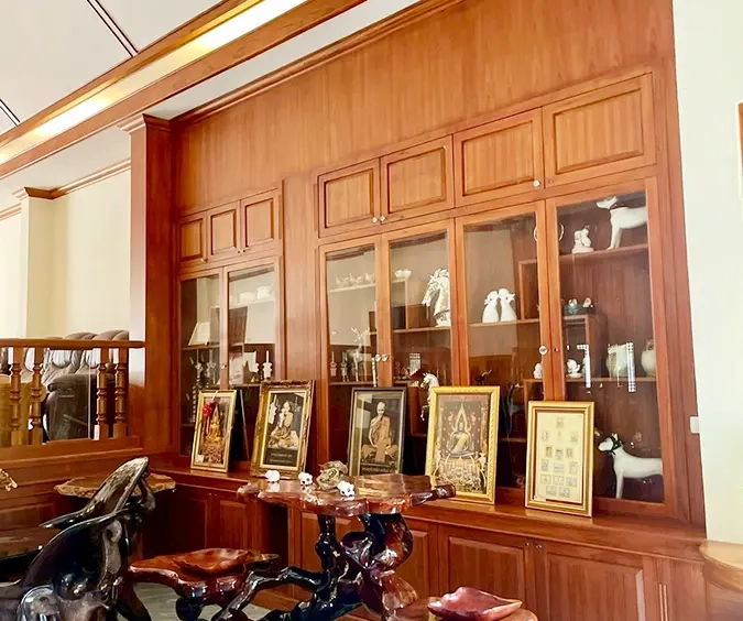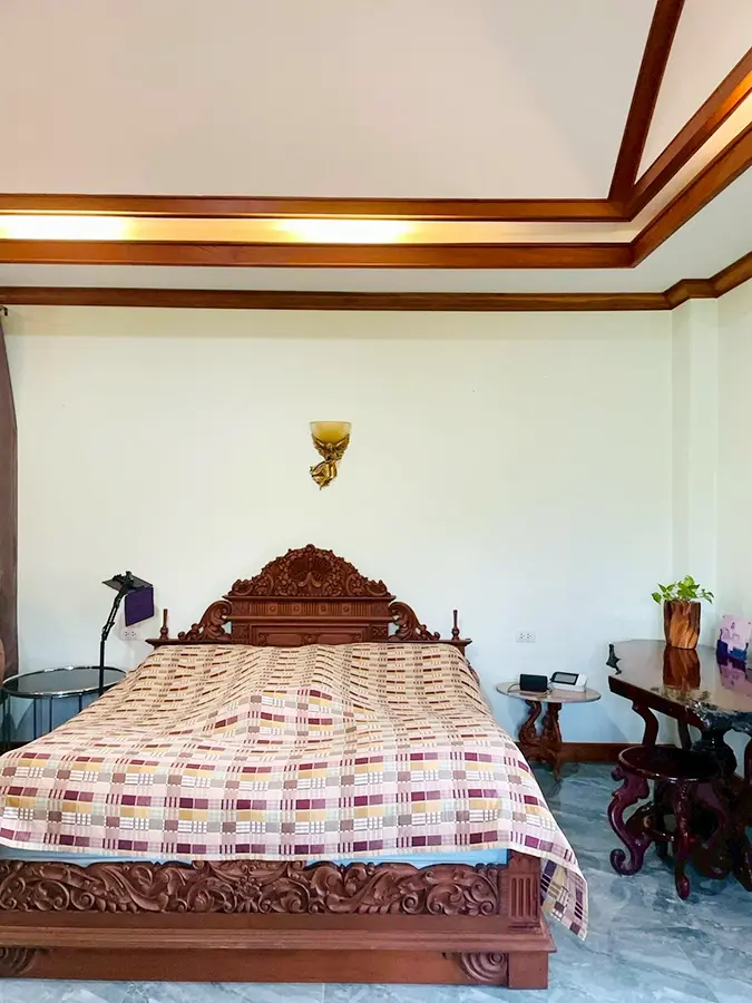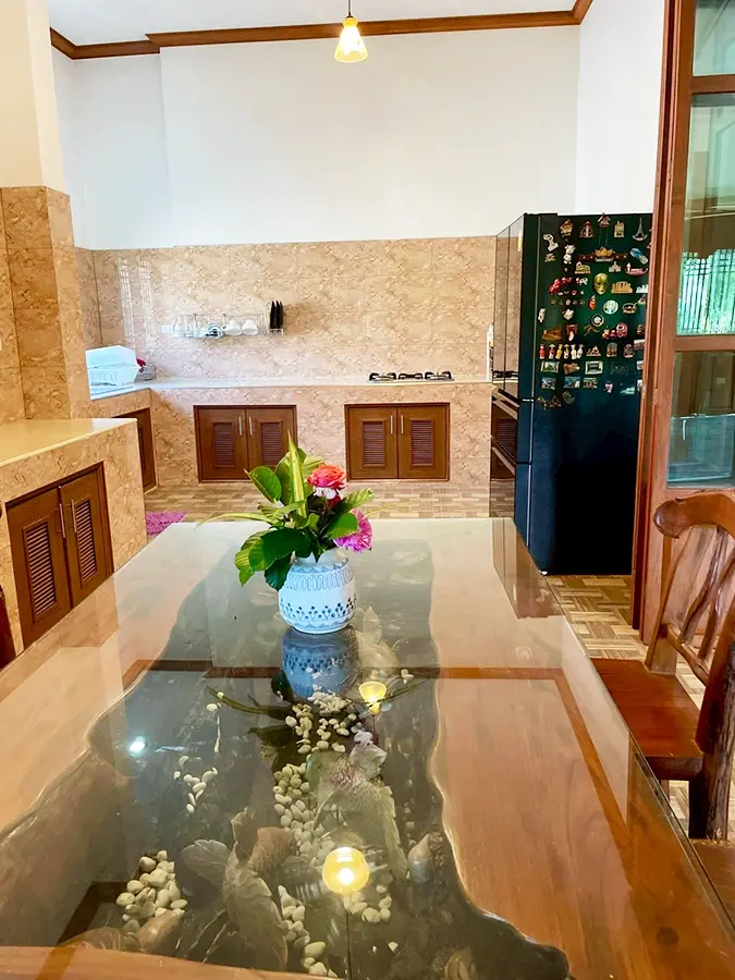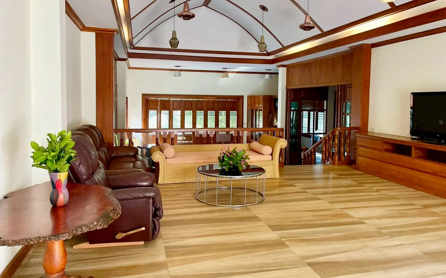 Entering through the front door, you are welcomed into a bright living room featuring a high, uniquely designed ceiling. To the right are a guest bathroom and a prayer room. A few steps down from the living area is another level that includes the dining room and a large kitchen with abundant natural light. All windows, doors, and cabinets are custom-made from teakwood.