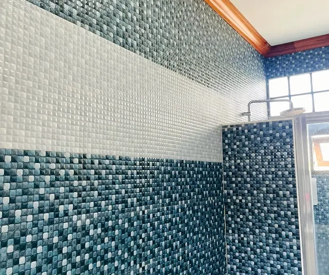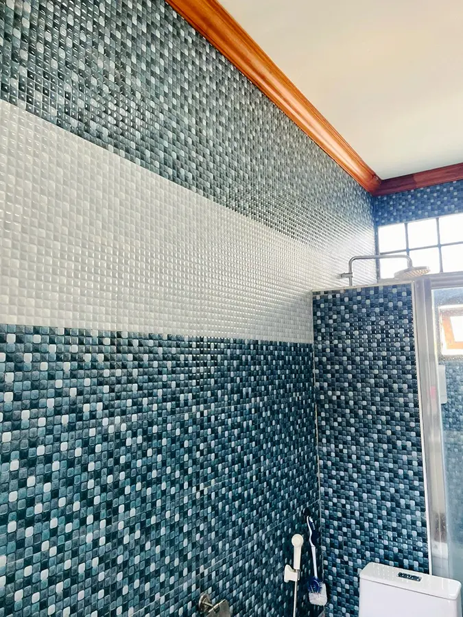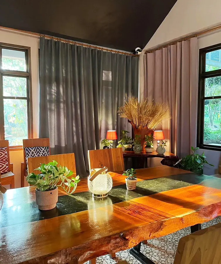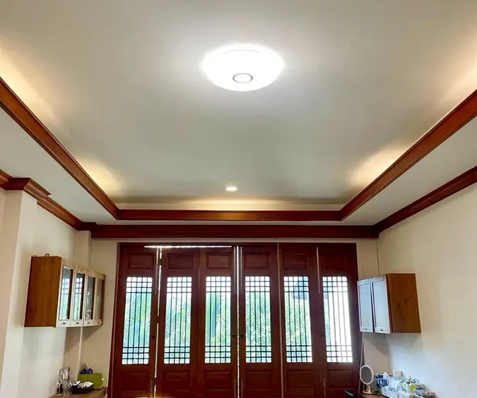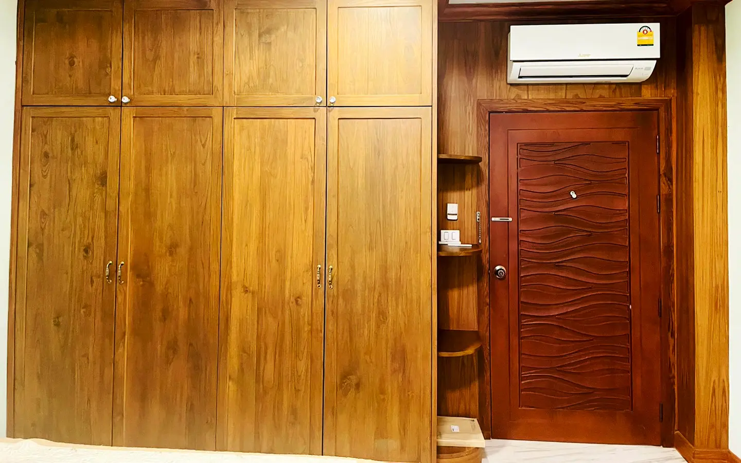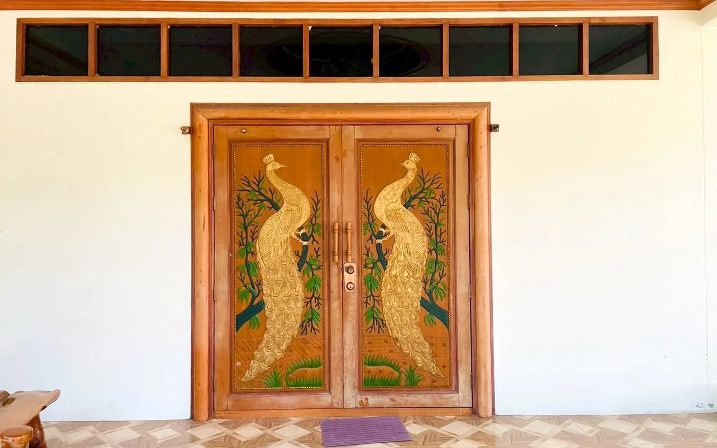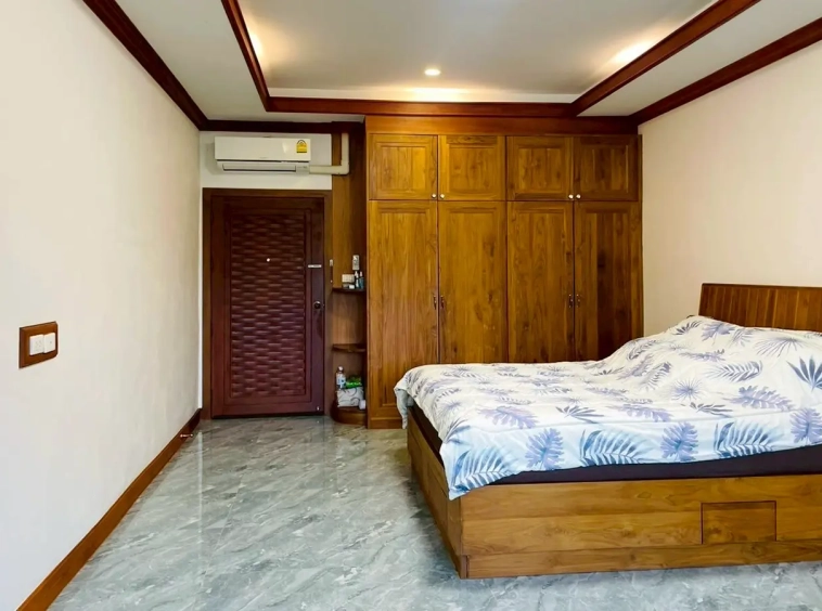 Entering through the front door, you are welcomed into a bright living room featuring a high, uniquely designed ceiling. To the right are a guest bathroom and a prayer room. A few steps down from the living area is another level that includes the dining room and a large kitchen with abundant natural light. All windows, doors, and cabinets are custom-made from teakwood.