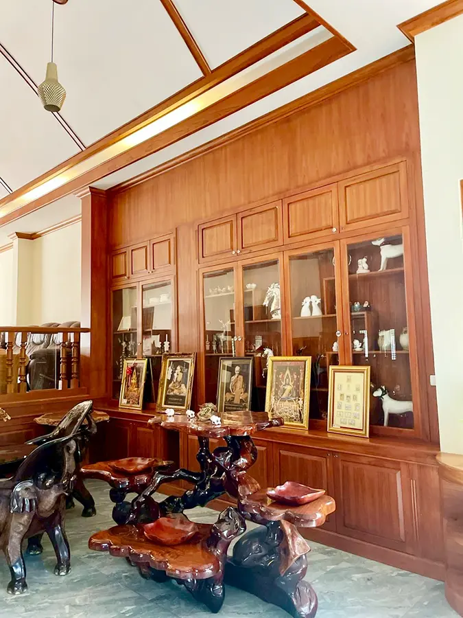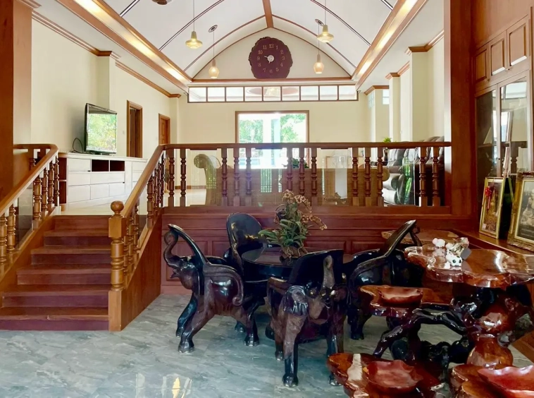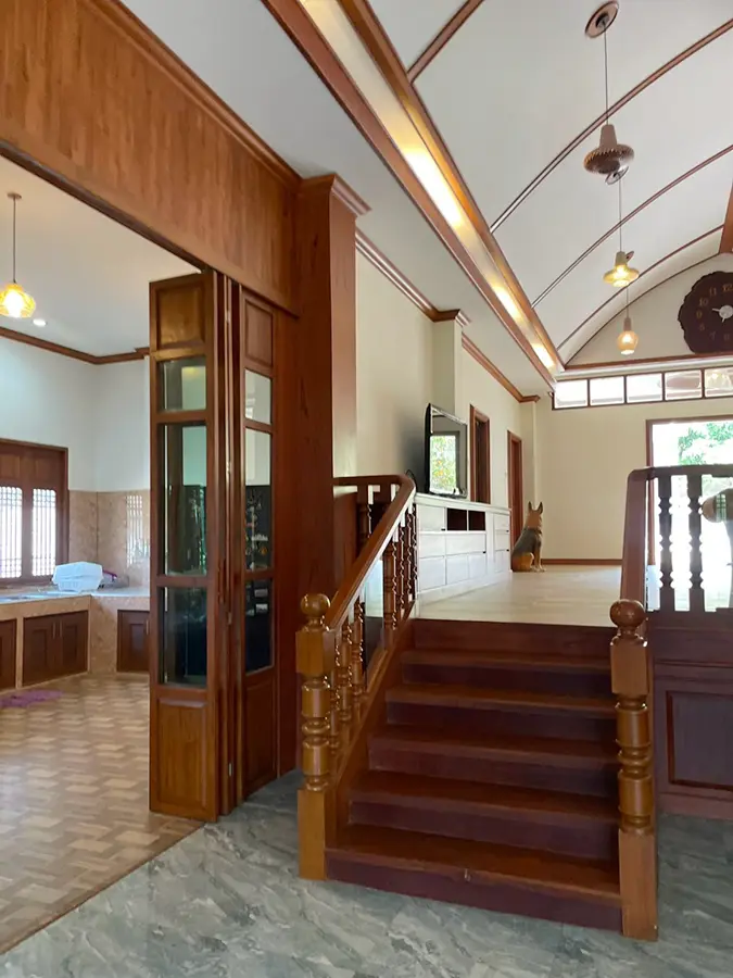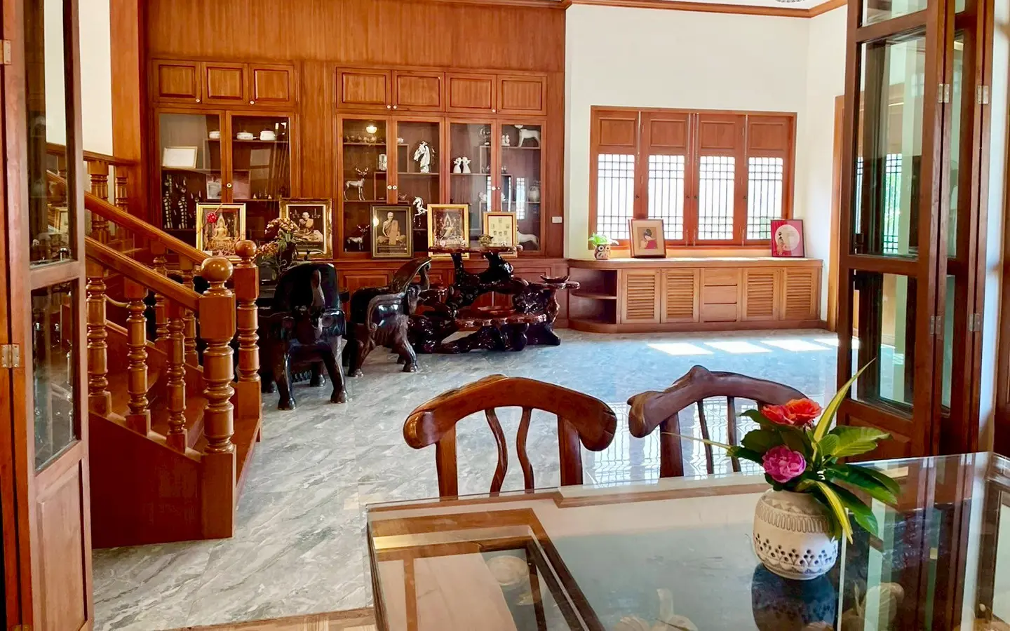 A long driveway leads to a well-built single-storey house located at the rear of the property. The house is beautifully decorated with extensive built-in teakwood furniture, doors, and ceilings.
