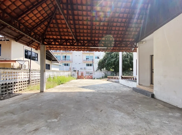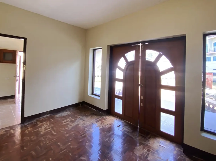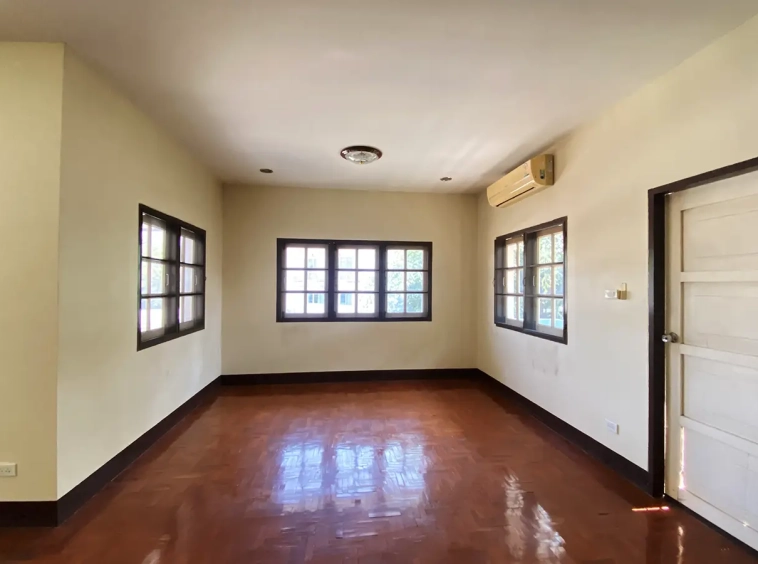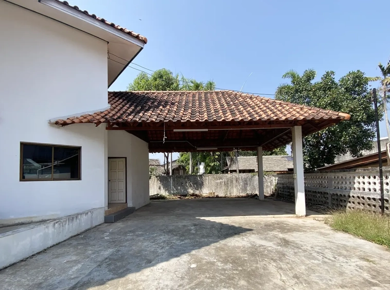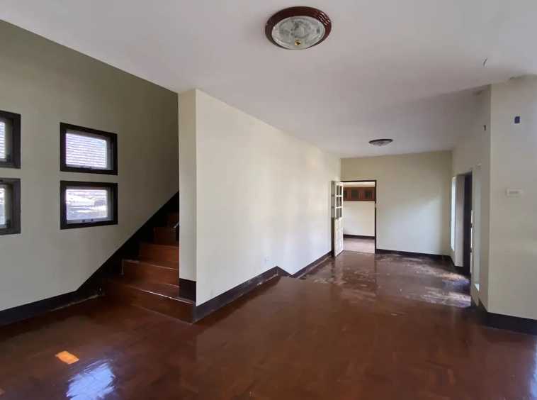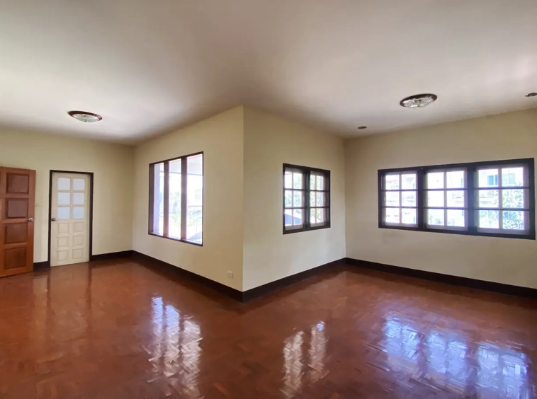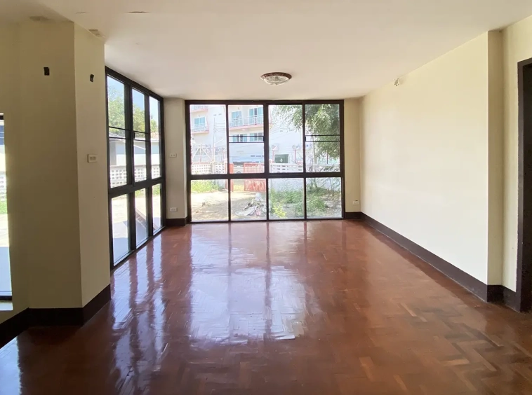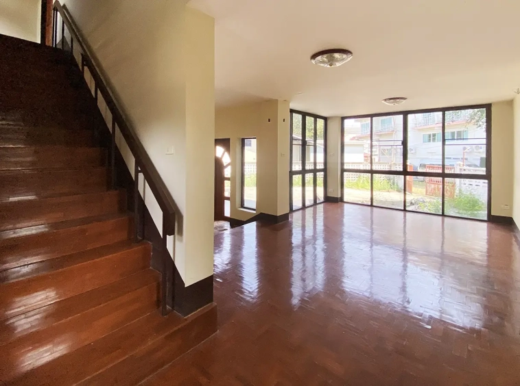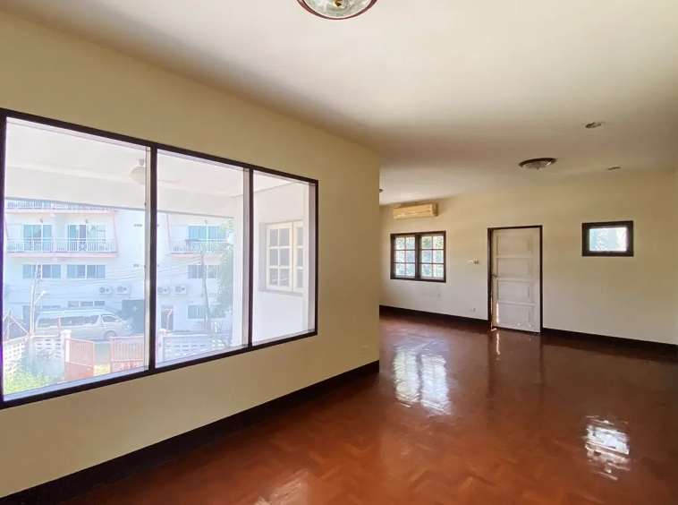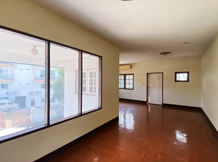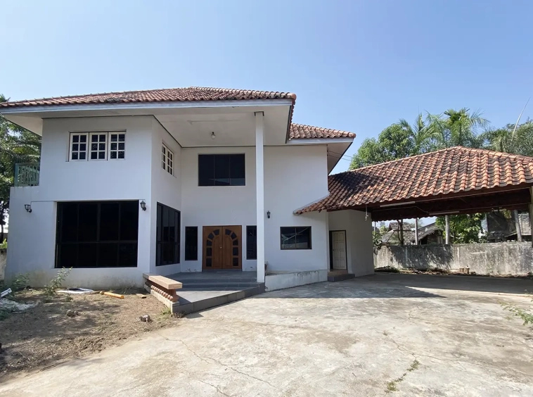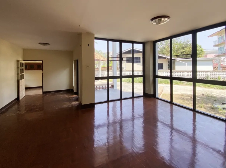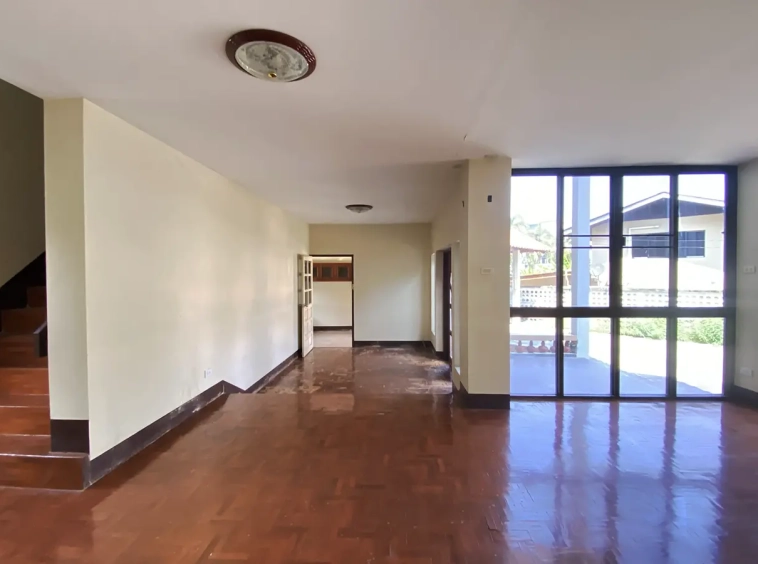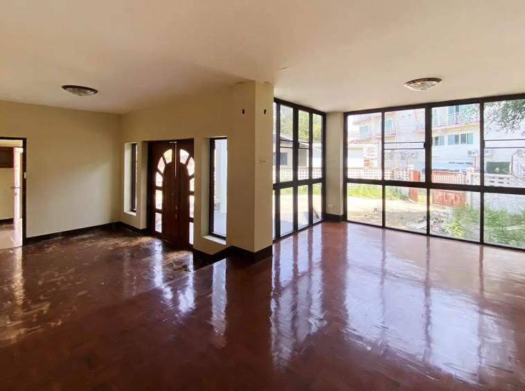 The property has 110 sqw or 440 sqm of land with a cement driveway to the ample covered parking on the side of the house. From the entrance, an open-plan living area with a raised floor and floor-to-ceiling glass walls is visible. There is access to the cellar, which can be used as an extra bedroom, a multipurpose room, or a storage room. The kitchen is to the right, adjacent to the guest bathroom, and also has access to the airport, which also has a storage room attached. The second floor currently features a large main bedroom with a living area, a balcony, and an en-suite bathroom with a bathtub. Wood parquet flooring is throughout the house, except in the bathrooms and kitchen. Plenty of glass doors and windows let in natural light, and the tall ceiling helps with airflow. This house, with its large land size and prime location, offers significant potential for investment.