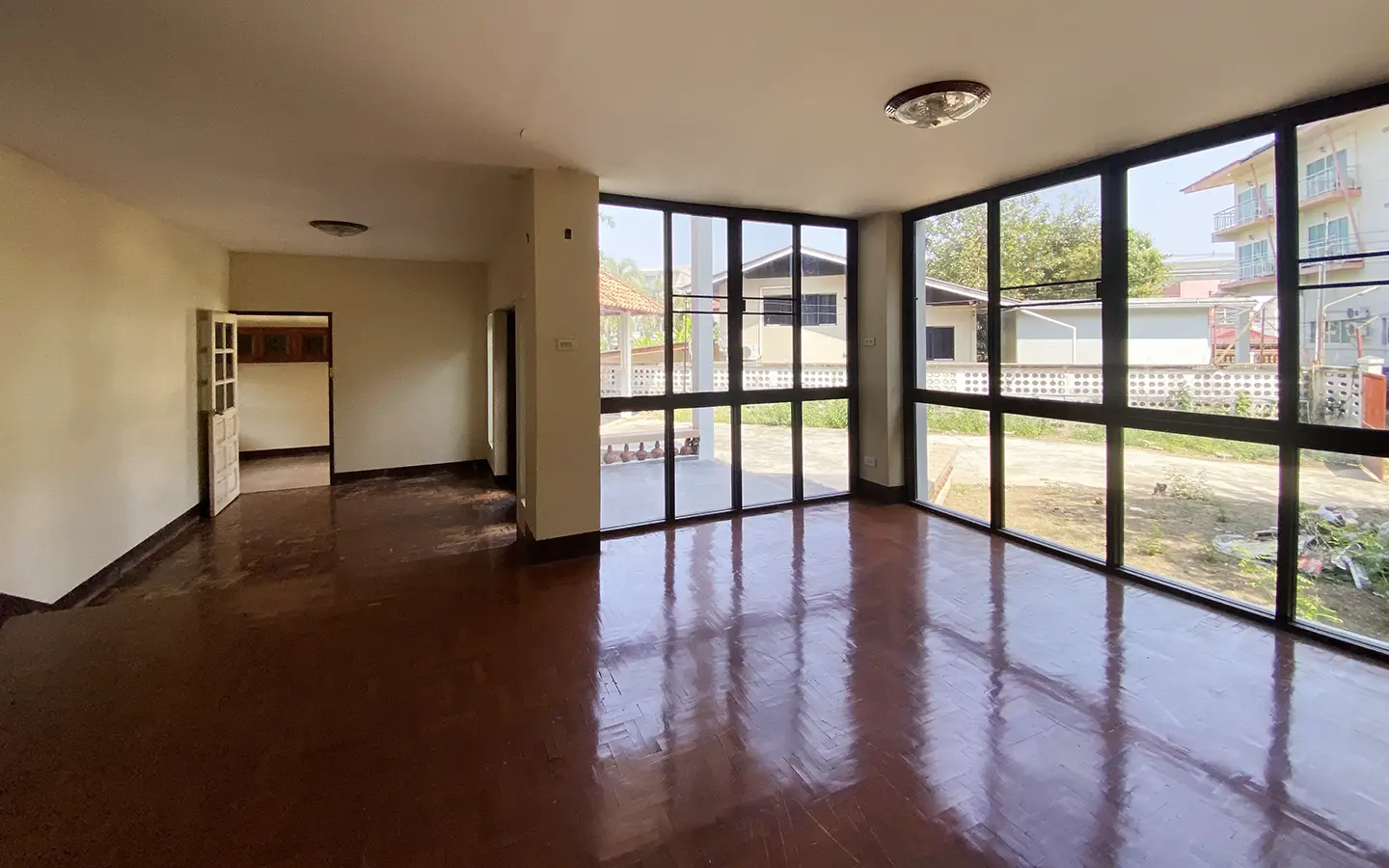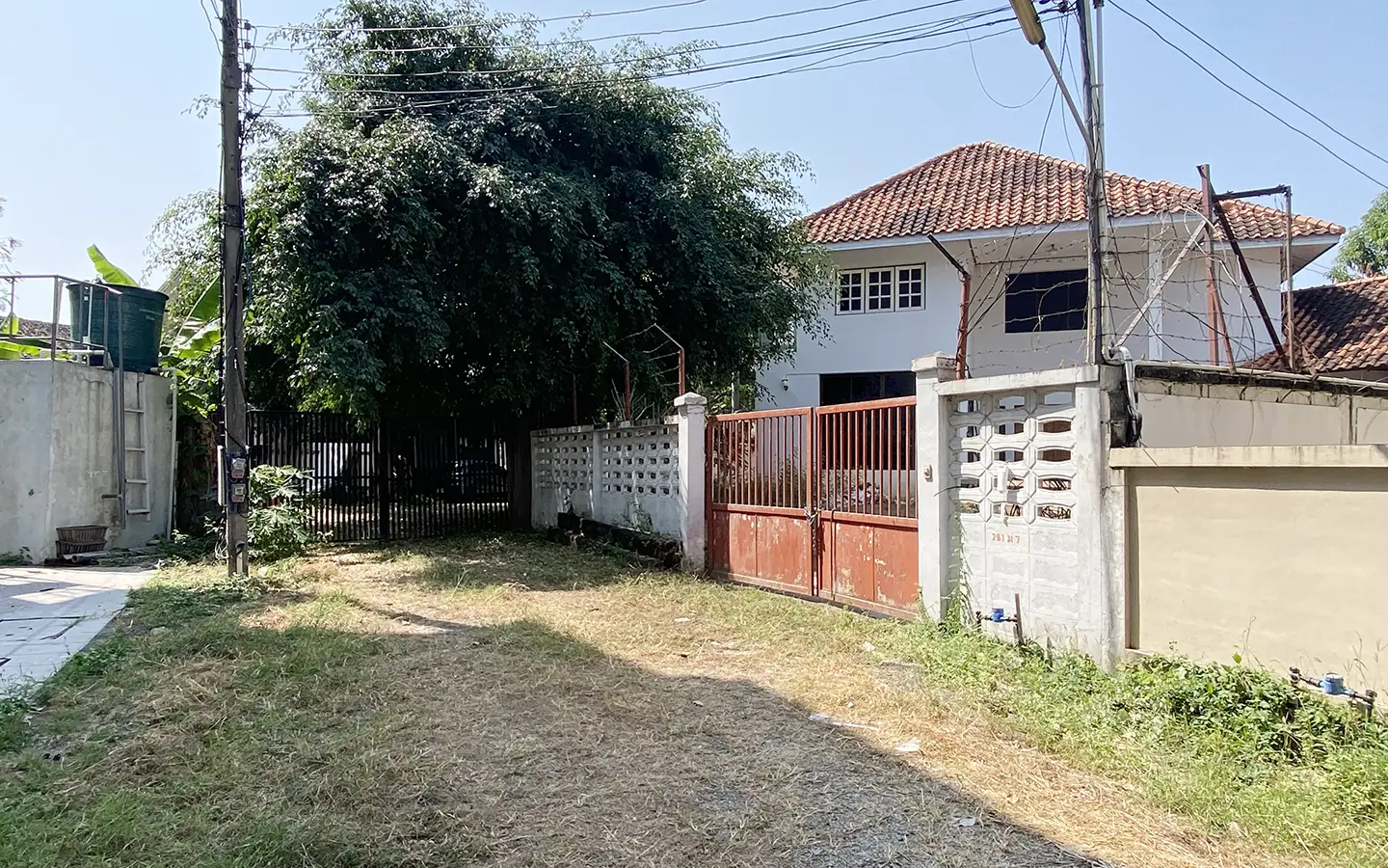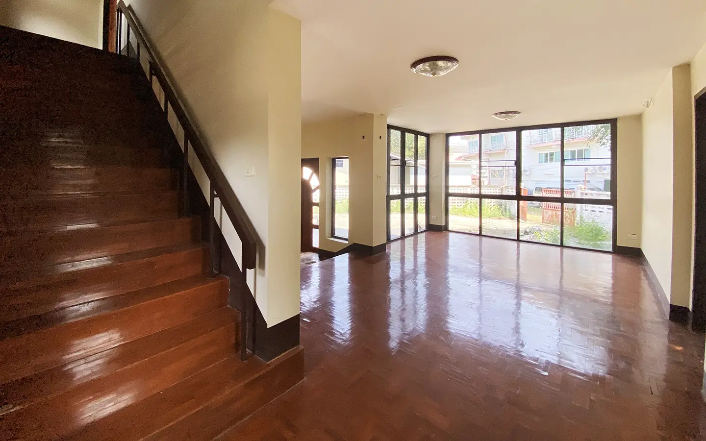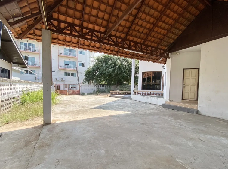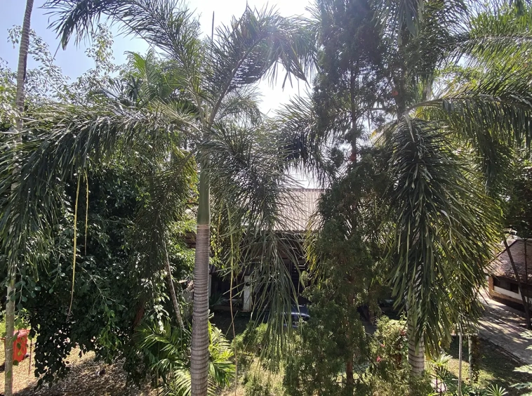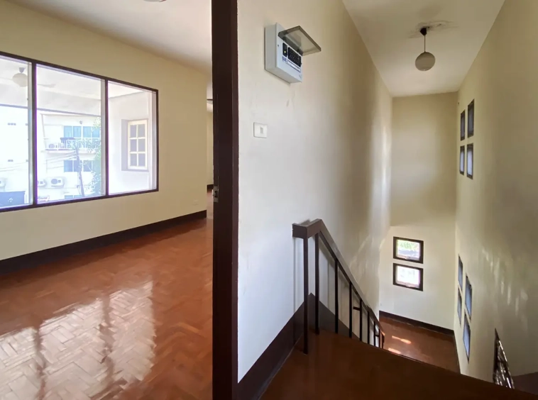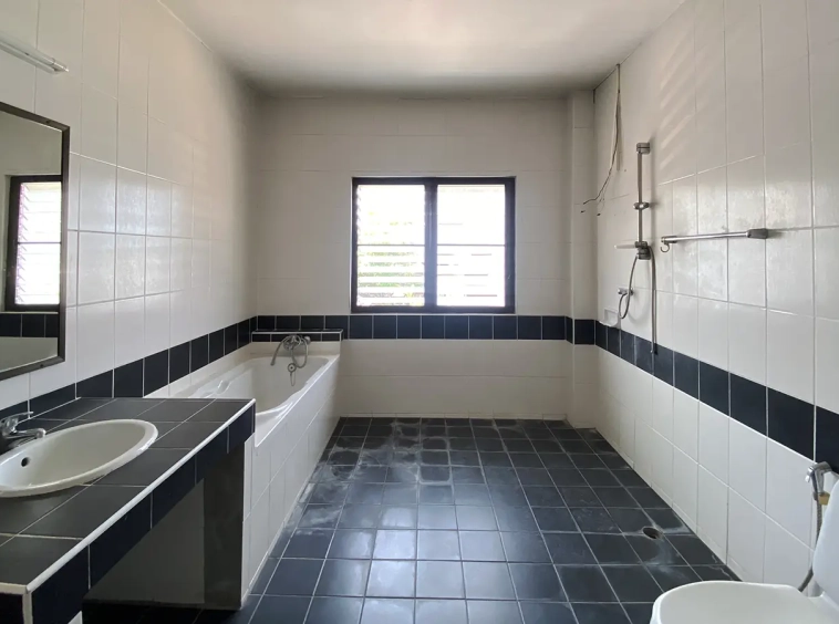 The property has 110 sqw or 440 sqm of land with a cement driveway to the ample covered parking on the side of the house. From the entrance, an open-plan living area with a raised floor and floor-to-ceiling glass walls is visible. There is access to the cellar, which can be used as an extra bedroom, a multipurpose room, or a storage room. The kitchen is to the right, adjacent to the guest bathroom, and also has access to the airport, which also has a storage room attached. The second floor currently features a large main bedroom with a living area, a balcony, and an en-suite bathroom with a bathtub. Wood parquet flooring is throughout the house, except in the bathrooms and kitchen. Plenty of glass doors and windows let in natural light, and the tall ceiling helps with airflow. This house, with its large land size and prime location, offers significant potential for investment.