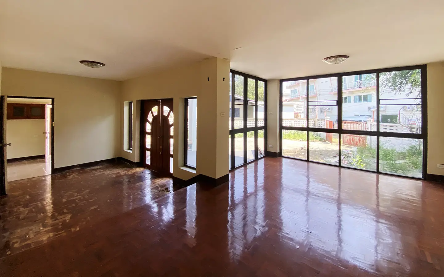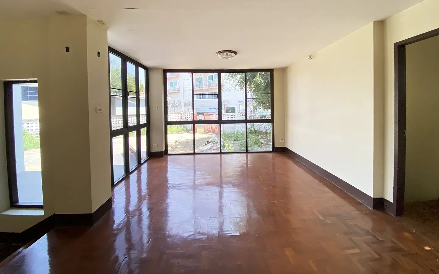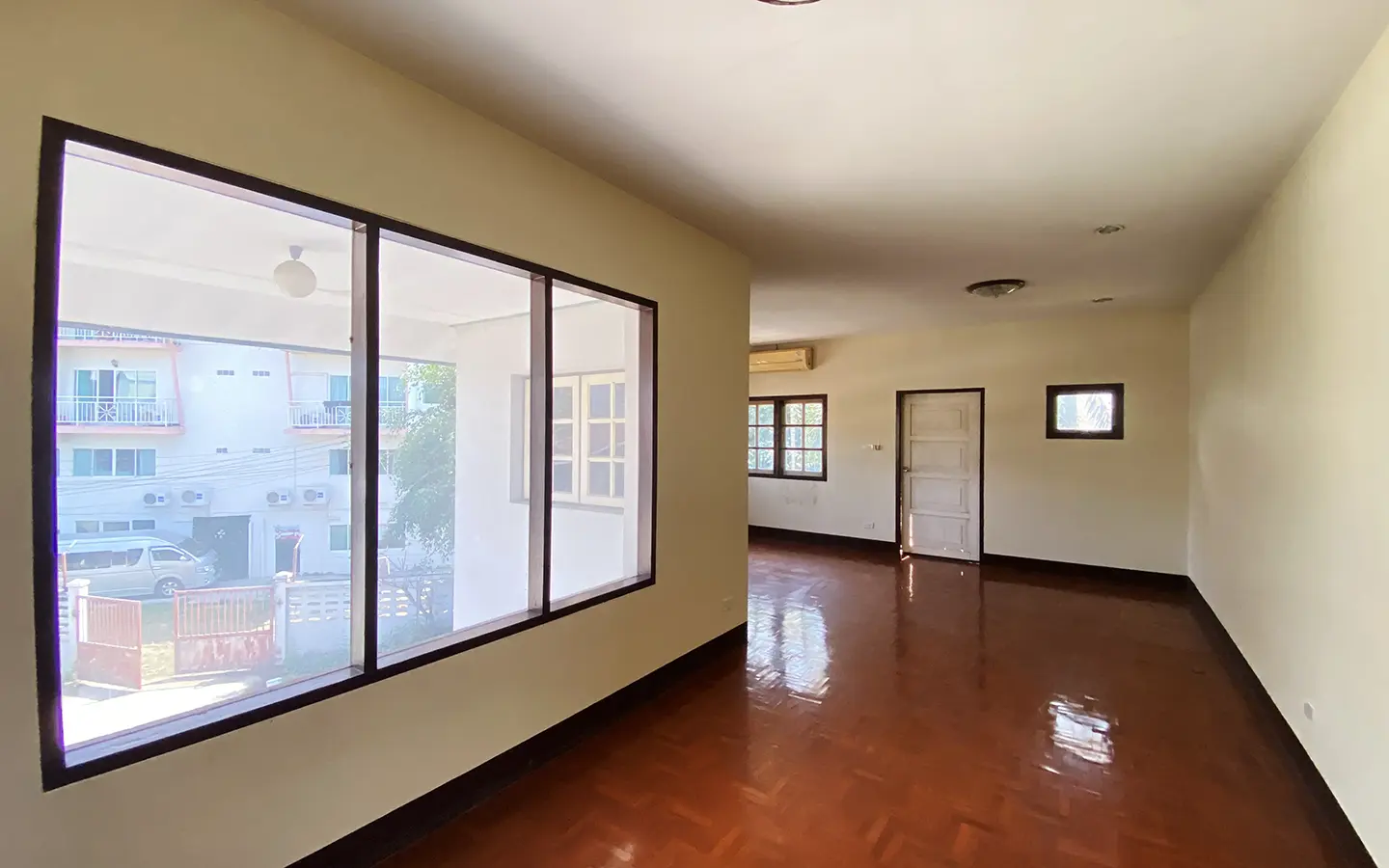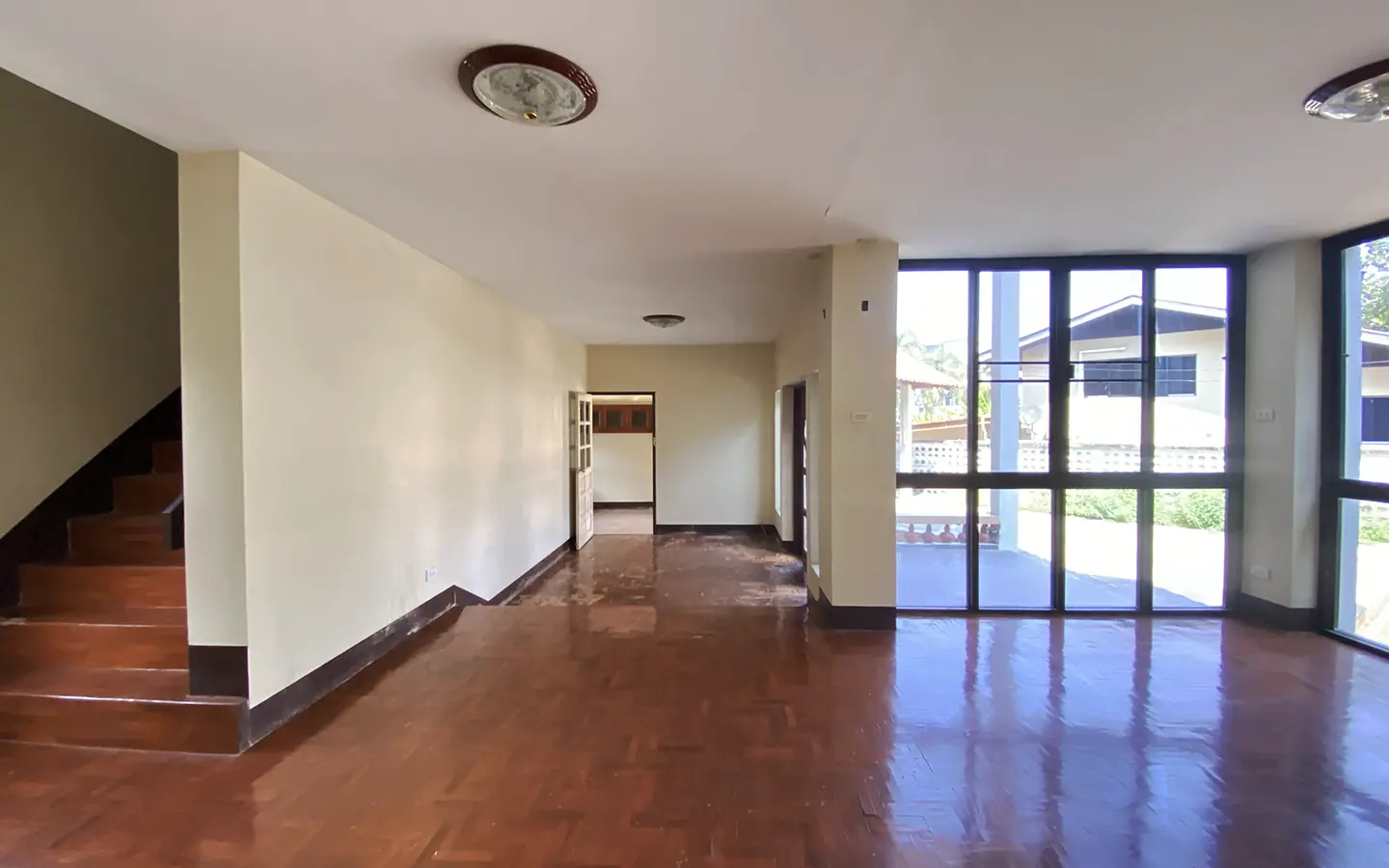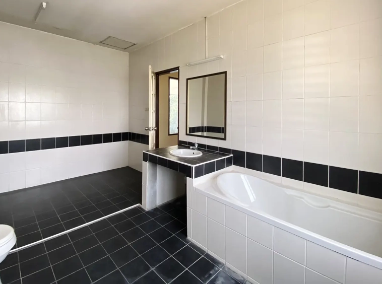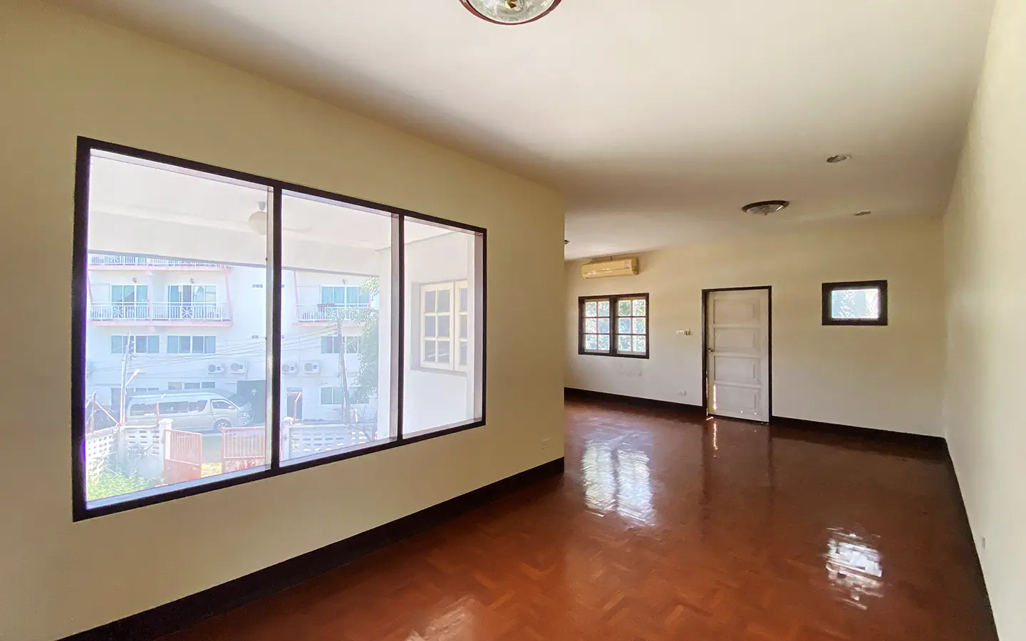 The property has 110 sqw or 440 sqm of land with a cement driveway to the ample covered parking on the side of the house. From the entrance, an open-plan living area with a raised floor and floor-to-ceiling glass walls is visible. There is access to the cellar, which can be used as an extra bedroom, a multipurpose room, or a storage room. The kitchen is to the right, adjacent to the guest bathroom, and also has access to the airport, which also has a storage room attached. The second floor currently features a large main bedroom with a living area, a balcony, and an en-suite bathroom with a bathtub. Wood parquet flooring is throughout the house, except in the bathrooms and kitchen. Plenty of glass doors and windows let in natural light, and the tall ceiling helps with airflow. This house, with its large land size and prime location, offers significant potential for investment.