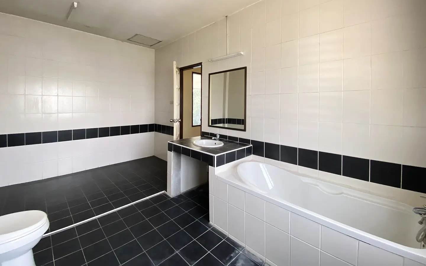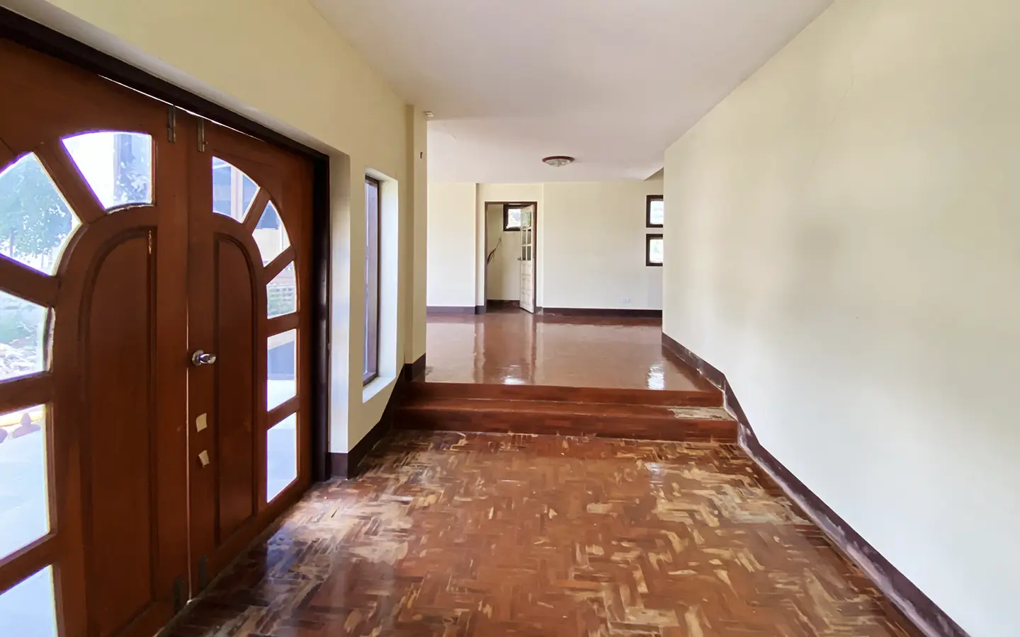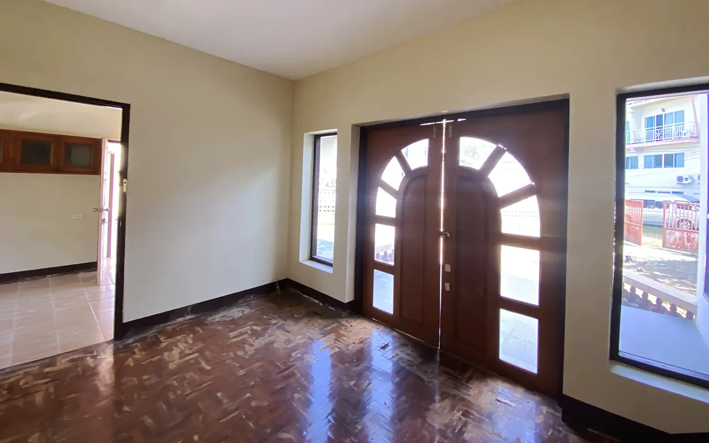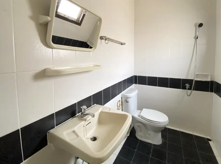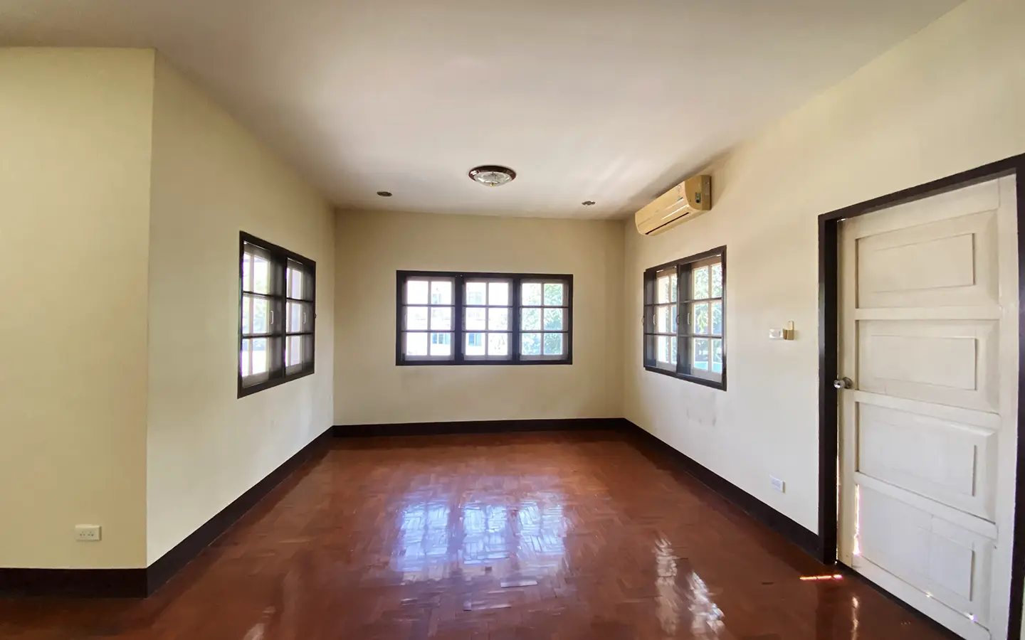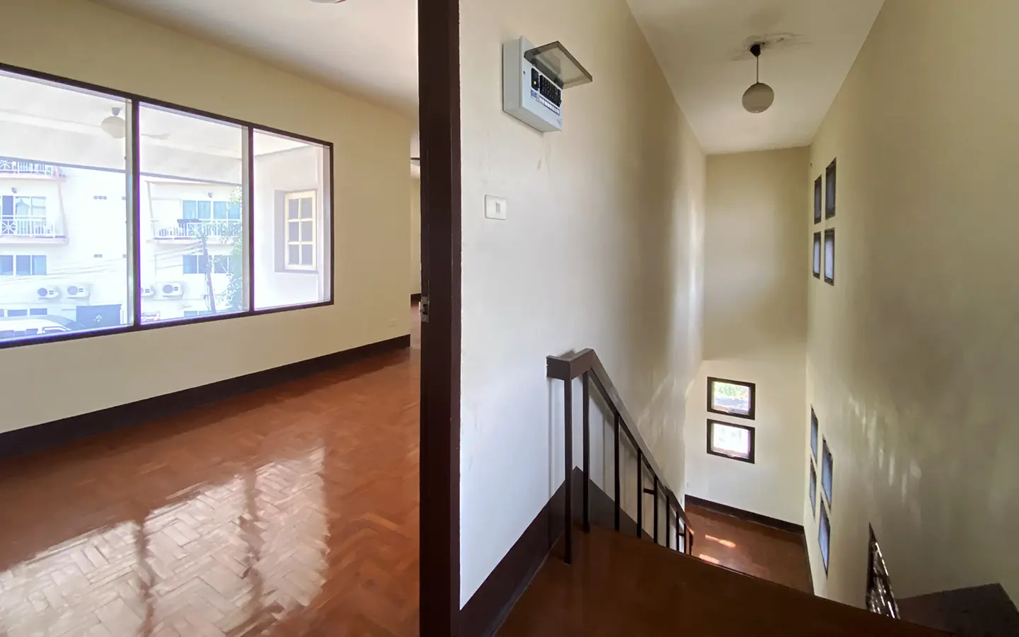 The property has 110 sqw or 440 sqm of land with a cement driveway to the ample covered parking on the side of the house. From the entrance, an open-plan living area with a raised floor and floor-to-ceiling glass walls is visible. There is access to the cellar, which can be used as an extra bedroom, a multipurpose room, or a storage room. The kitchen is to the right, adjacent to the guest bathroom, and also has access to the airport, which also has a storage room attached. The second floor currently features a large main bedroom with a living area, a balcony, and an en-suite bathroom with a bathtub. Wood parquet flooring is throughout the house, except in the bathrooms and kitchen. Plenty of glass doors and windows let in natural light, and the tall ceiling helps with airflow. This house, with its large land size and prime location, offers significant potential for investment.