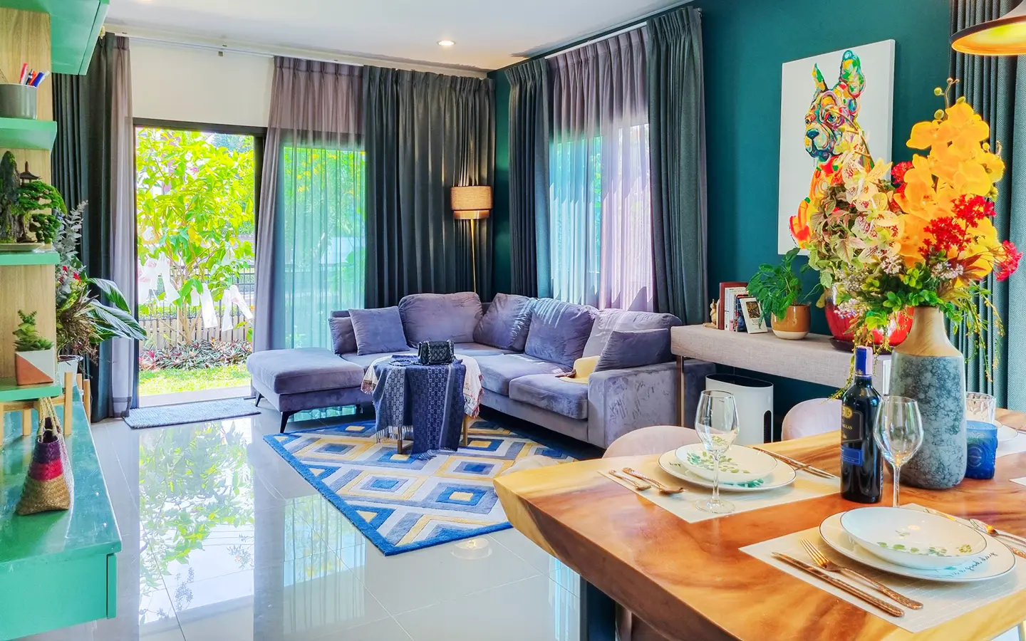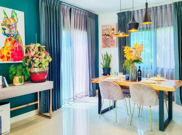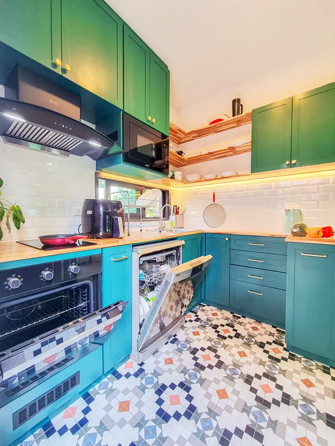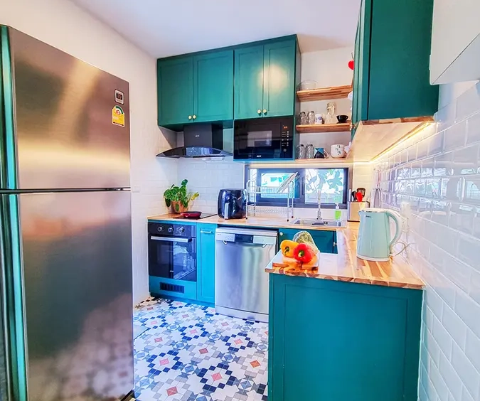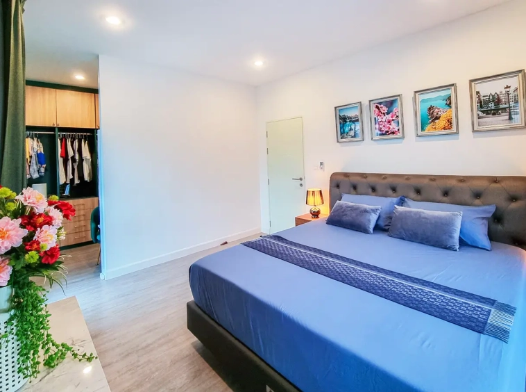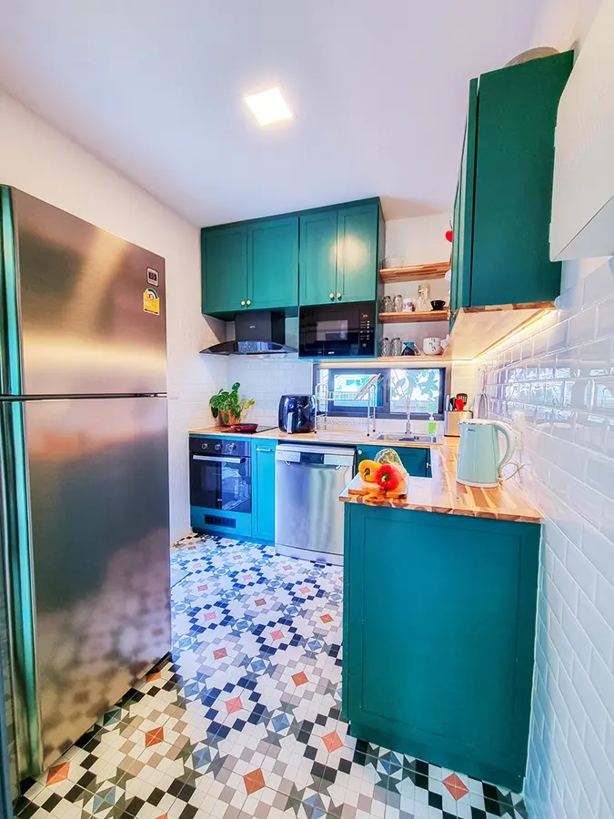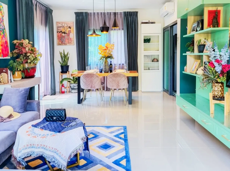 The property sits on a decent-sized plot of land with a cute garden that has fruit trees to provide shade during the day. Inside, there is an open-plan living/dining area with a built-in wall unit and gorgeous floor-to-ceiling curtains. The adjacent Western kitchen is separated by sliding glass doors and comes complete with a built-in oven and dishwasher. The downstairs bathroom comes with a shower and a separate corner for the washing machine. Beautiful and smartly decorated throughout.