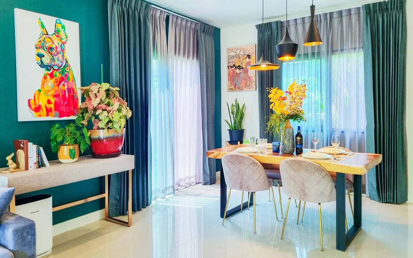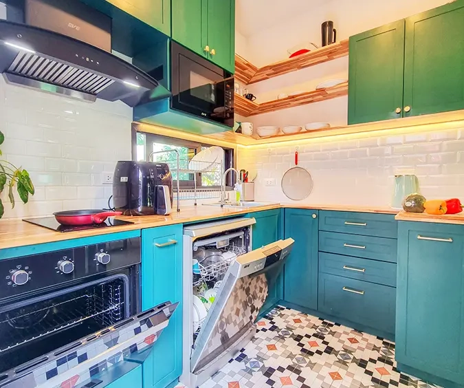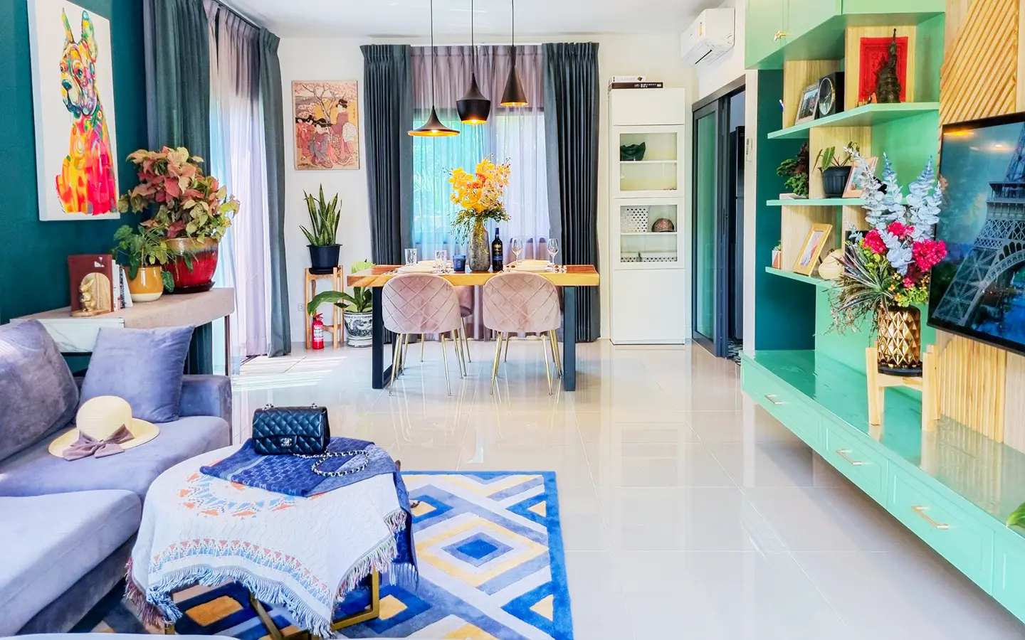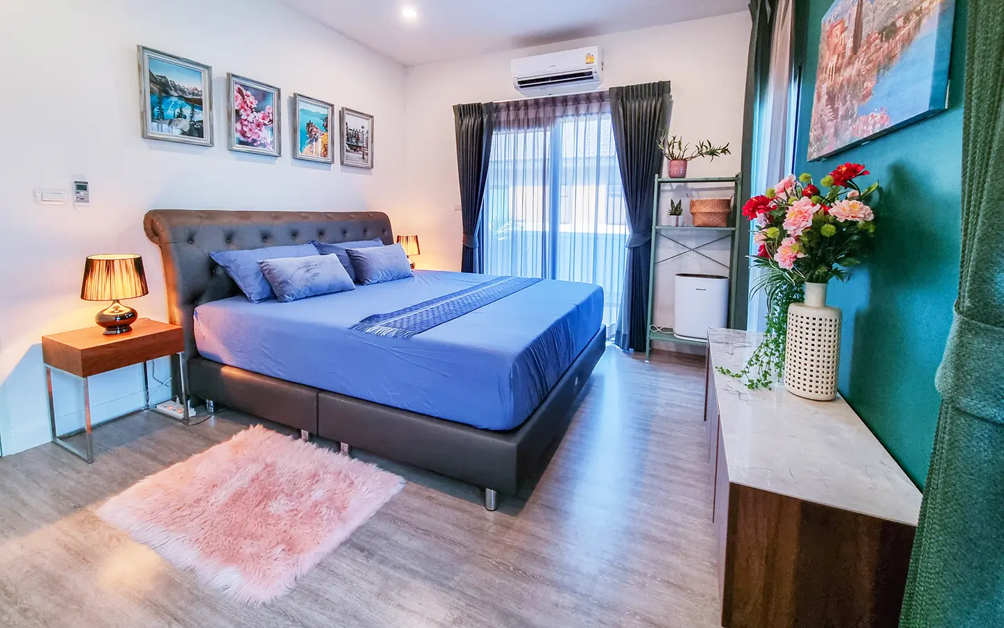 The property sits on a decent-sized plot of land with a cute garden that has fruit trees to provide shade during the day. Inside, there is an open-plan living/dining area with a built-in wall unit and gorgeous floor-to-ceiling curtains. The adjacent Western kitchen is separated by sliding glass doors and comes complete with a built-in oven and dishwasher. The downstairs bathroom comes with a shower and a separate corner for the washing machine. Beautiful and smartly decorated throughout.