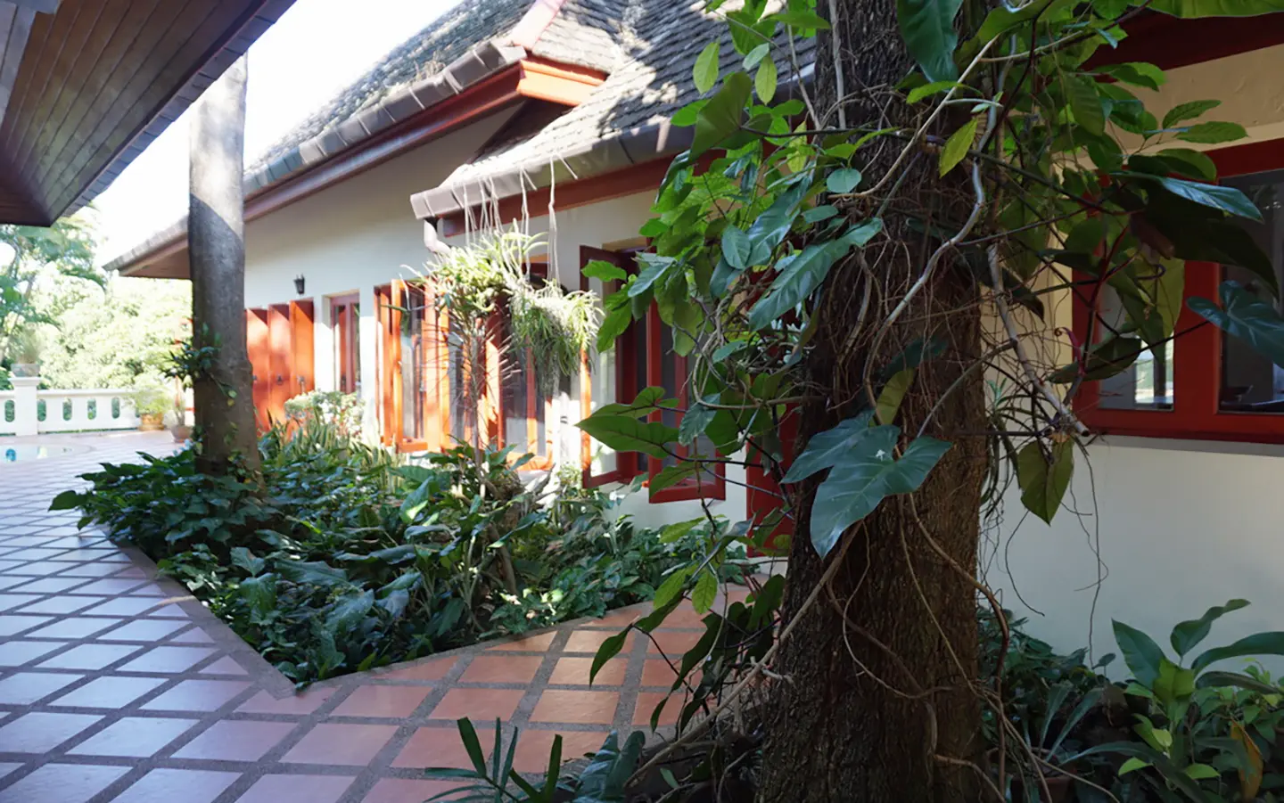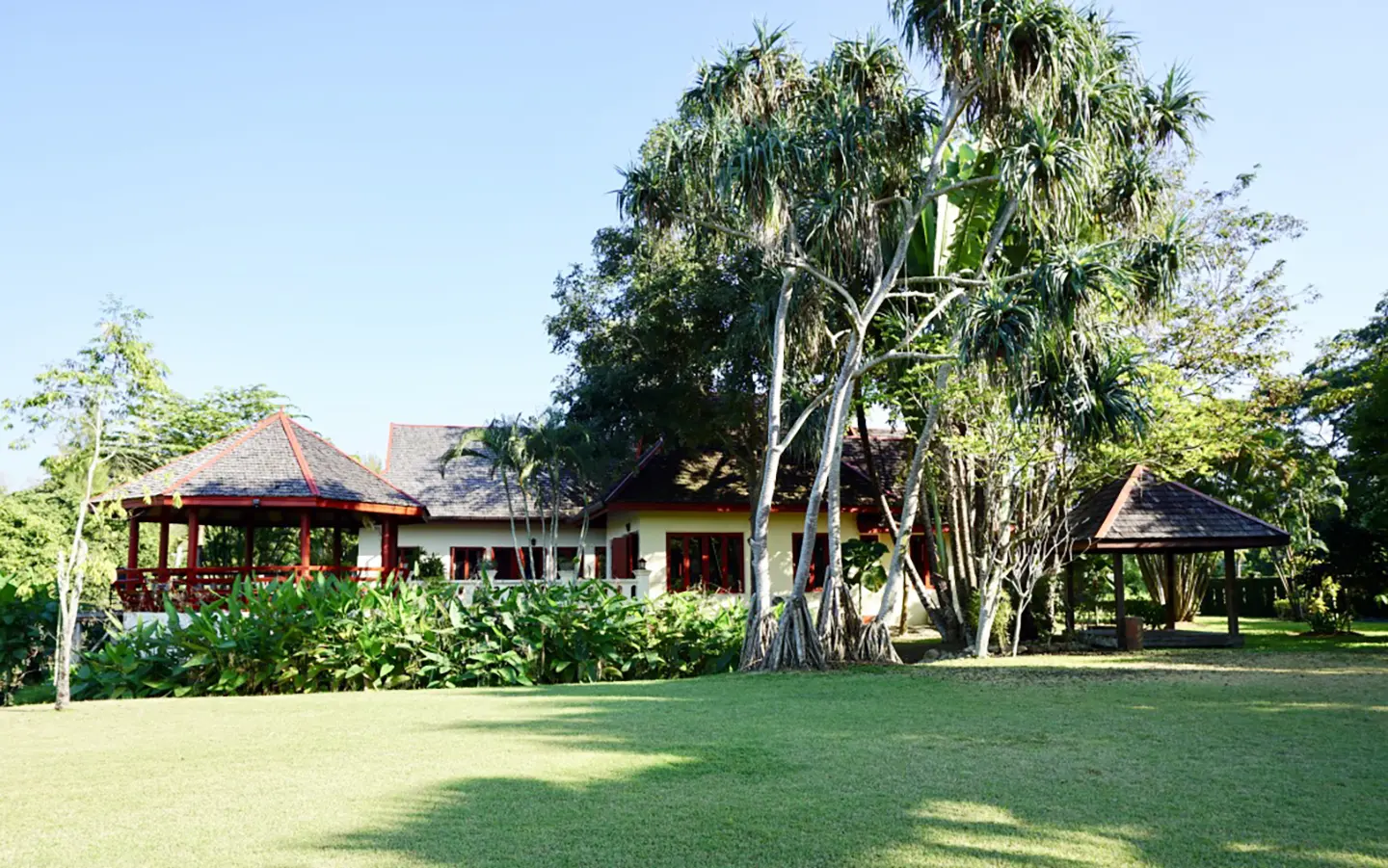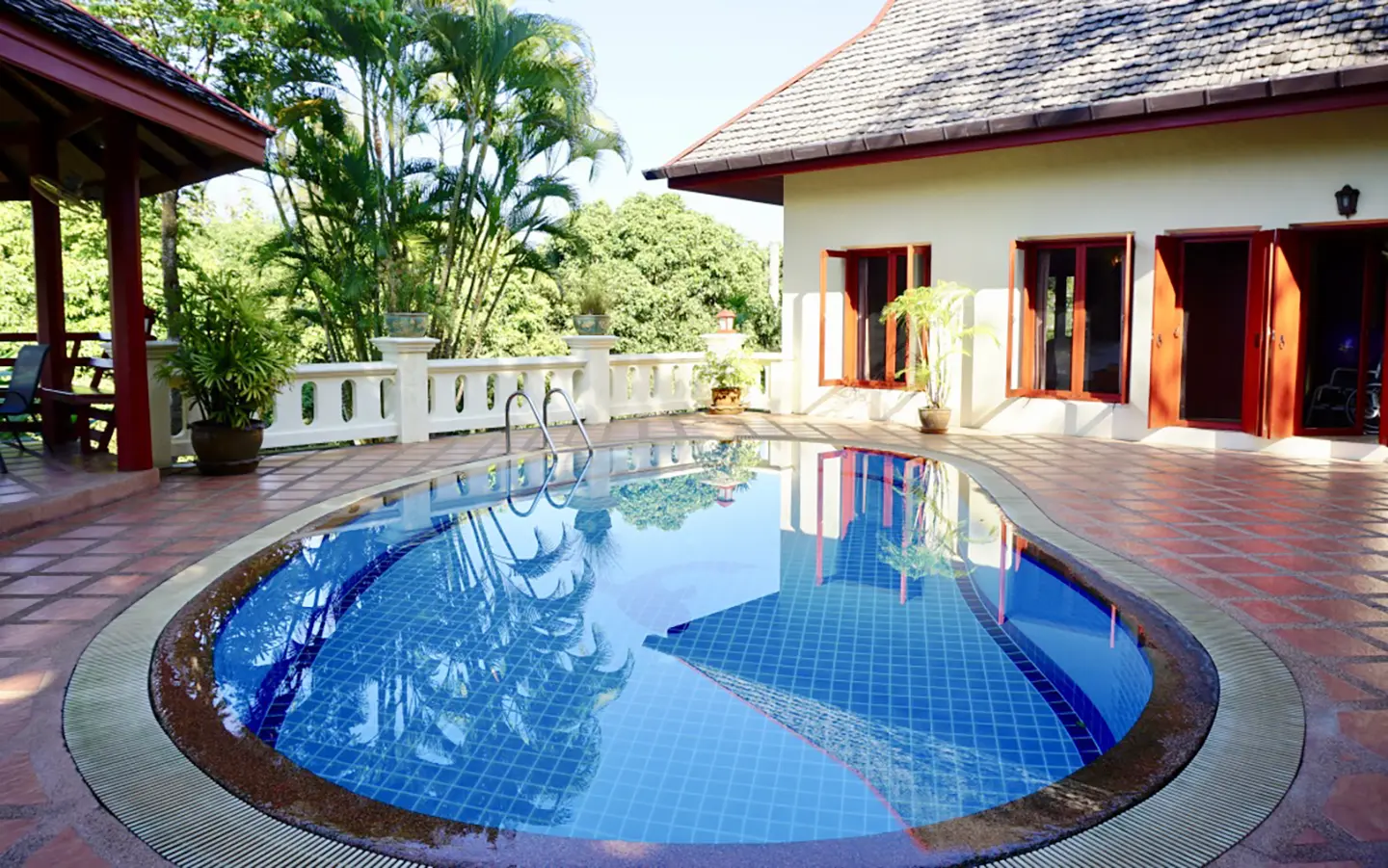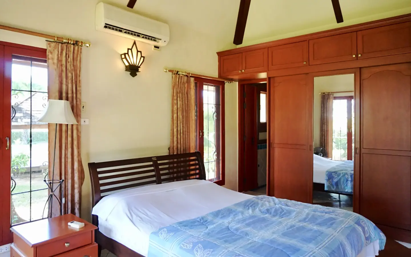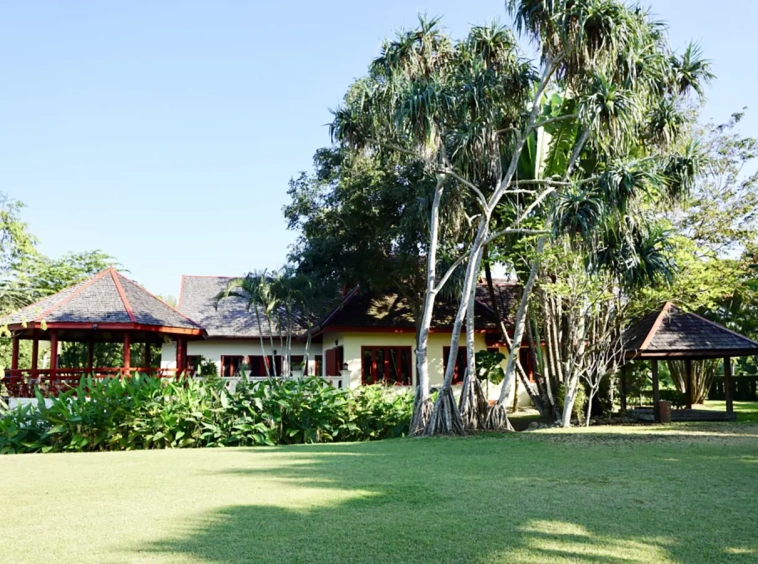 Situated amidst landscaped land with lotus pond at the rear of the property, the garden is mainly laid to lawn and some tropical flowers and a small vegetable patch. A few steps lead up to the house which opens to a cosy on the right of the courtyard with 2 buildings on the sides and the pool area in the middle and a Sala on the left. The building on the left contains one en-suite guest bedroom and a large living room. The building on the right contains the second bedroom, en-suite with a shower and also a walk-in closet, master bedroom with built-in closet and en-suite with bathtub, a large fully fitted and functional kitchen, lastly is the maids living quarter which can also be used as another guest bedroom.