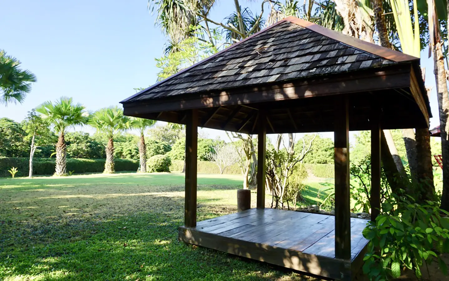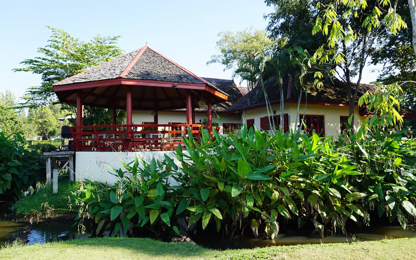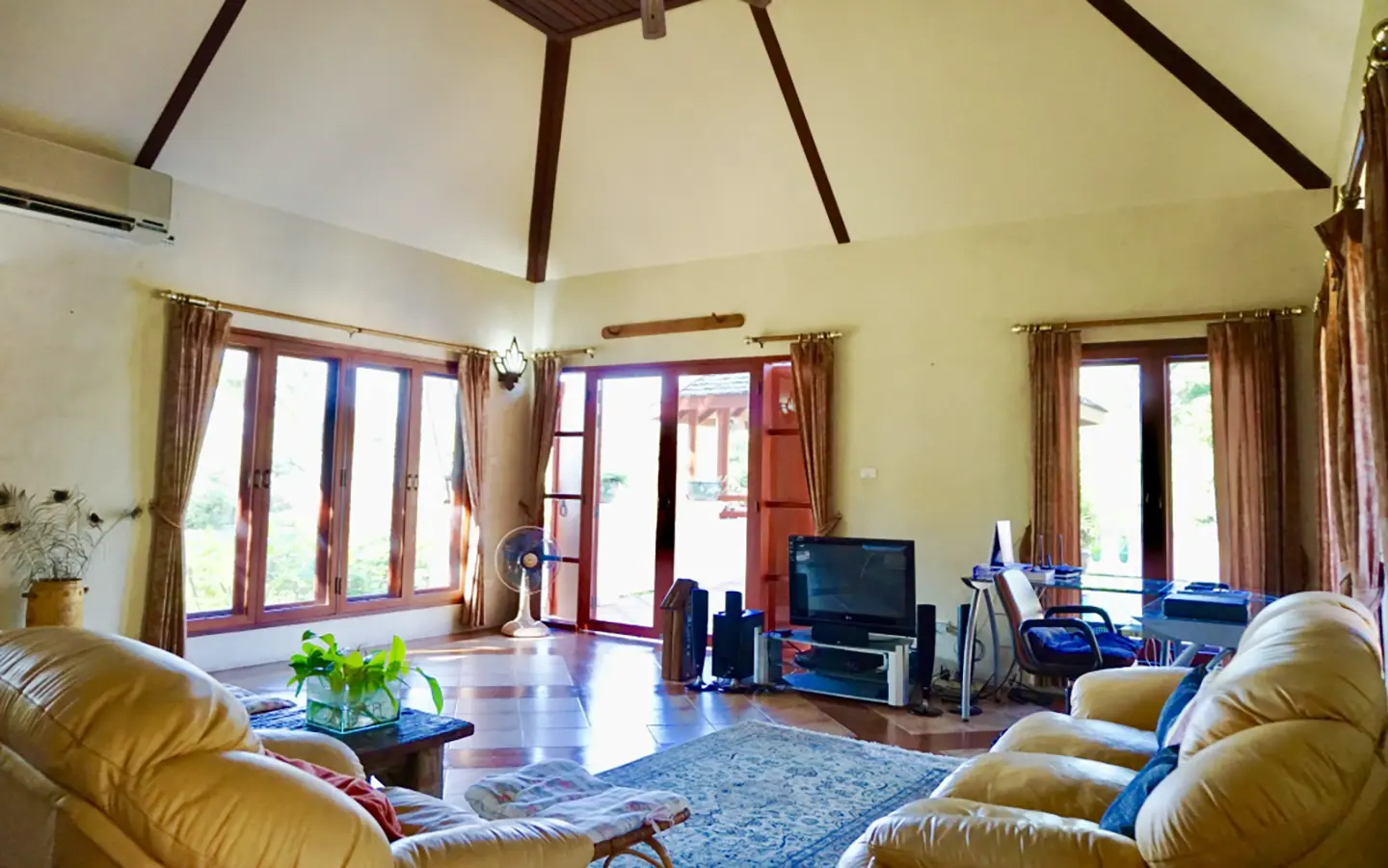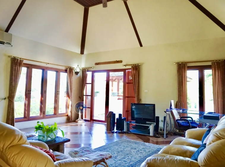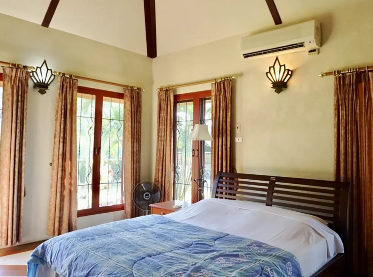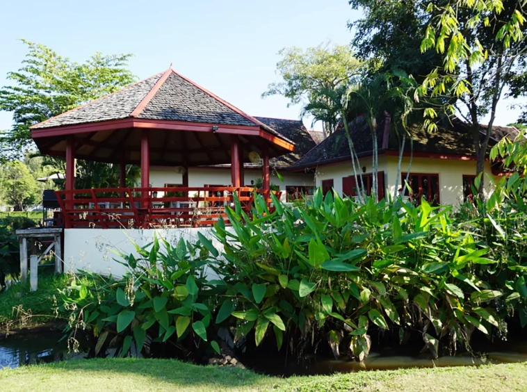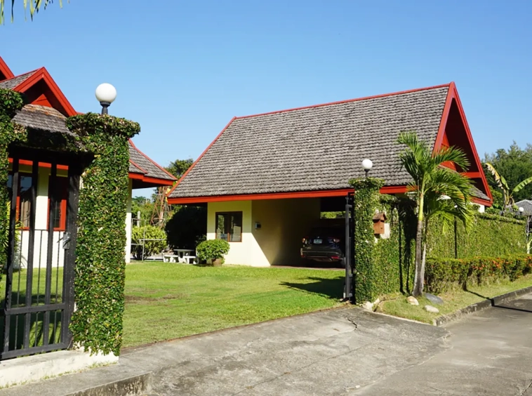 Situated amidst landscaped land with lotus pond at the rear of the property, the garden is mainly laid to lawn and some tropical flowers and a small vegetable patch. A few steps lead up to the house which opens to a cosy on the right of the courtyard with 2 buildings on the sides and the pool area in the middle and a Sala on the left. The building on the left contains one en-suite guest bedroom and a large living room. The building on the right contains the second bedroom, en-suite with a shower and also a walk-in closet, master bedroom with built-in closet and en-suite with bathtub, a large fully fitted and functional kitchen, lastly is the maids living quarter which can also be used as another guest bedroom.