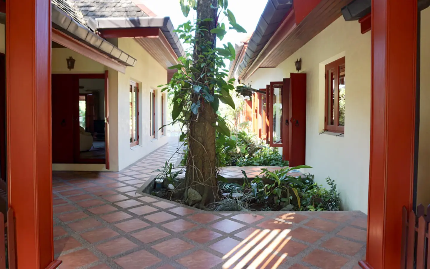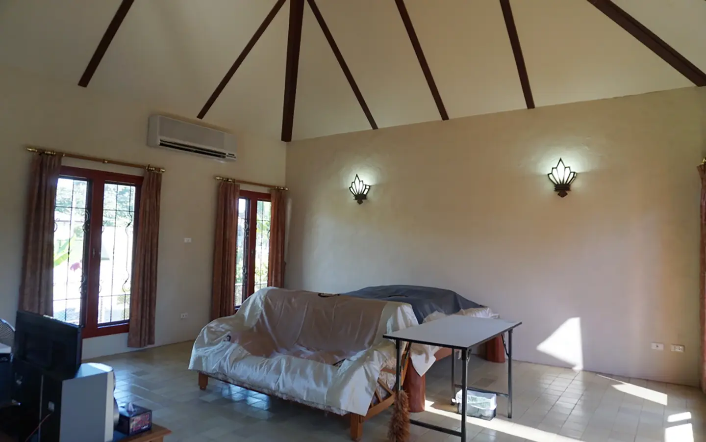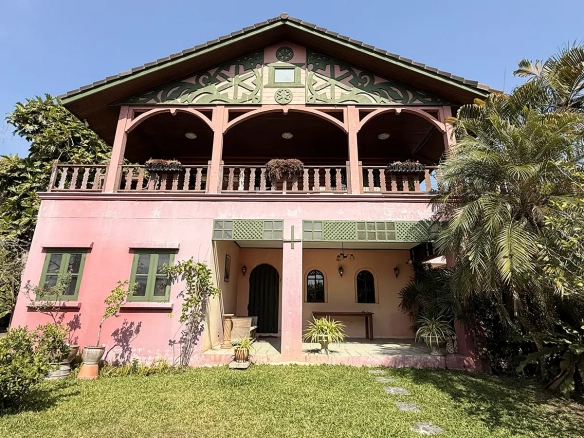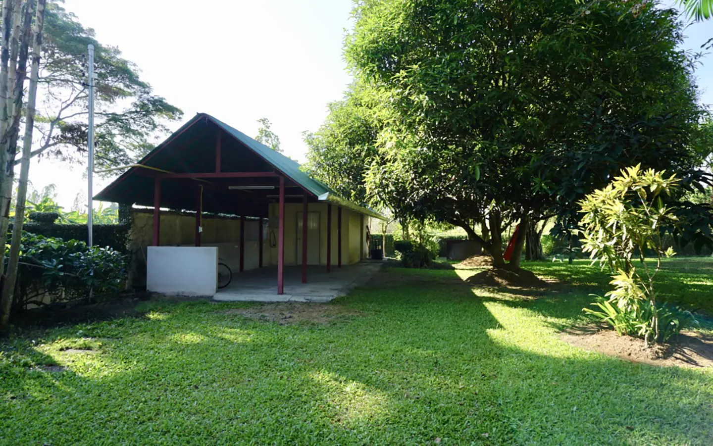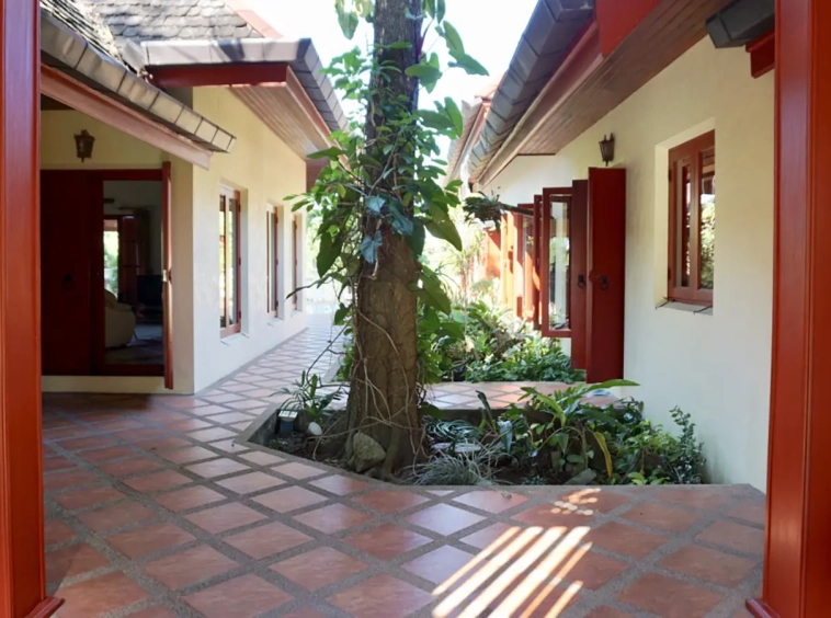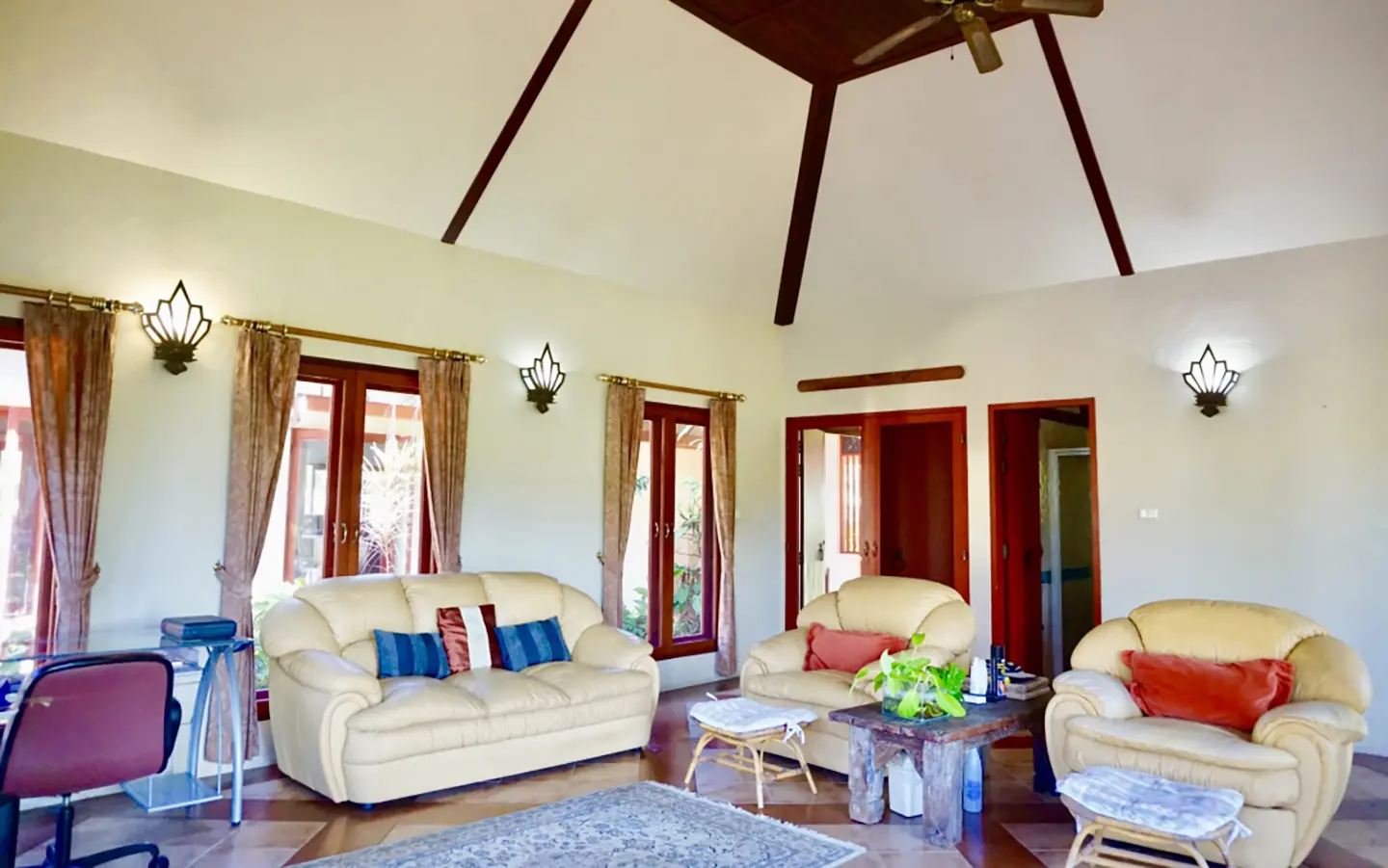 Situated amidst landscaped land with lotus pond at the rear of the property, the garden is mainly laid to lawn and some tropical flowers and a small vegetable patch. A few steps lead up to the house which opens to a cosy on the right of the courtyard with 2 buildings on the sides and the pool area in the middle and a Sala on the left. The building on the left contains one en-suite guest bedroom and a large living room. The building on the right contains the second bedroom, en-suite with a shower and also a walk-in closet, master bedroom with built-in closet and en-suite with bathtub, a large fully fitted and functional kitchen, lastly is the maids living quarter which can also be used as another guest bedroom.