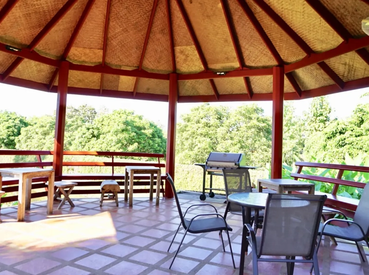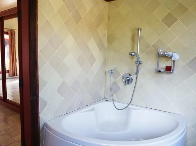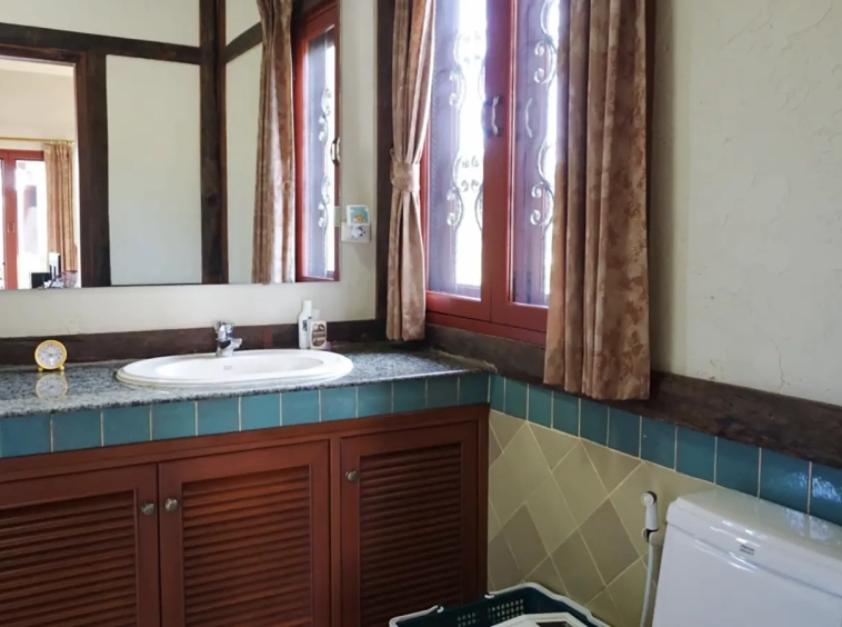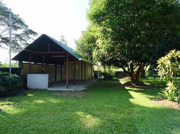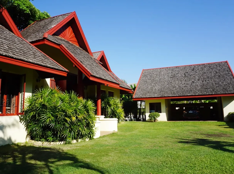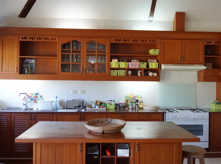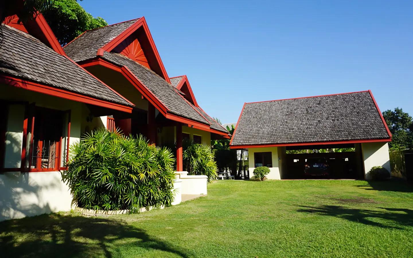 Adjacent to the carport is a Thai kitchen and laundry room. Hot water is supplied by a solar panel, there is a well on the property and large water with a water filter. The house has charming teakwood shingles roof, beautiful and classic terracotta and teak wood flooring, high ceiling and ceiling fans throughout.