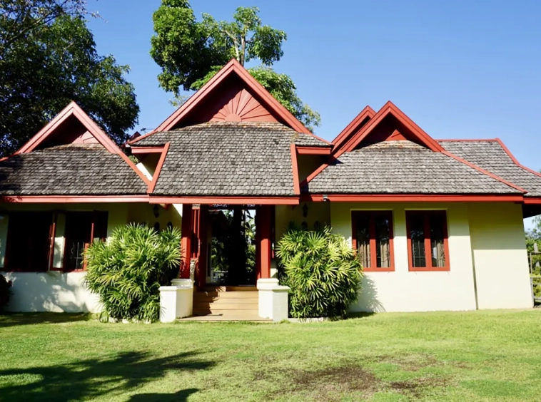 Charming modern Lanna style one storey house for sale on a large plot of land in Saraphi area of Chiang Mai. The buyer has the option of buying the house with 1 rai of land or the entire property which is 4 rais.
