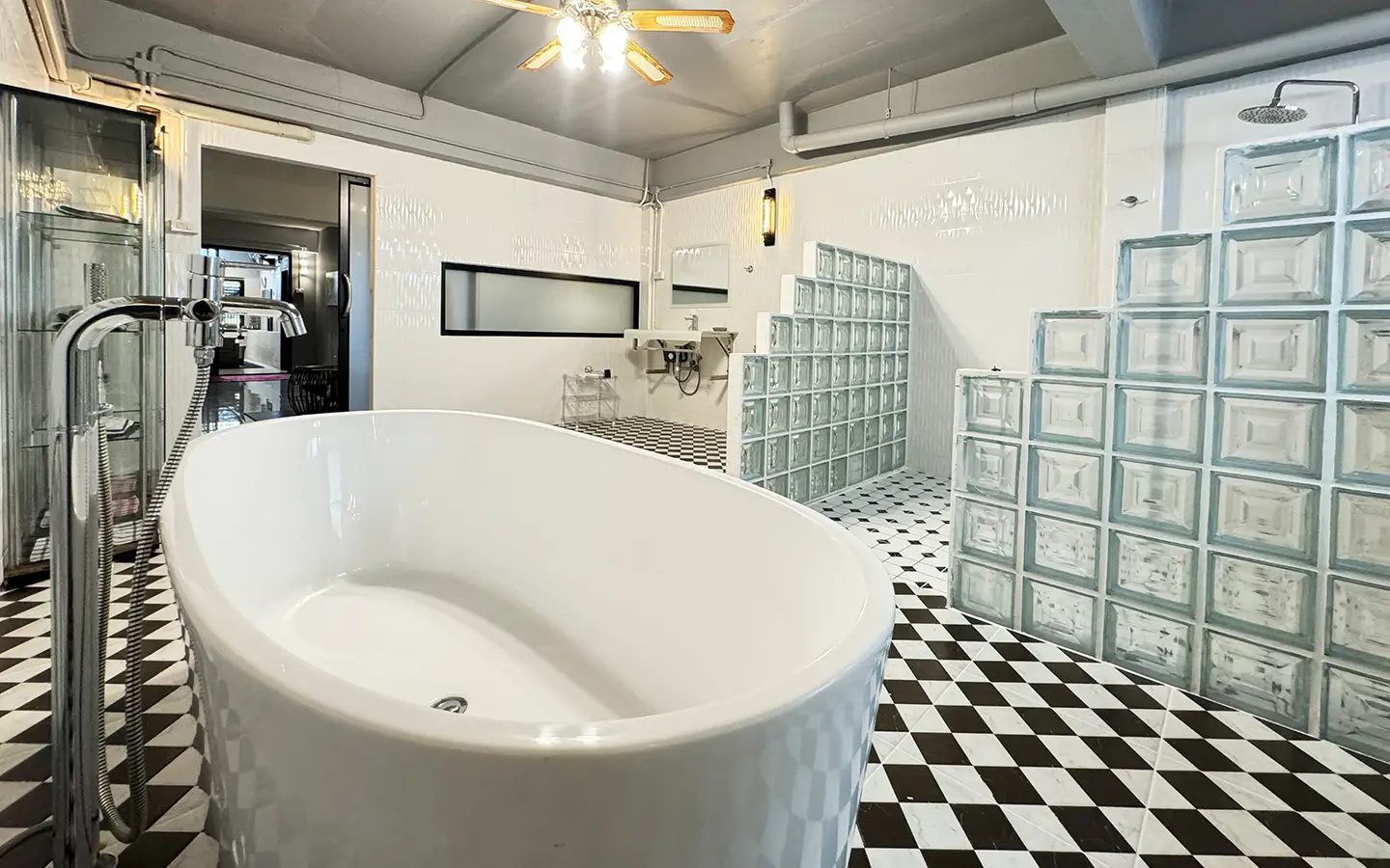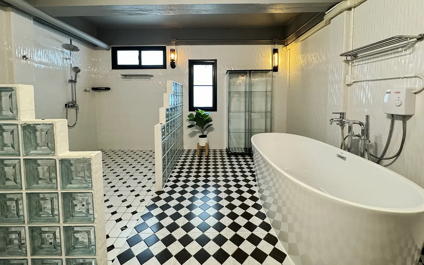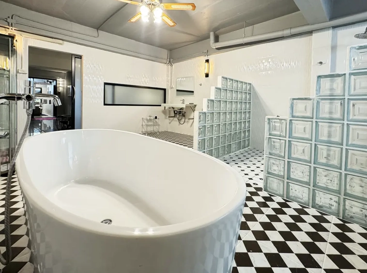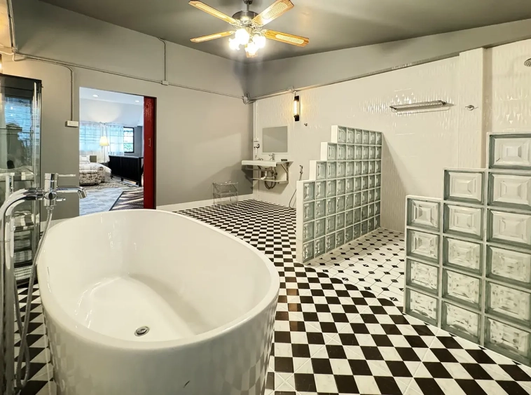 The second floor consists of a bedroom with a closet set, a separate sitting area, and a spacious bathroom with a Victorian bathtub. The third floor is similar but the bathroom has an additional 2 rain showers.