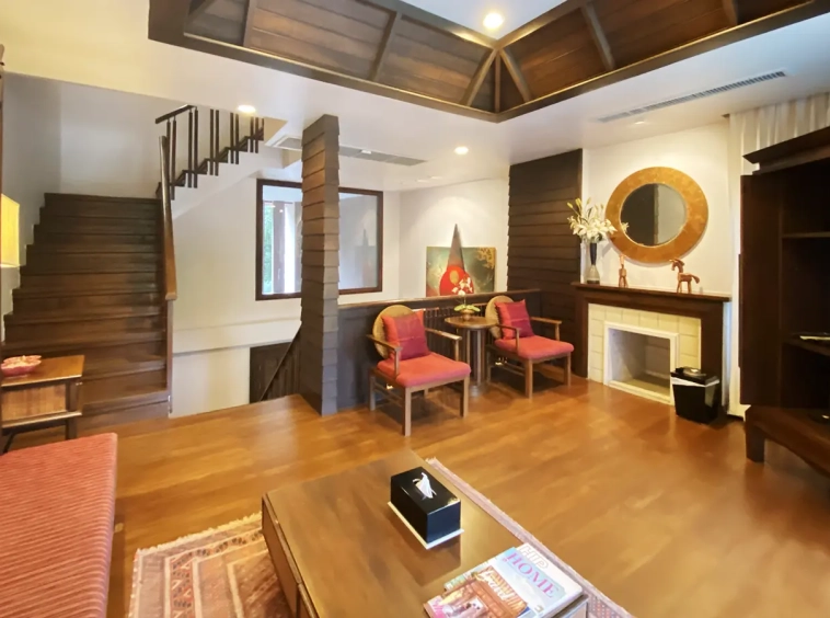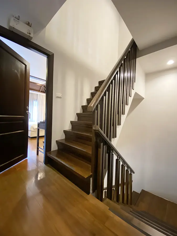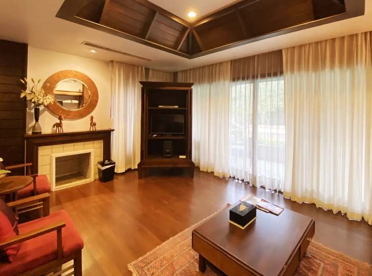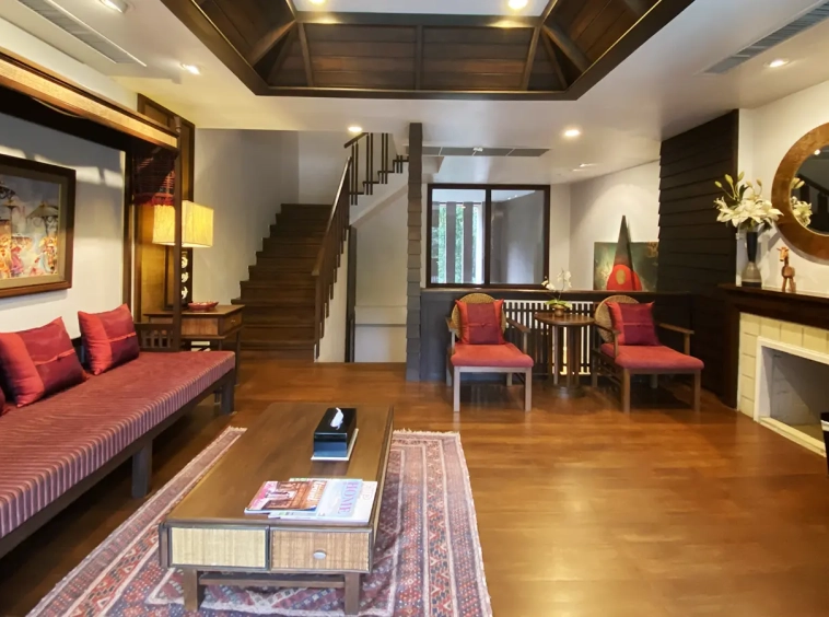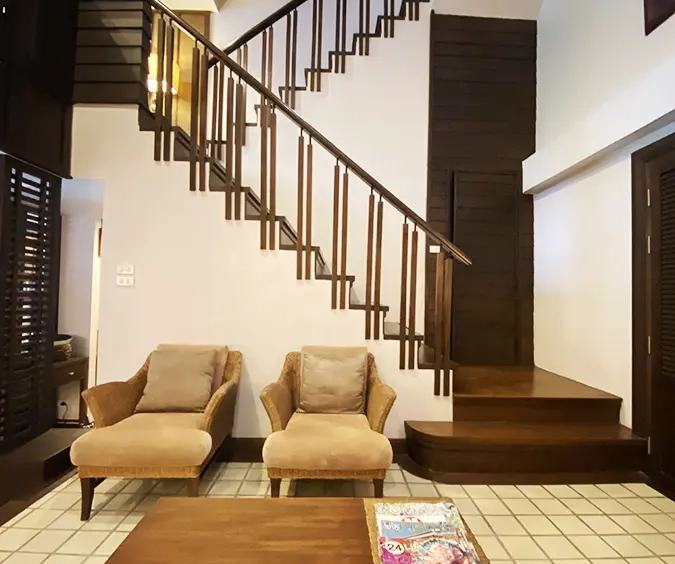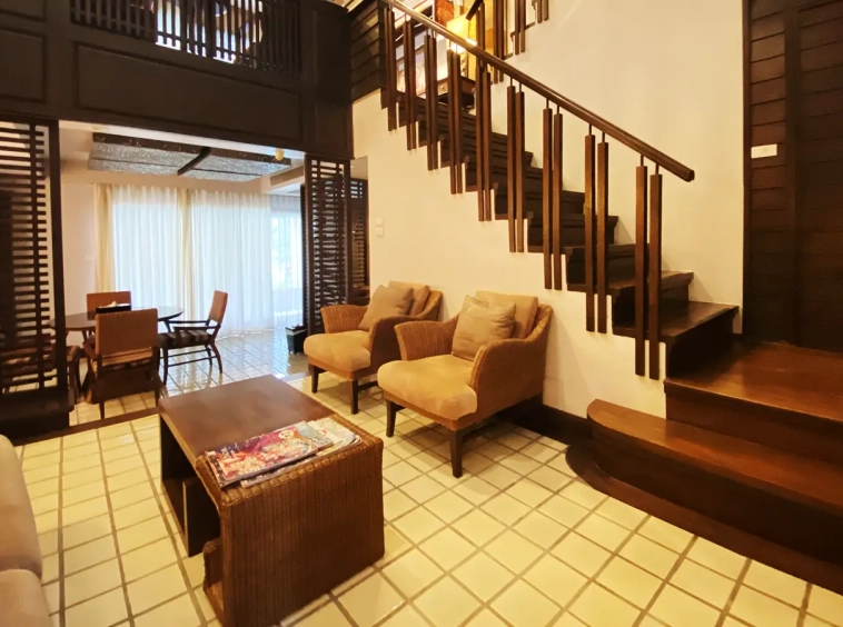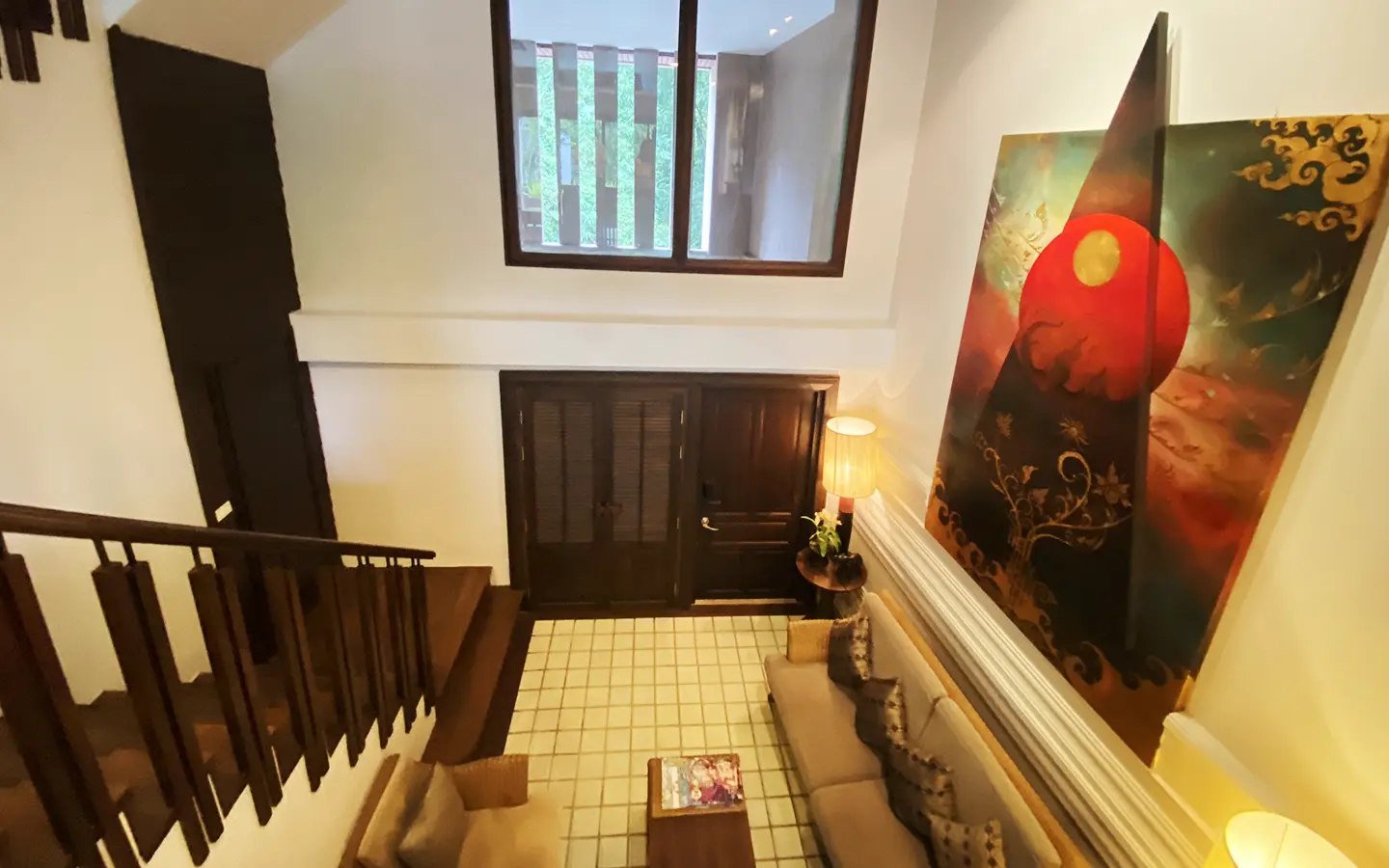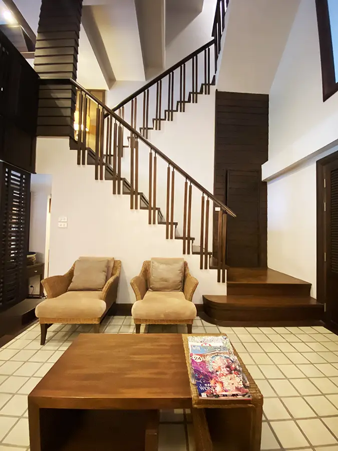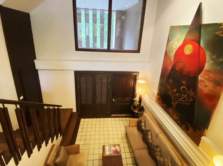 The unit is a 4 storey unit in the Residence zone with the driveway at parking at the rear which is used as main entrance to the house. The ground floor comprises a tall ceiling living area with terracotta flooring, a couple of steps split level to a dining room, a fitted Western kitchen, guest bathroom and a veranda overlooking and with access to the swimming pool. Beautiful and tastefully decorated throughout. Going up to the mezzanine floor there is a lovely family and TV room with a tall alcove ceiling and wooden floor. The third floor comprises an ensuite guest bedroom and the ensuite master bedroom which also has a veranda. Again beautiful wooden floor throughout and featuring wooden alcove ceiling. The bathroom also features a lot of beautiful wood trimmings. The entire resident oozes a luxurious yet cozy feel. The fourth floor has a large terrace for stargazing and an outdoor bathtub. The loft style third bedroom is on this floor which can also be used as an entertainment room. It is ensuite and also comes with a pantry.