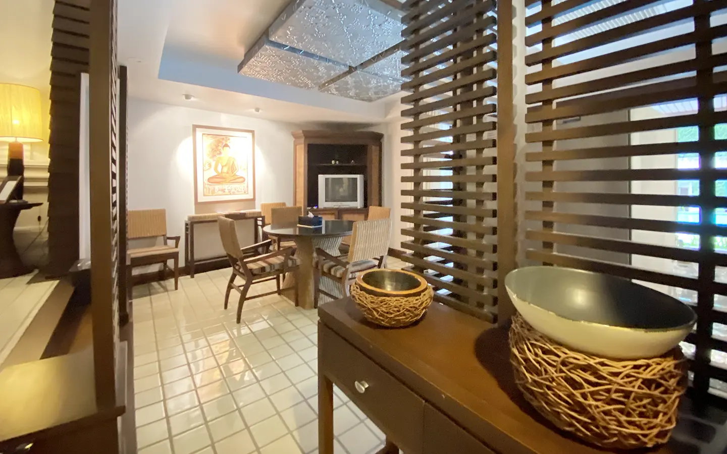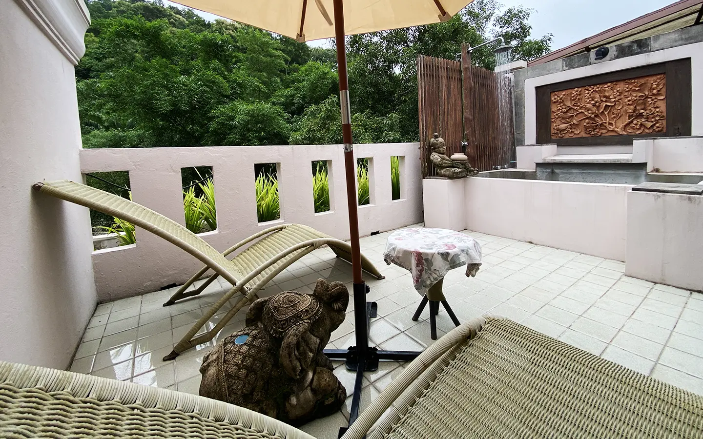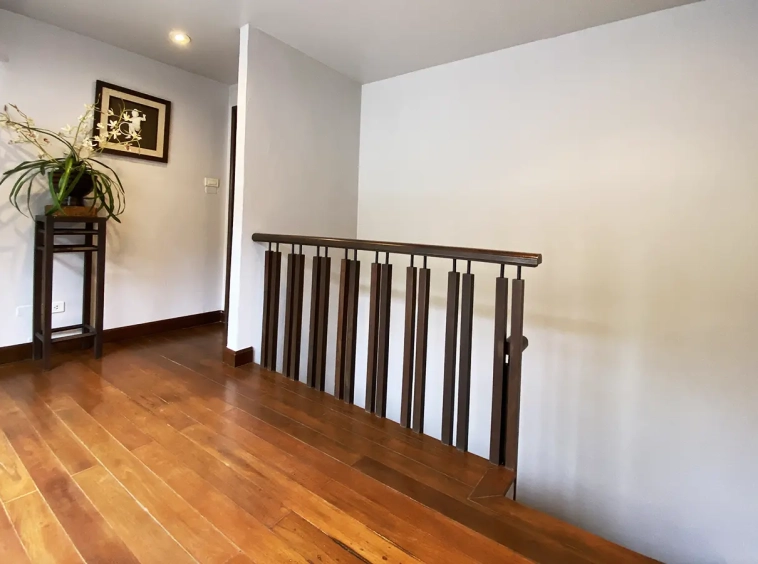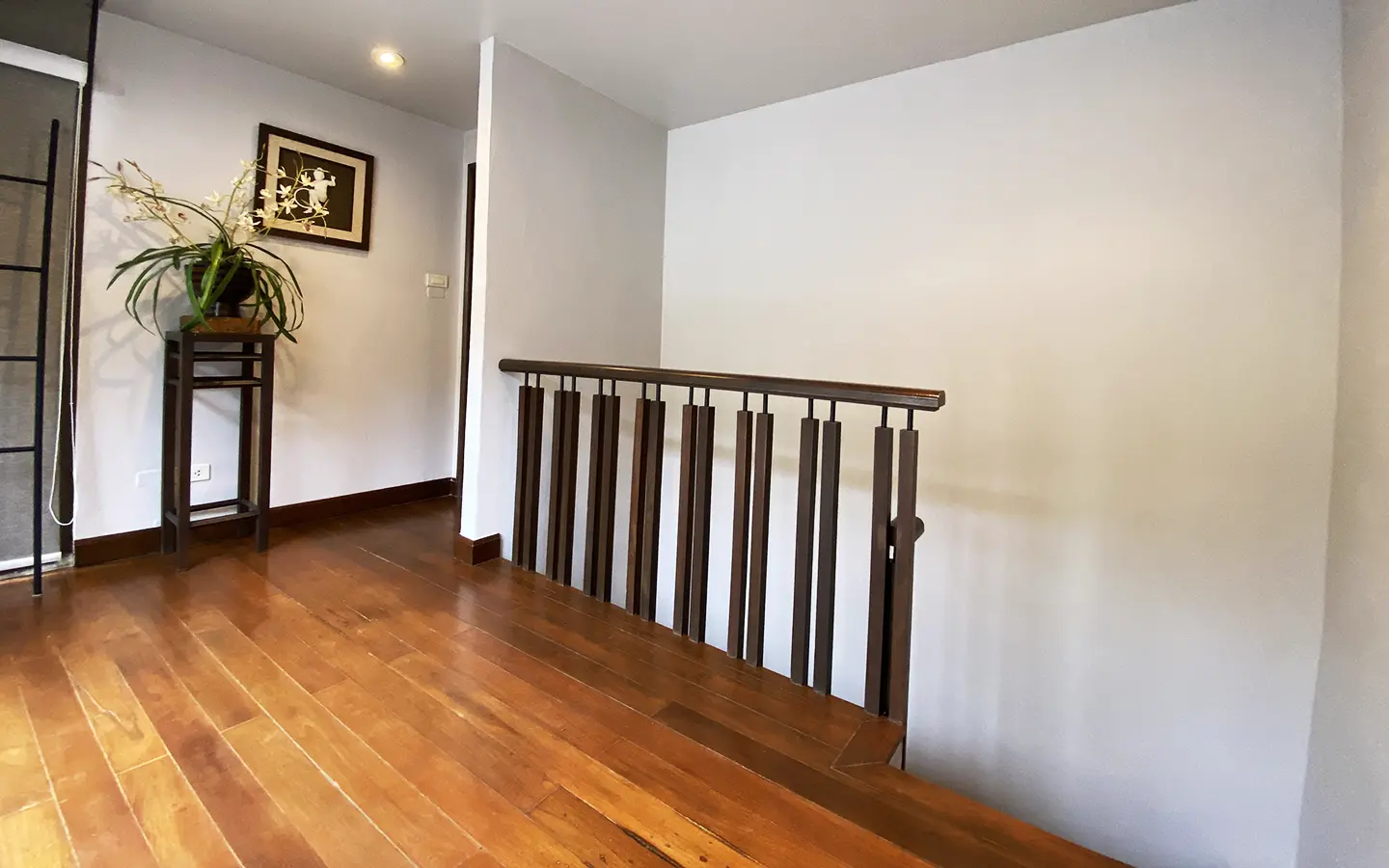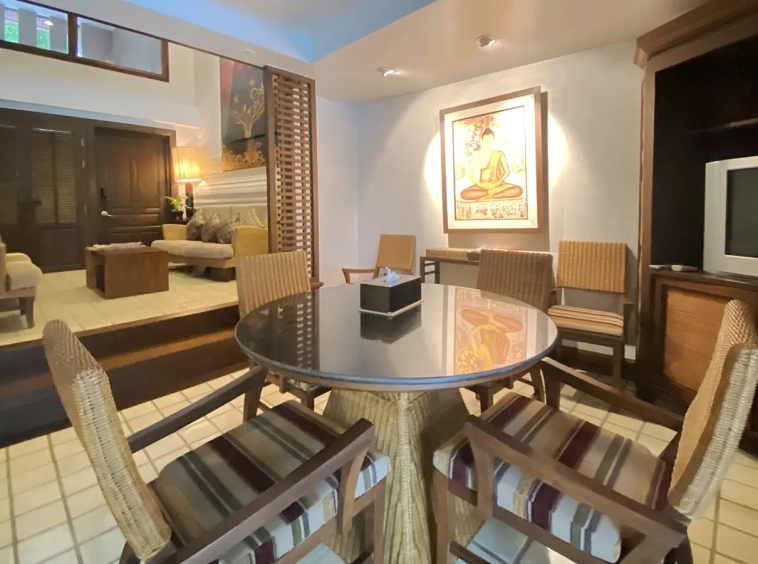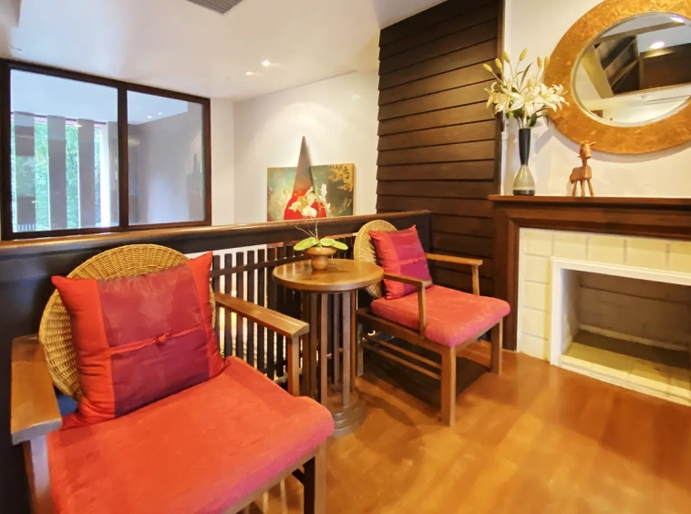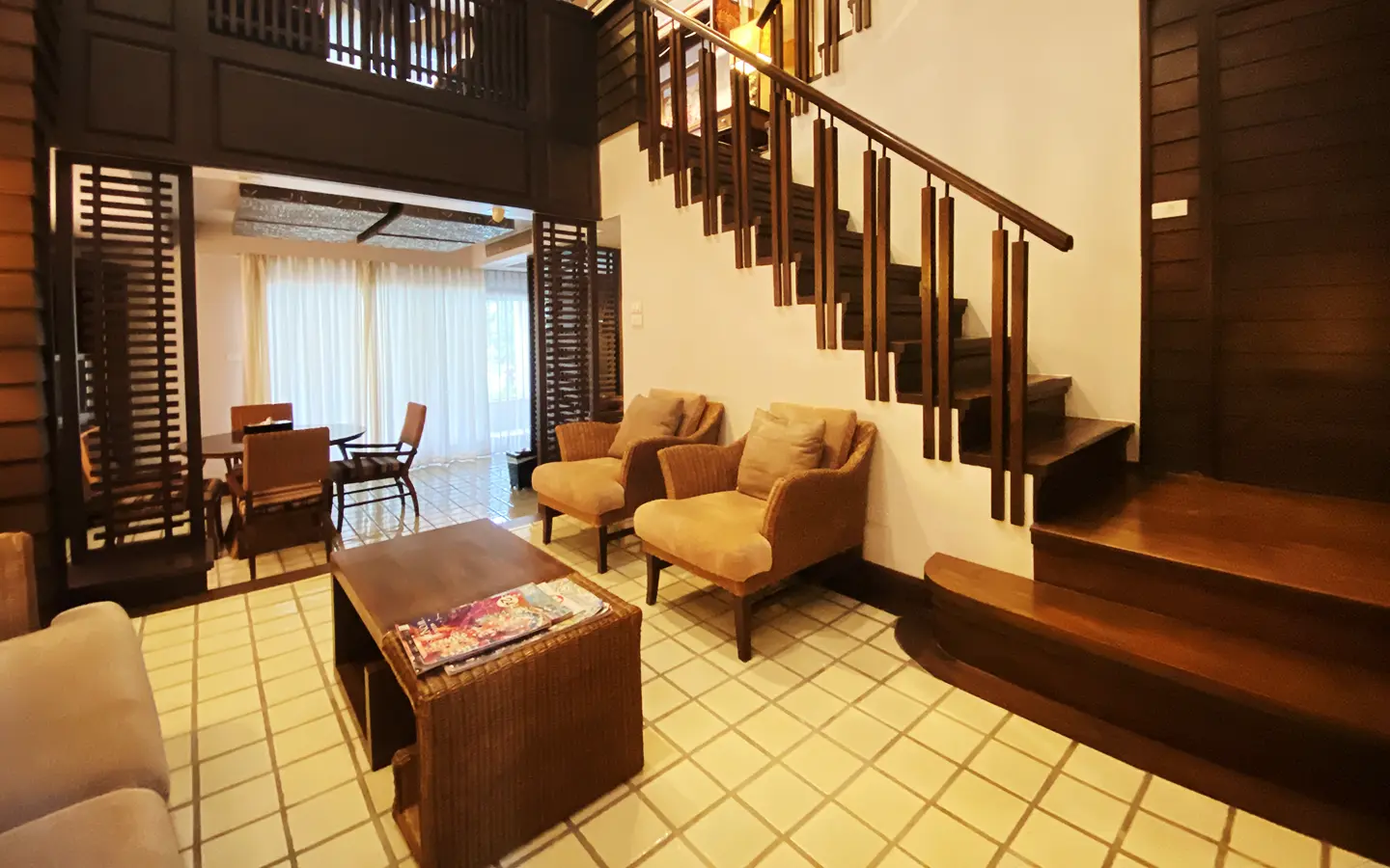 The unit is a 4 storey unit in the Residence zone with the driveway at parking at the rear which is used as main entrance to the house. The ground floor comprises a tall ceiling living area with terracotta flooring, a couple of steps split level to a dining room, a fitted Western kitchen, guest bathroom and a veranda overlooking and with access to the swimming pool. Beautiful and tastefully decorated throughout. Going up to the mezzanine floor there is a lovely family and TV room with a tall alcove ceiling and wooden floor. The third floor comprises an ensuite guest bedroom and the ensuite master bedroom which also has a veranda. Again beautiful wooden floor throughout and featuring wooden alcove ceiling. The bathroom also features a lot of beautiful wood trimmings. The entire resident oozes a luxurious yet cozy feel. The fourth floor has a large terrace for stargazing and an outdoor bathtub. The loft style third bedroom is on this floor which can also be used as an entertainment room. It is ensuite and also comes with a pantry.