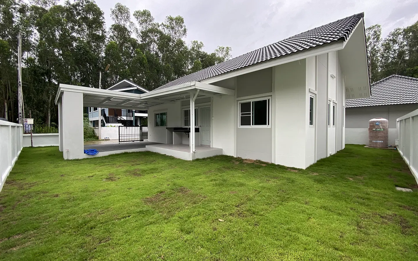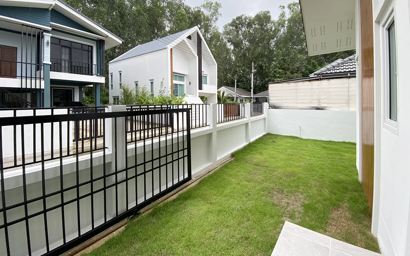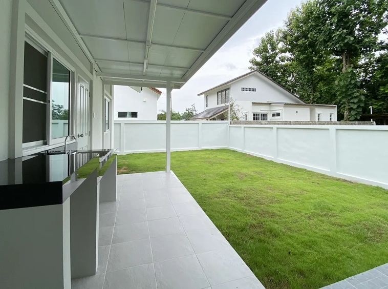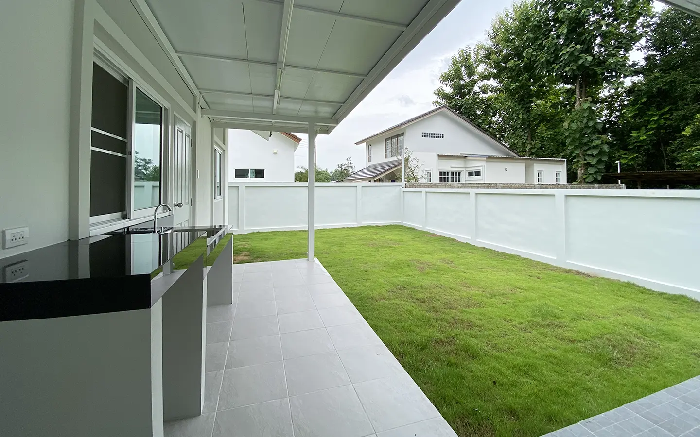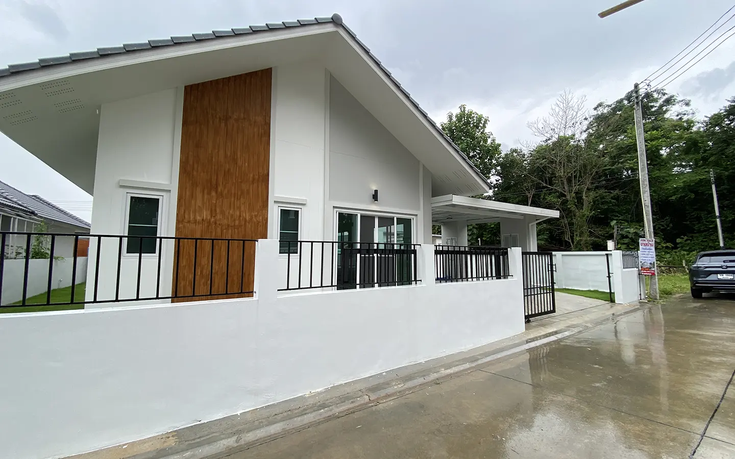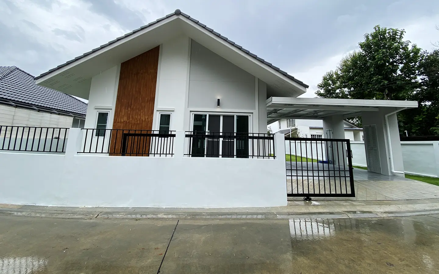 The house is in a small quiet estate of only 15 houses. There is a covered car park with built-in storage cupboards. Inside, the living room is nice and airy with tall ceilings. The house is north-facing and has been specifically designed for good airflow. There are 3 bedrooms with the master bedroom having ensuite and the other two bedrooms sharing a family/guest bathroom. The bathrooms are modern and spacious. There is a designated covered Thai kitchen at the rear of the house with a worktop with a sink and space for hobs. Decent size garden surrounds the 72 sqw house. A lovely designed home with a nice neighbourhood and in a good location.