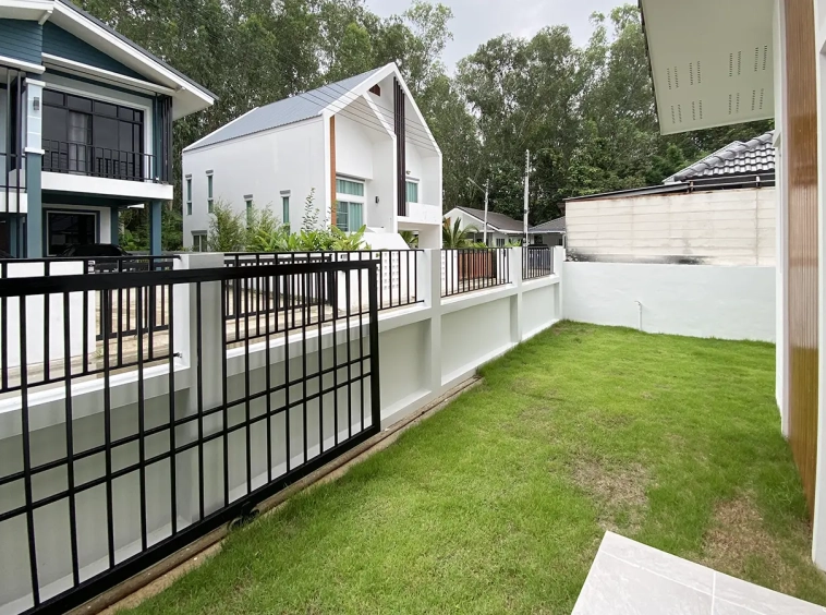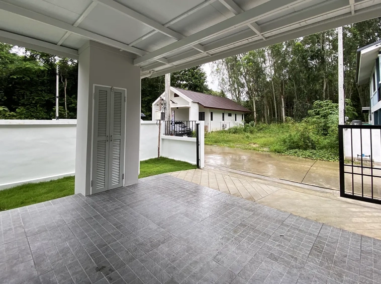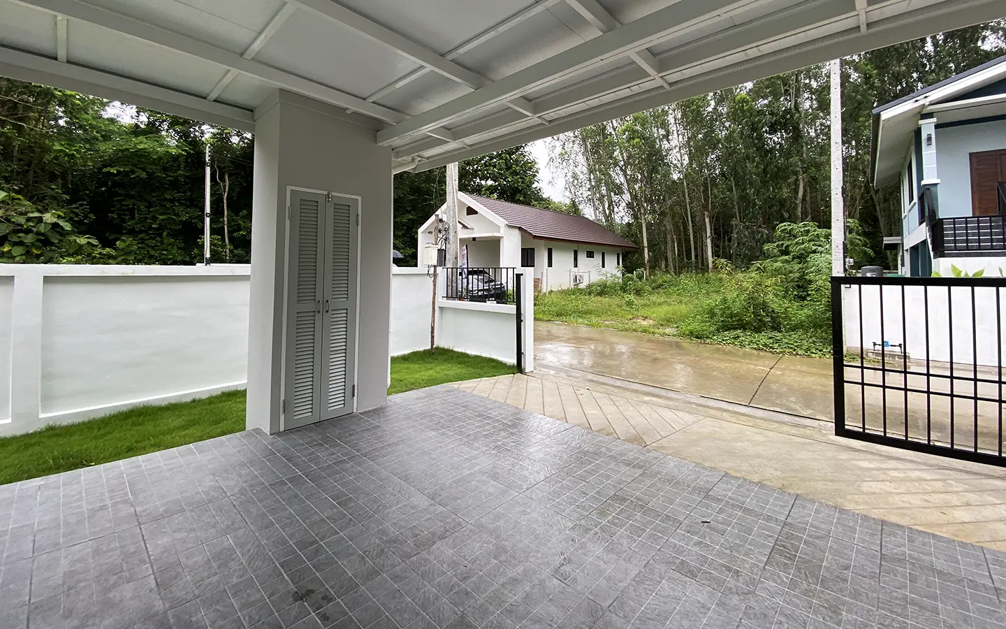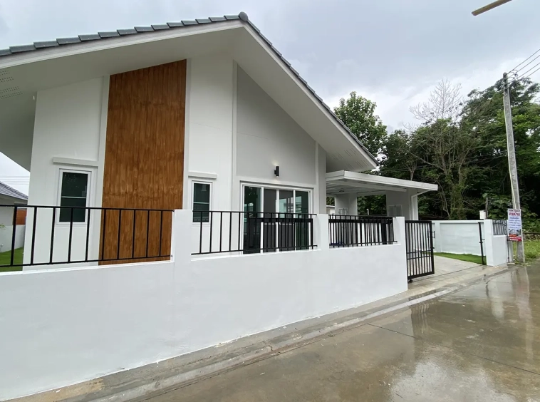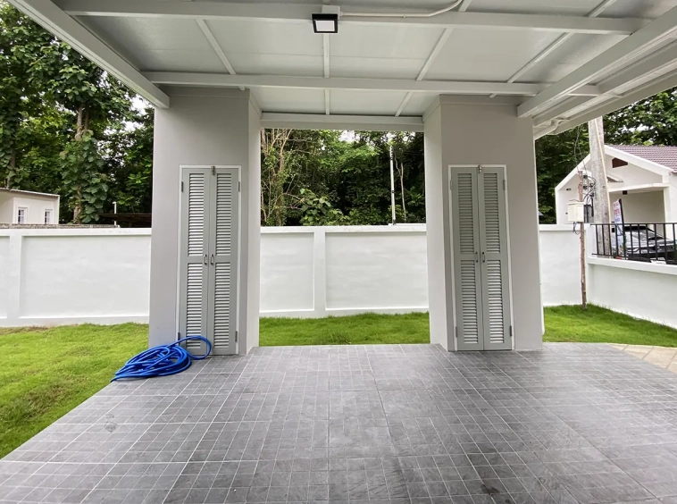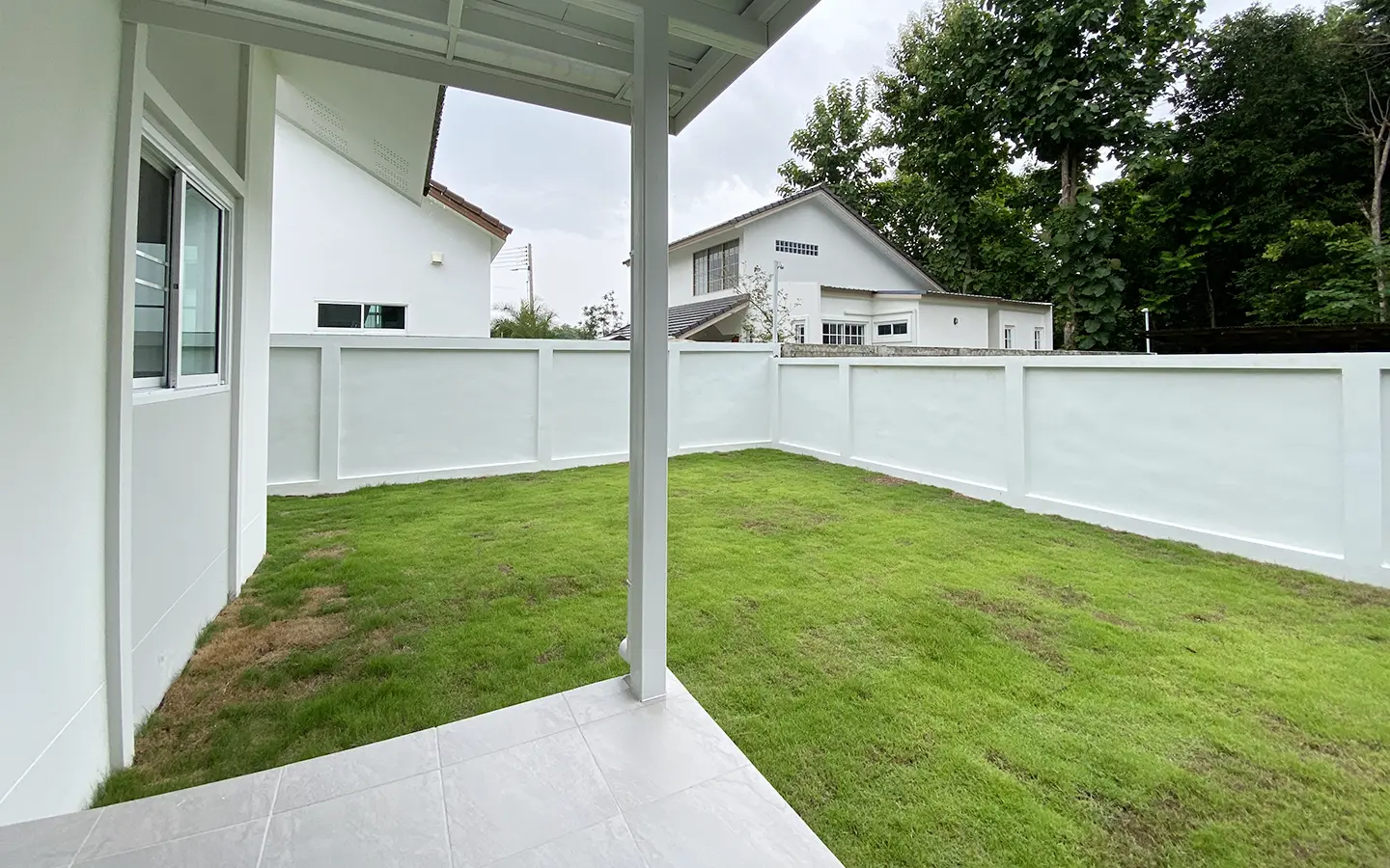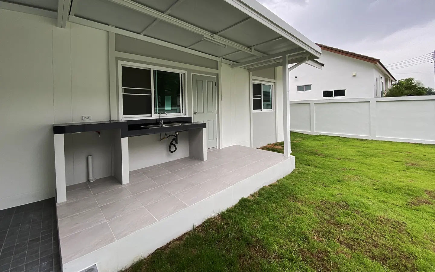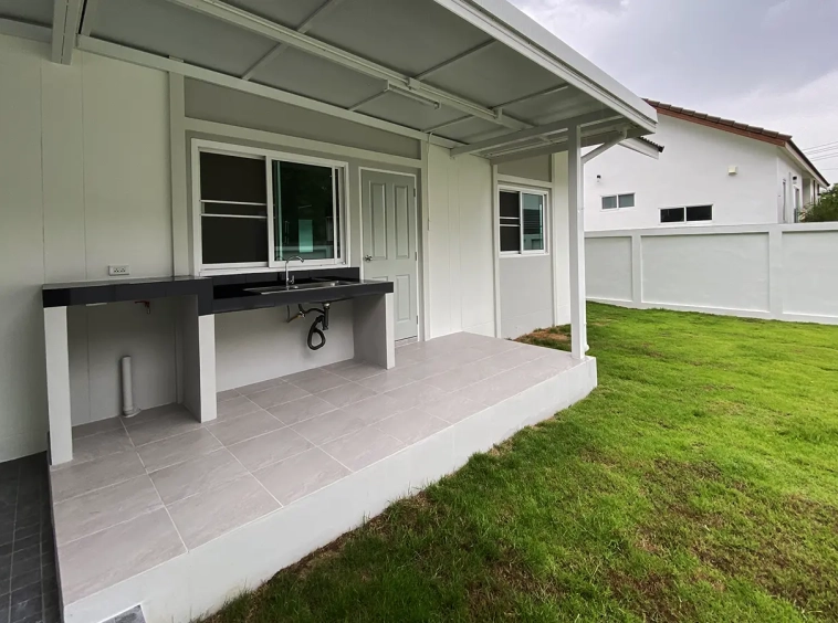 The house is in a small quiet estate of only 15 houses. There is a covered car park with built-in storage cupboards. Inside, the living room is nice and airy with tall ceilings. The house is north-facing and has been specifically designed for good airflow. There are 3 bedrooms with the master bedroom having ensuite and the other two bedrooms sharing a family/guest bathroom. The bathrooms are modern and spacious. There is a designated covered Thai kitchen at the rear of the house with a worktop with a sink and space for hobs. Decent size garden surrounds the 72 sqw house. A lovely designed home with a nice neighbourhood and in a good location.