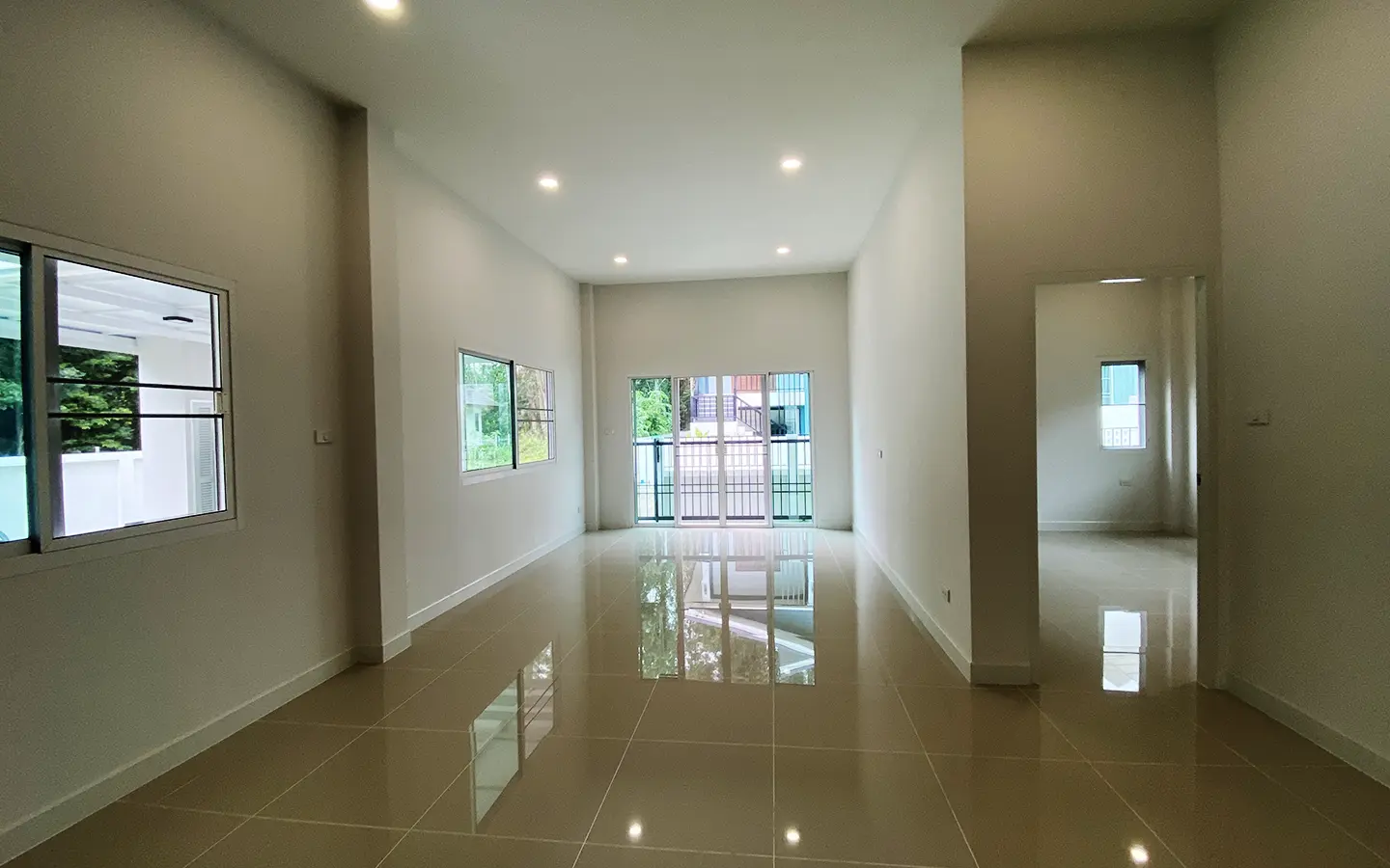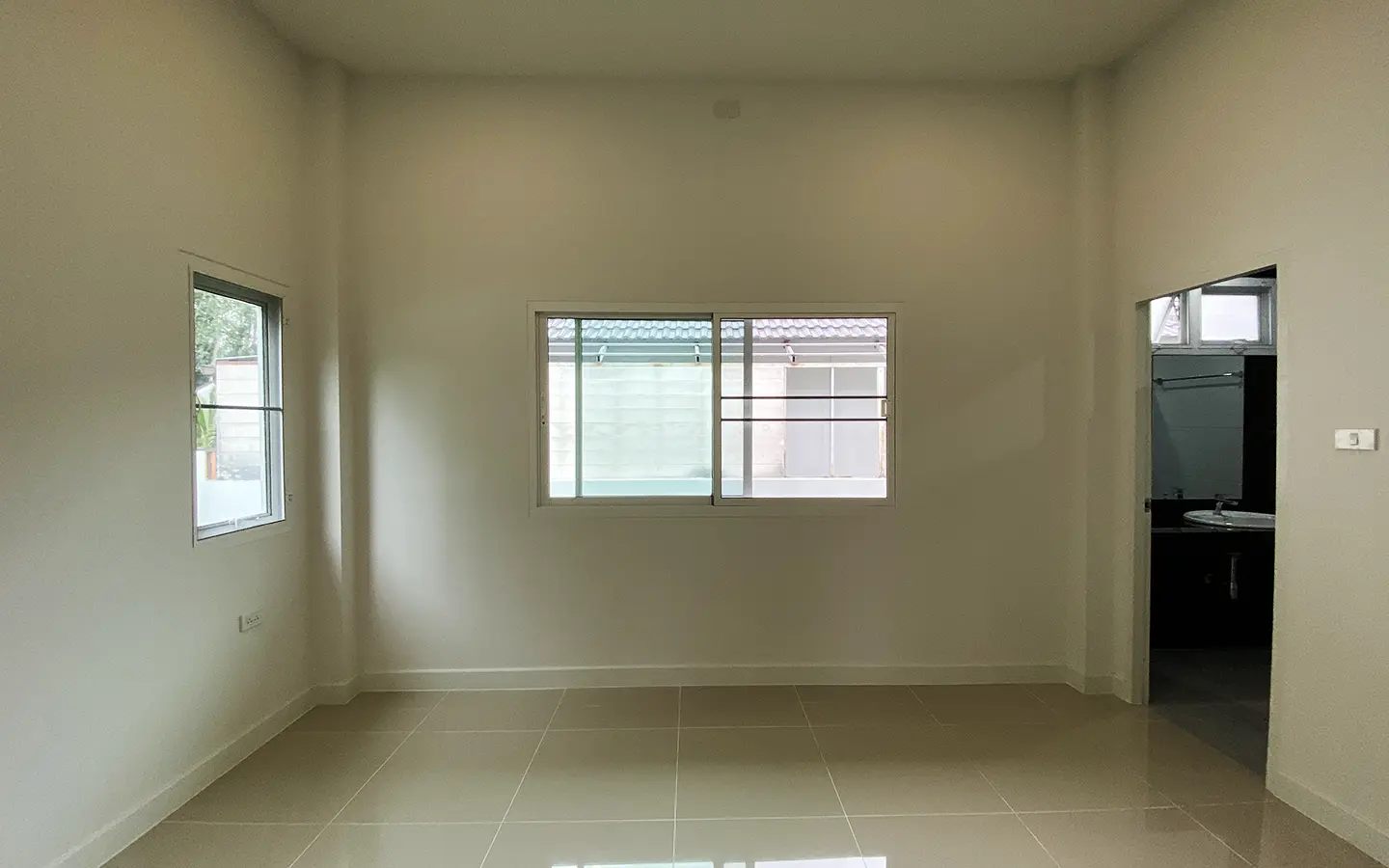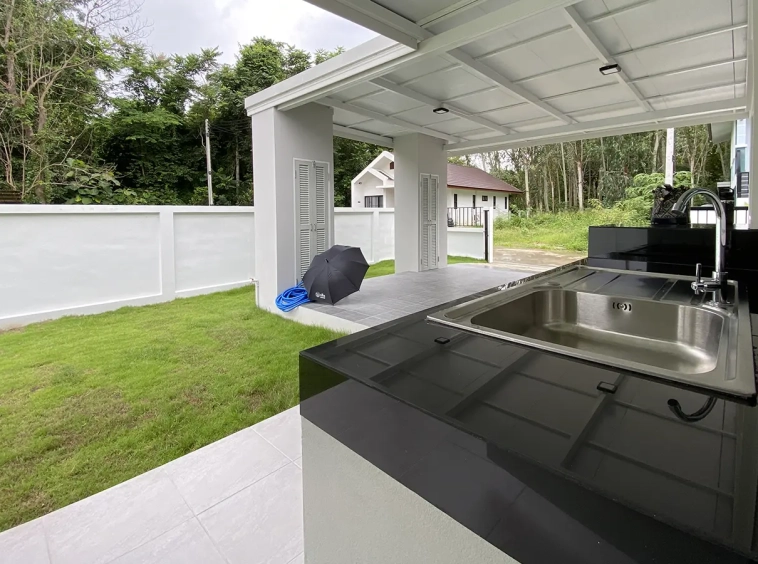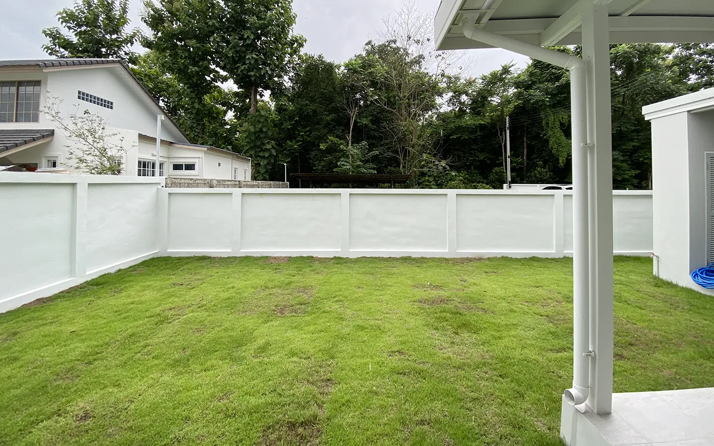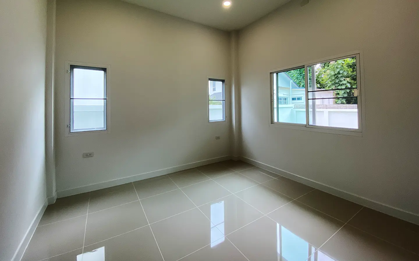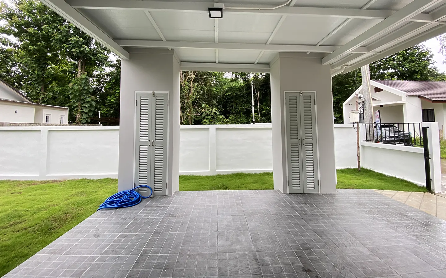 The house is in a small quiet estate of only 15 houses. There is a covered car park with built-in storage cupboards. Inside, the living room is nice and airy with tall ceilings. The house is north-facing and has been specifically designed for good airflow. There are 3 bedrooms with the master bedroom having ensuite and the other two bedrooms sharing a family/guest bathroom. The bathrooms are modern and spacious. There is a designated covered Thai kitchen at the rear of the house with a worktop with a sink and space for hobs. Decent size garden surrounds the 72 sqw house. A lovely designed home with a nice neighbourhood and in a good location.