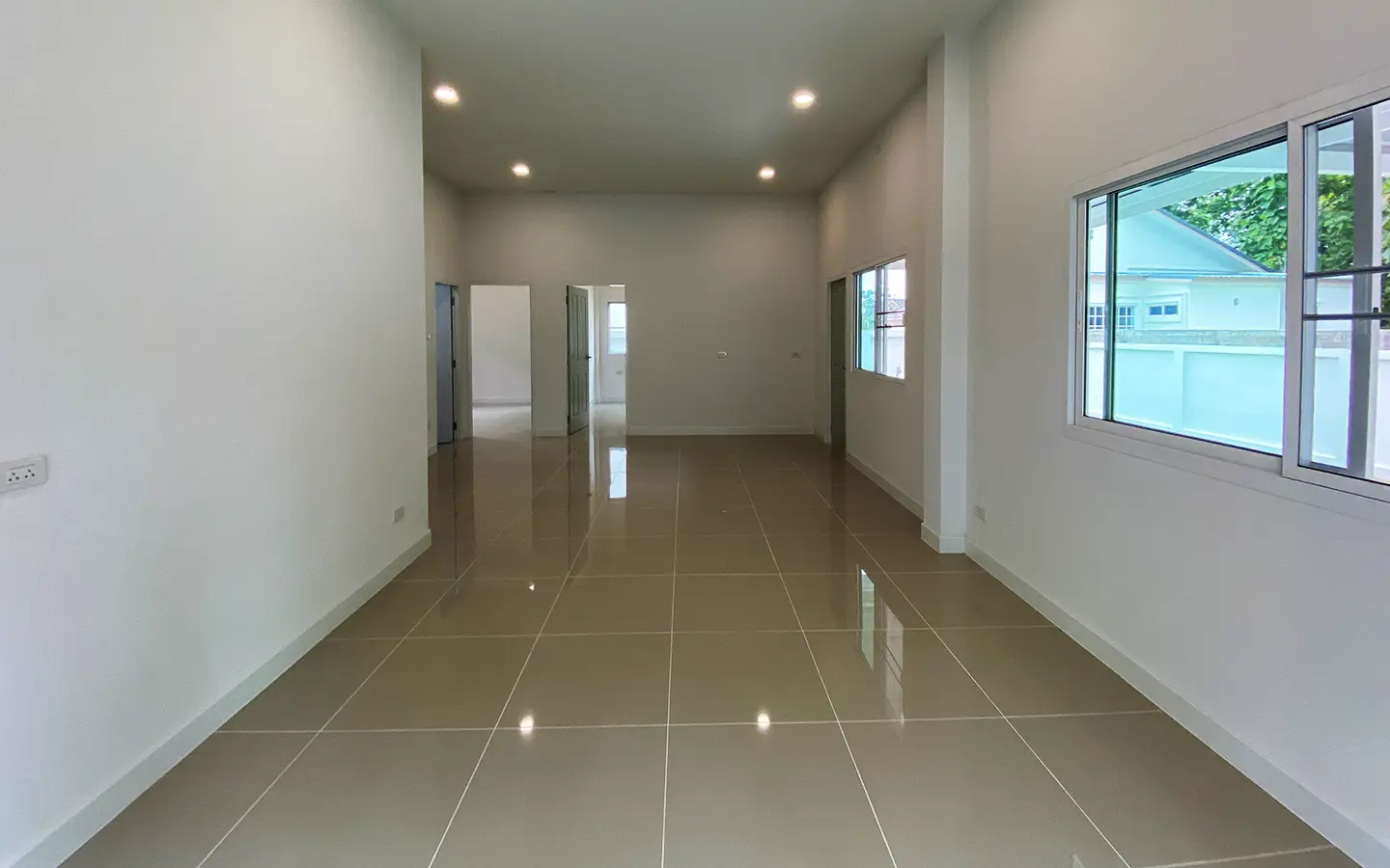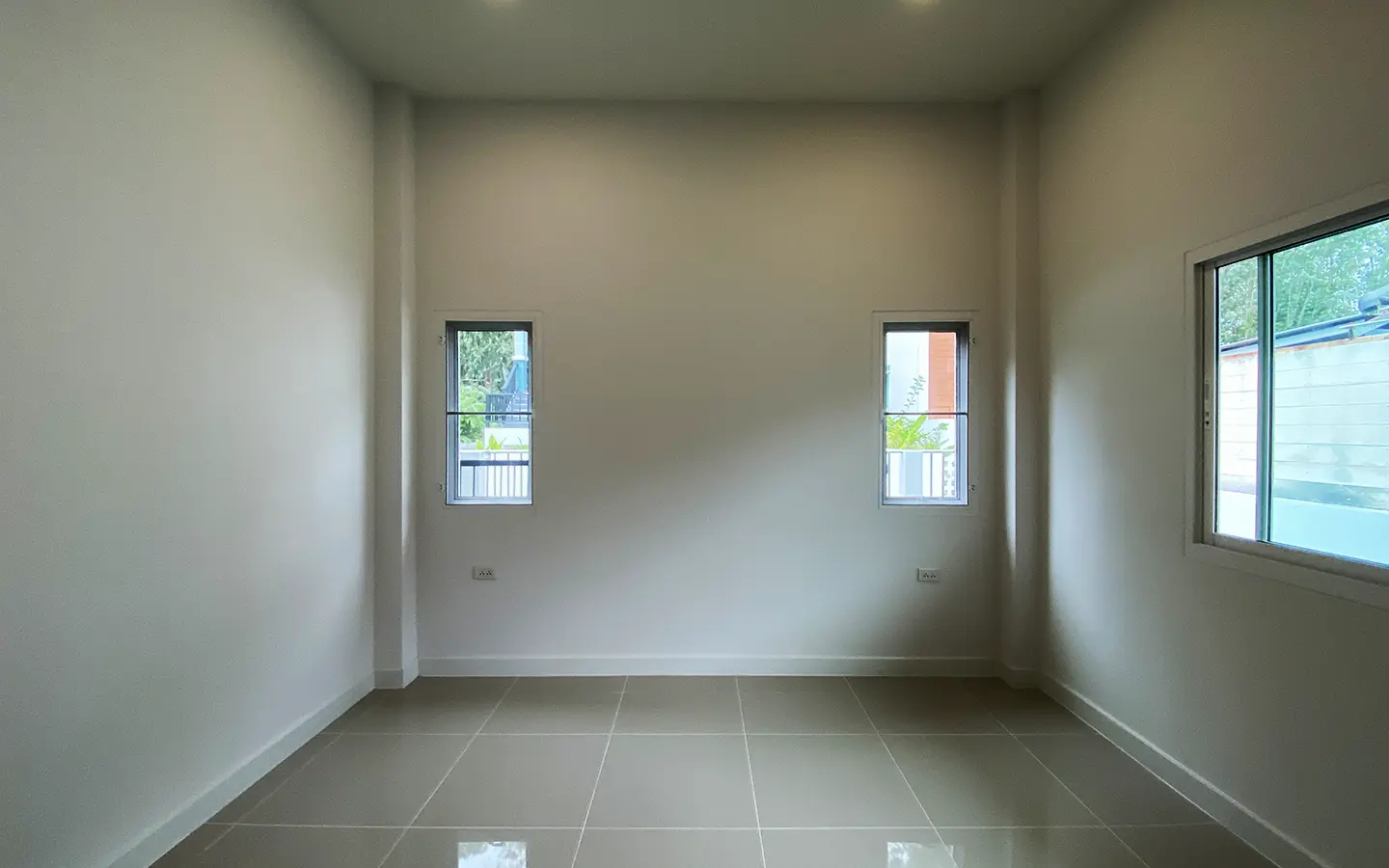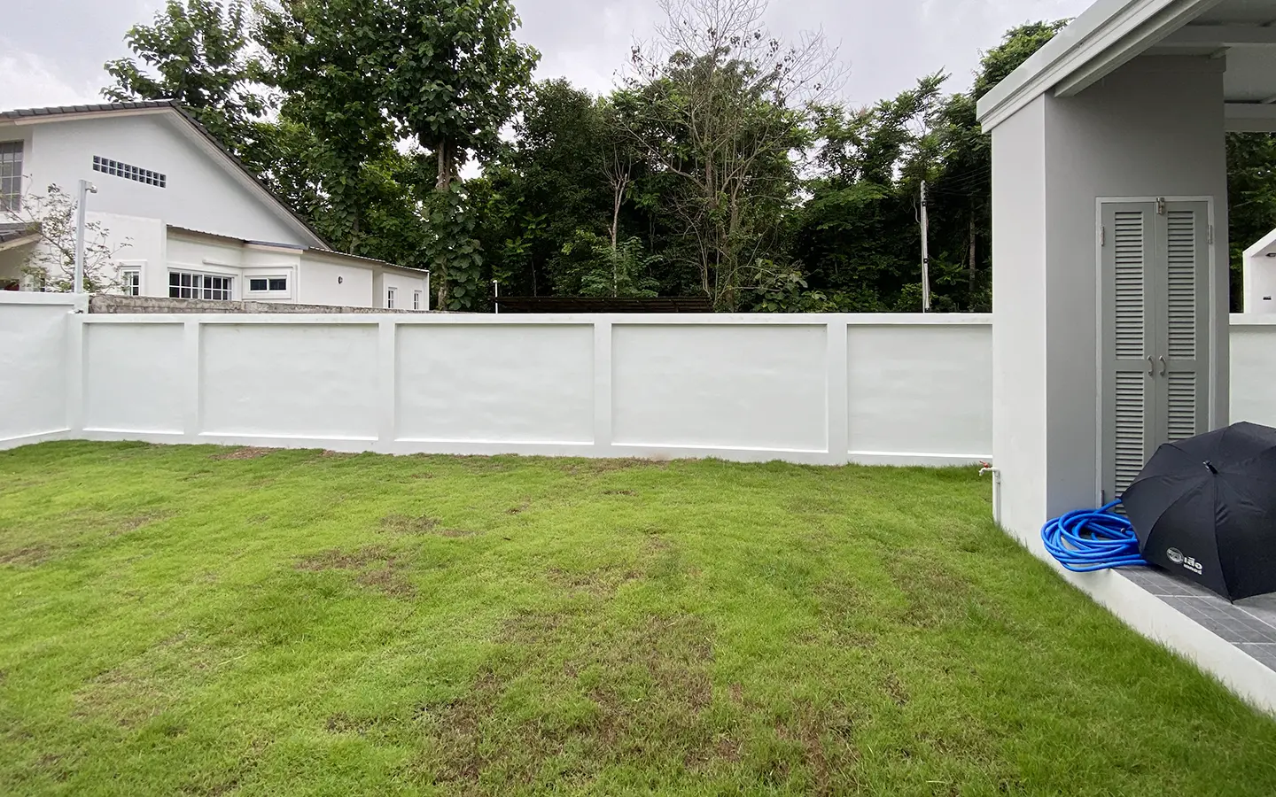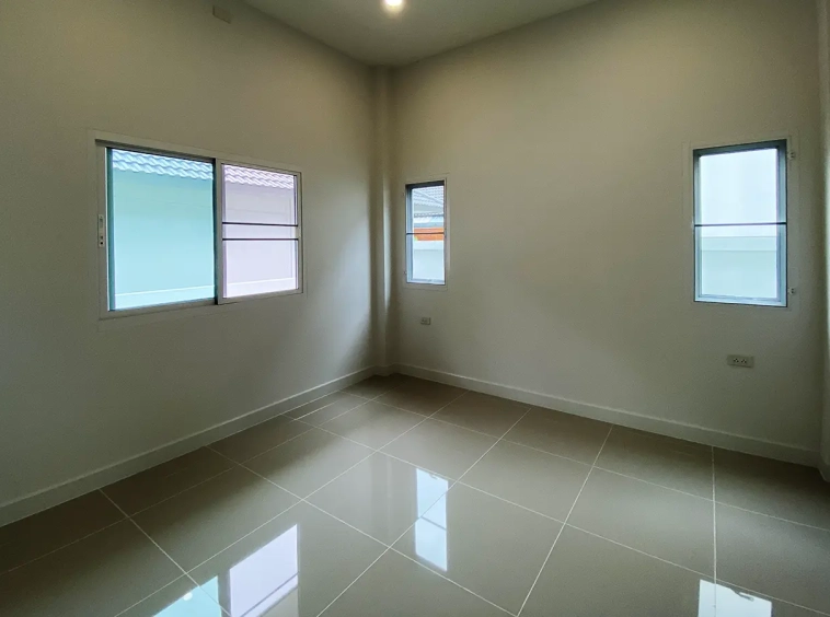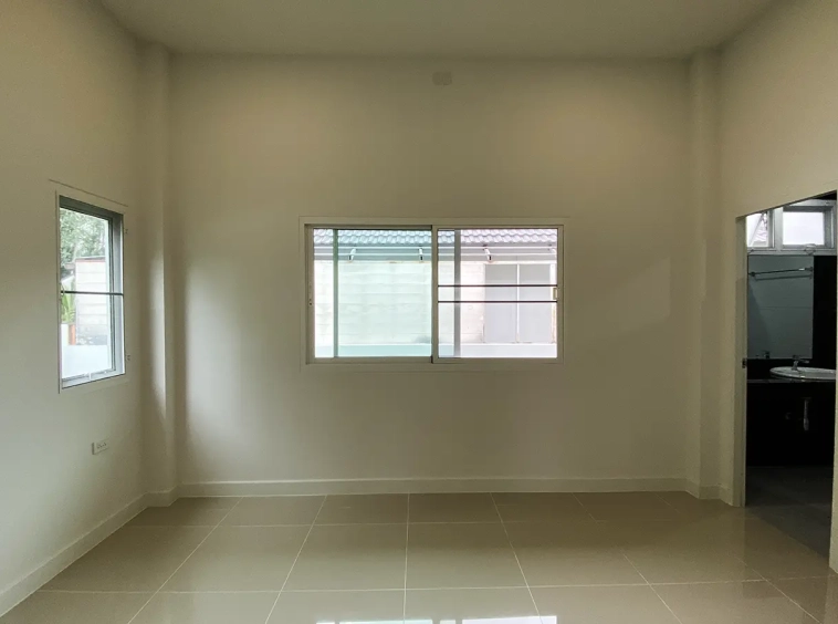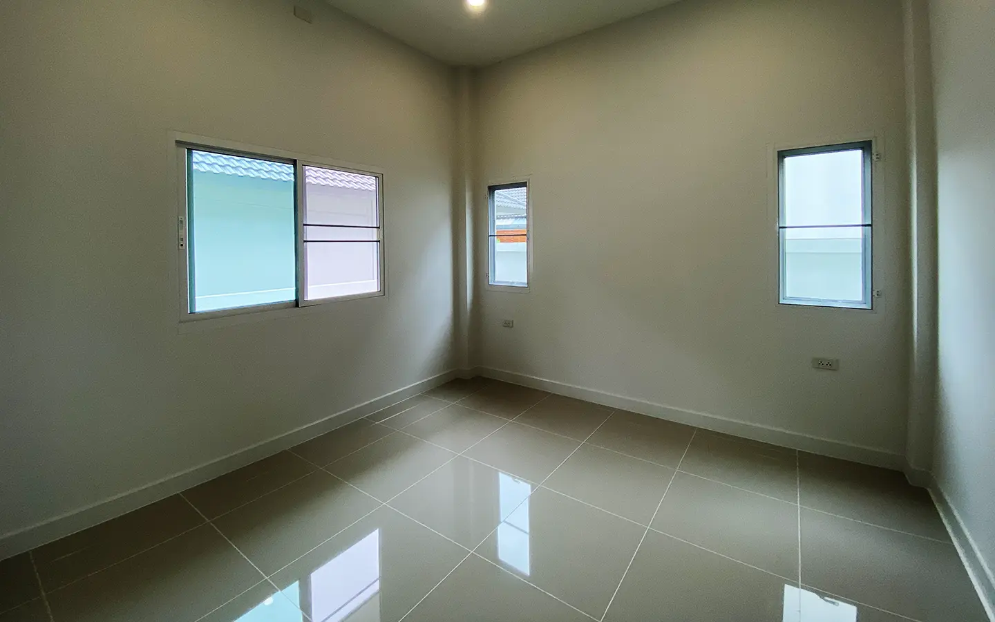 The house is in a small quiet estate of only 15 houses. There is a covered car park with built-in storage cupboards. Inside, the living room is nice and airy with tall ceilings. The house is north-facing and has been specifically designed for good airflow. There are 3 bedrooms with the master bedroom having ensuite and the other two bedrooms sharing a family/guest bathroom. The bathrooms are modern and spacious. There is a designated covered Thai kitchen at the rear of the house with a worktop with a sink and space for hobs. Decent size garden surrounds the 72 sqw house. A lovely designed home with a nice neighbourhood and in a good location.