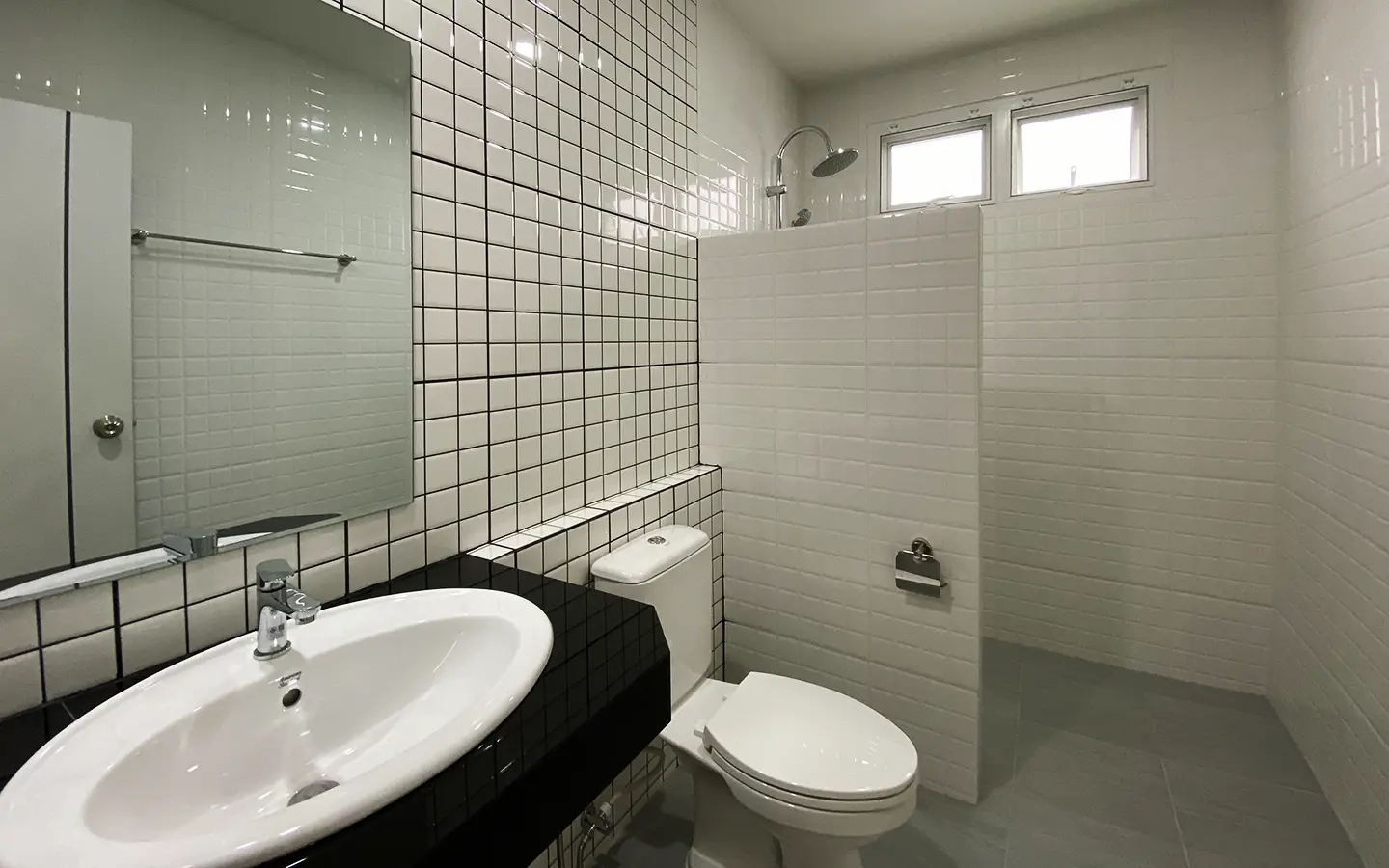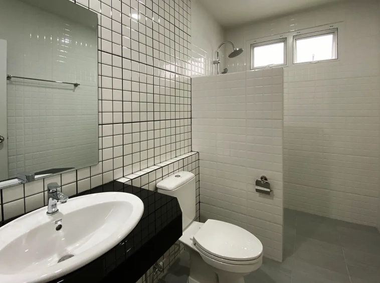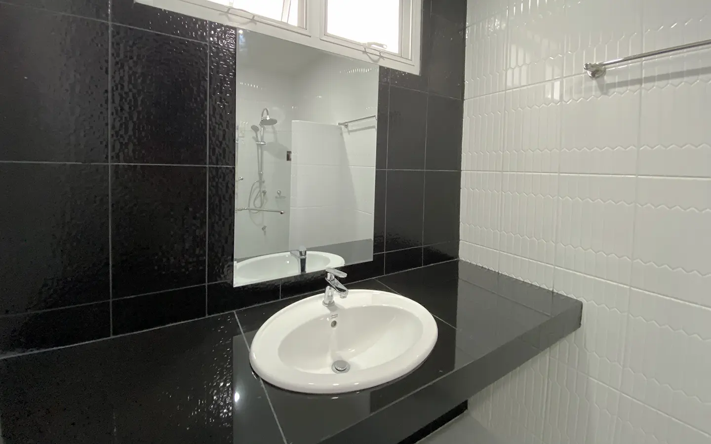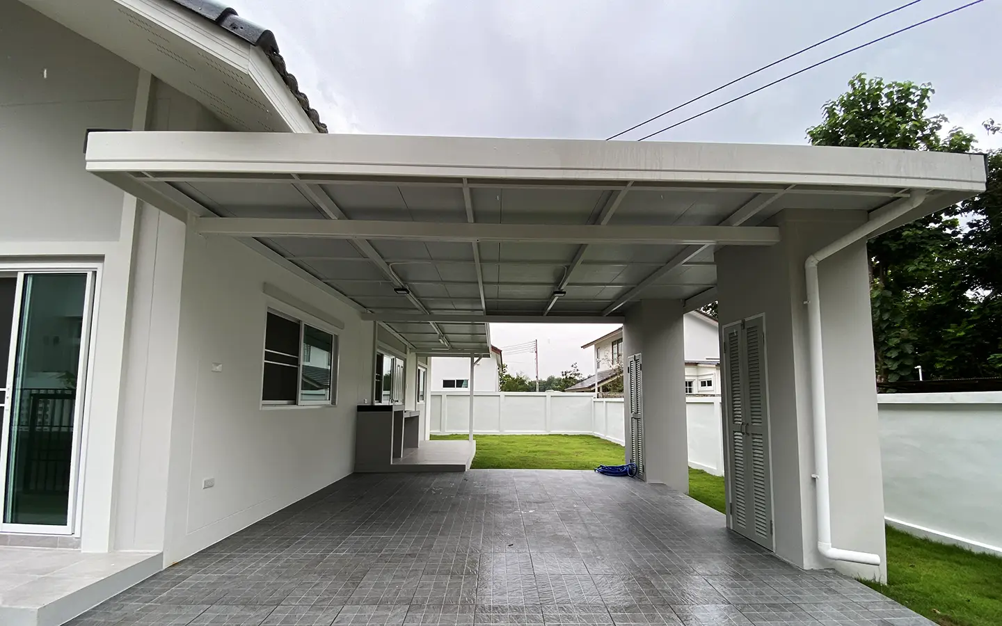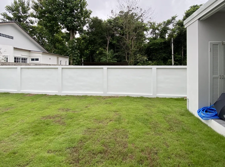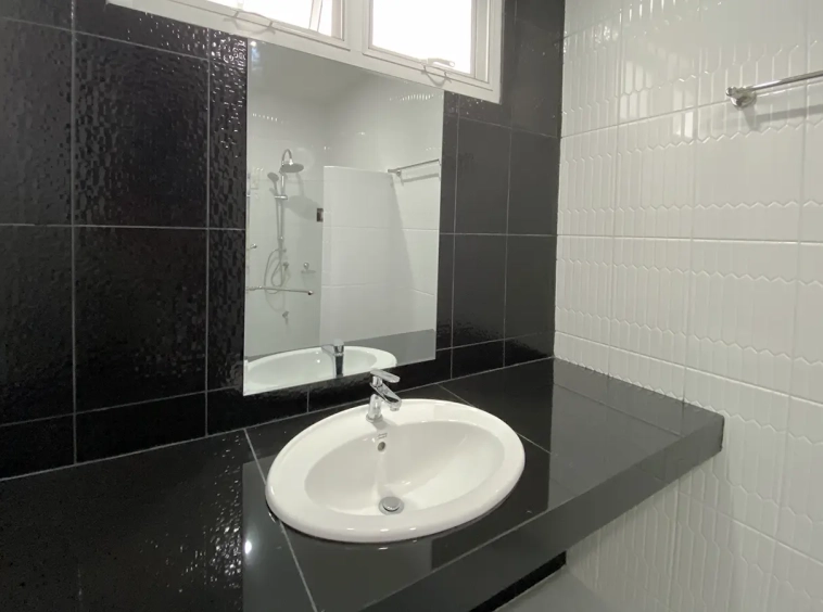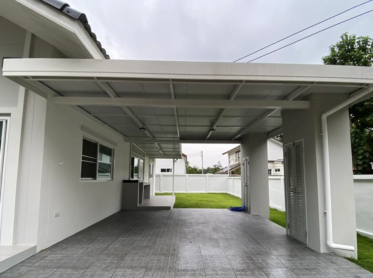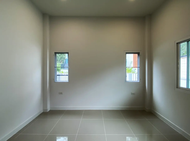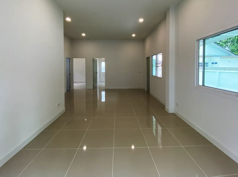 The house is in a small quiet estate of only 15 houses. There is a covered car park with built-in storage cupboards. Inside, the living room is nice and airy with tall ceilings. The house is north-facing and has been specifically designed for good airflow. There are 3 bedrooms with the master bedroom having ensuite and the other two bedrooms sharing a family/guest bathroom. The bathrooms are modern and spacious. There is a designated covered Thai kitchen at the rear of the house with a worktop with a sink and space for hobs. Decent size garden surrounds the 72 sqw house. A lovely designed home with a nice neighbourhood and in a good location.