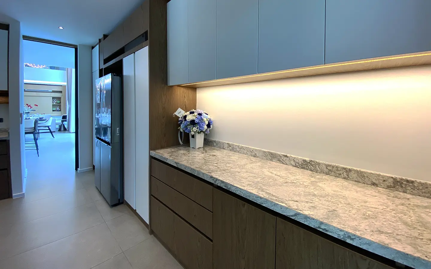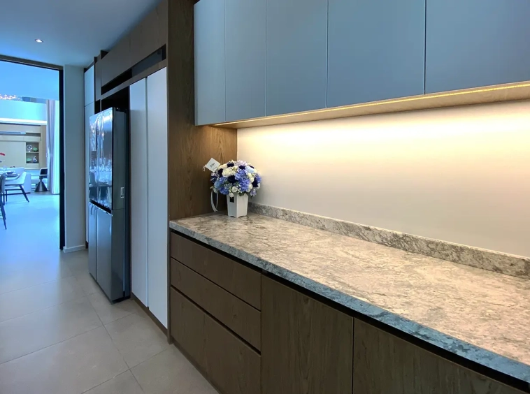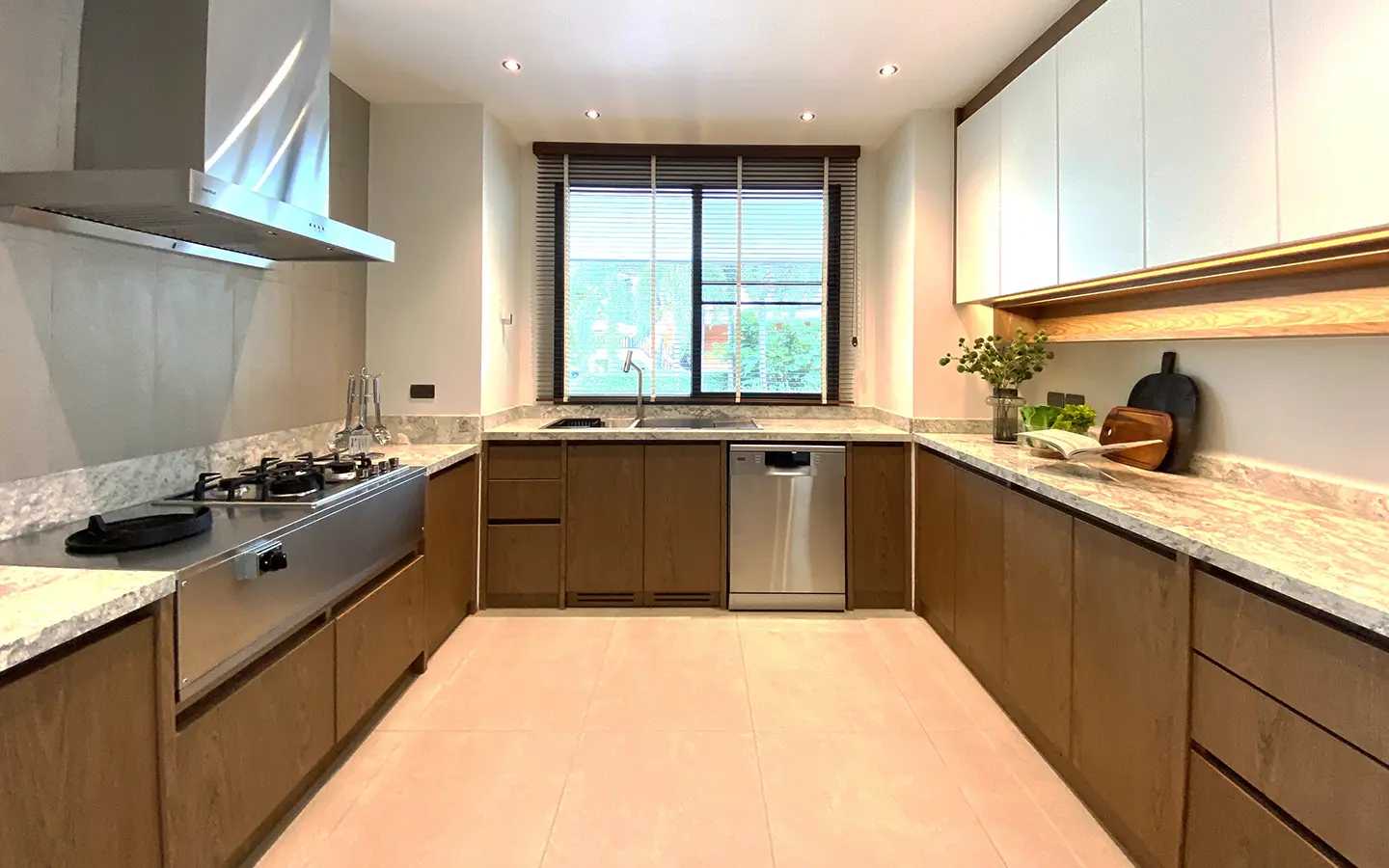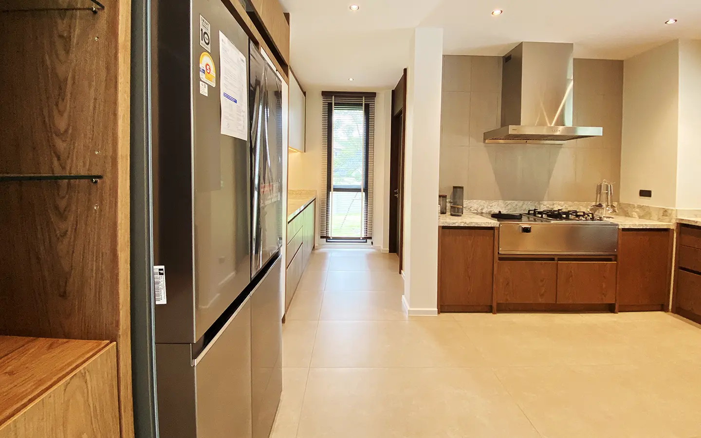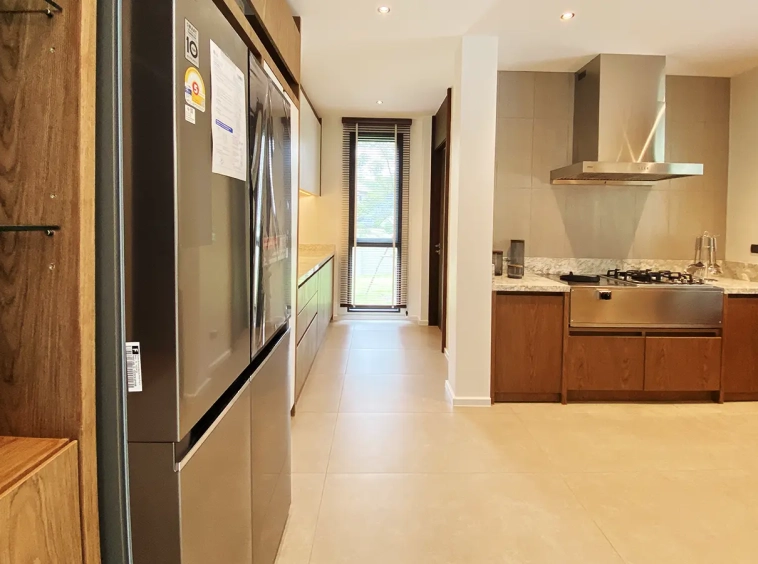 As you enter through the main gate, you’ll find a spacious living room with a high ceiling and full-height glass doors that open out to the outdoor terrace and private swimming pool. To the right of the living area is the dining space and pantry, complete with an island/breakfast bar, oven, microwave, and refrigerator. Towards the back is the main kitchen, fitted with built-in cabinetry, drawers for storage, a dishwasher, and a second refrigerator. This kitchen also has a door leading to the carport.