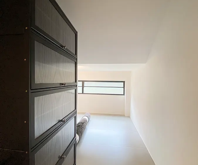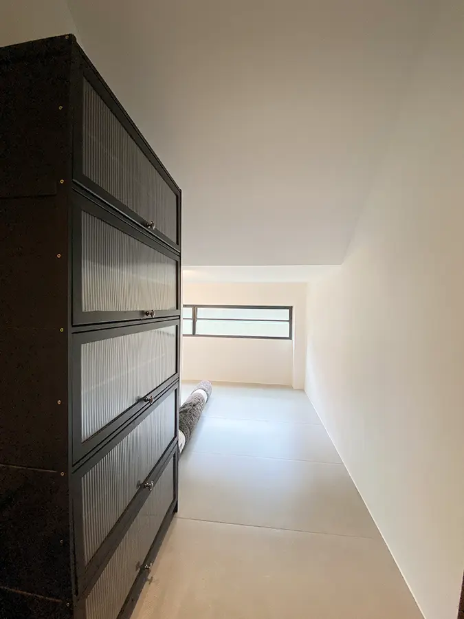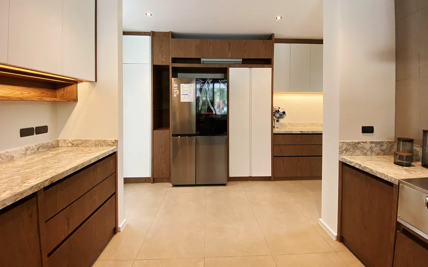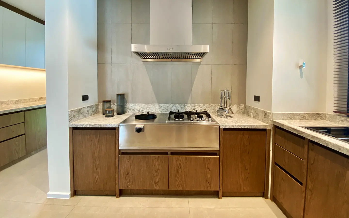 As you enter through the main gate, you’ll find a spacious living room with a high ceiling and full-height glass doors that open out to the outdoor terrace and private swimming pool. To the right of the living area is the dining space and pantry, complete with an island/breakfast bar, oven, microwave, and refrigerator. Towards the back is the main kitchen, fitted with built-in cabinetry, drawers for storage, a dishwasher, and a second refrigerator. This kitchen also has a door leading to the carport.