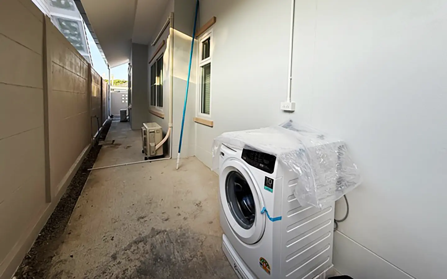 Behind the house, there’s an outdoor sitting and dining area, a laundry corner, and a small utility room that houses the water pump and pool filtration system. While there’s no lawn, the home enjoys a green garden view from the open space beyond the fence, creating a sense of connection with nature and a pleasant open atmosphere.