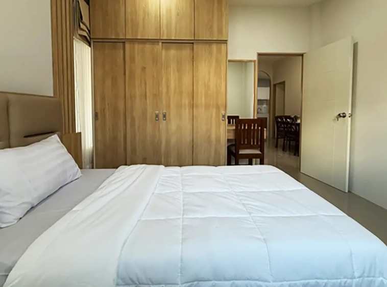 As you enter through the gate, there is parking space for two cars. The swimming pool with jacuzzi sits at the front — a beautiful spot to relax, entertain guests, or spend quality time with family. Inside, the living room welcomes you with warm lighting and a modern layered ceiling design that creates a cozy and homely feeling. The dining area flows naturally into the kitchen, which comes equipped with an electric stove and hood, ready for everyday cooking.