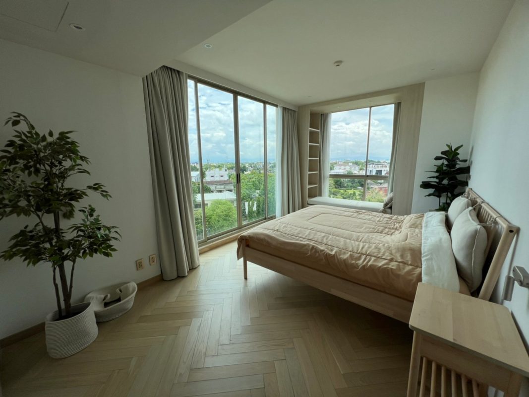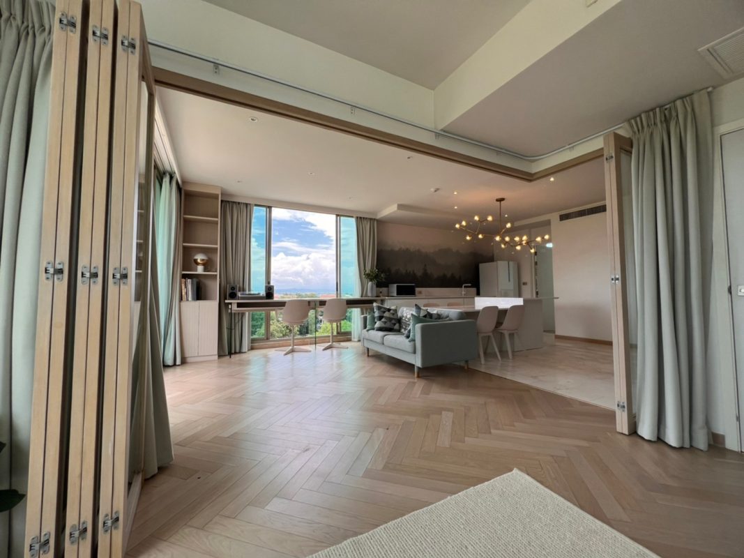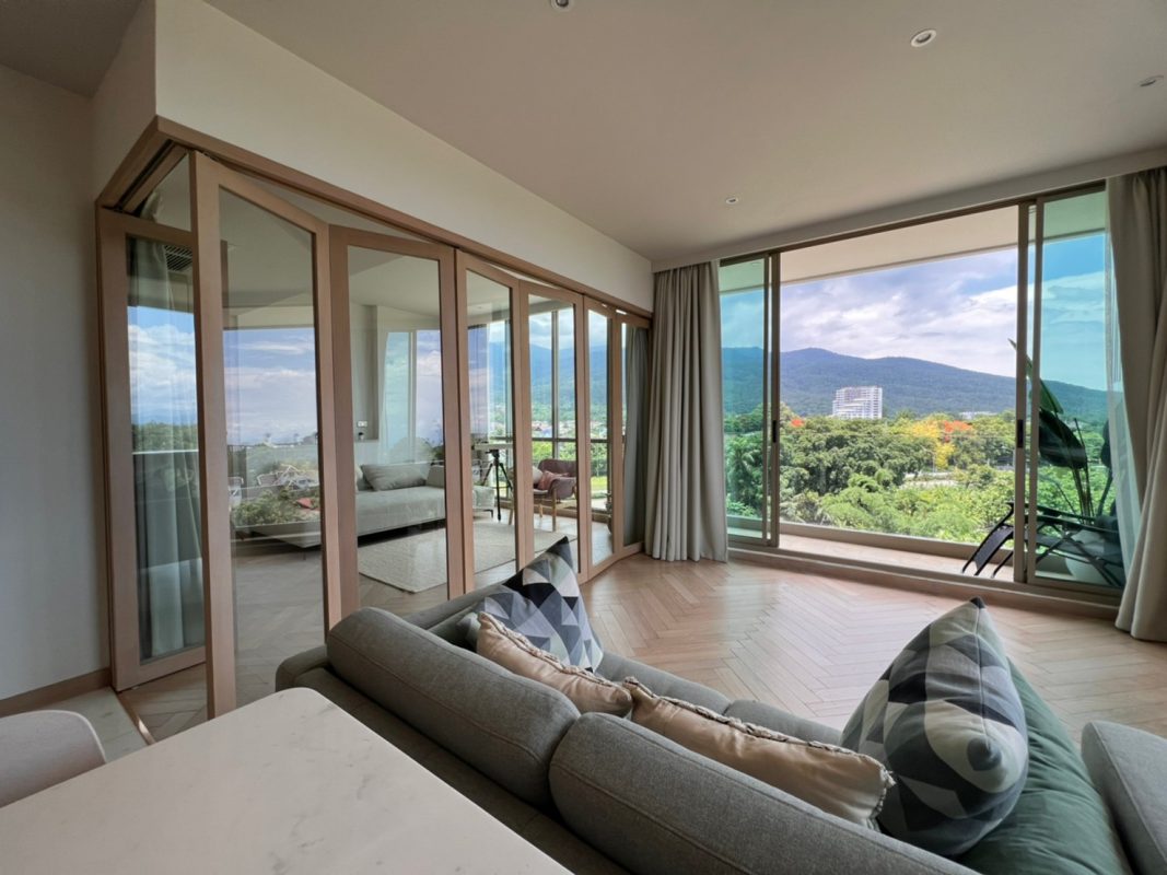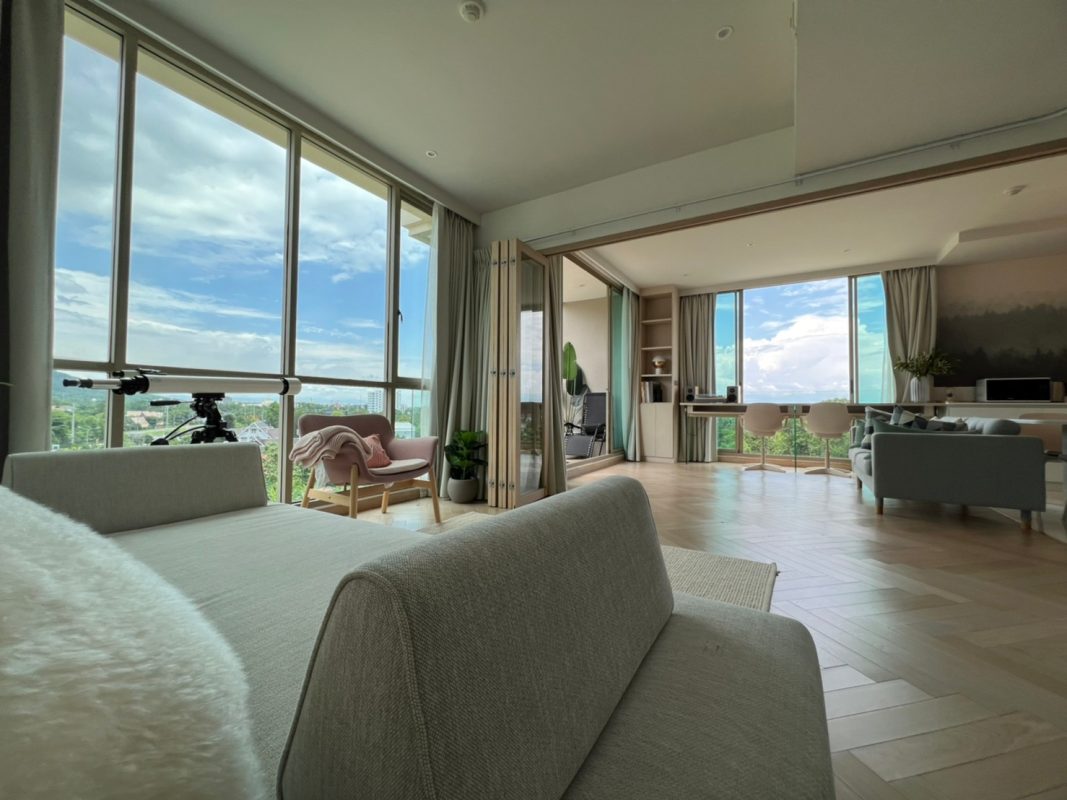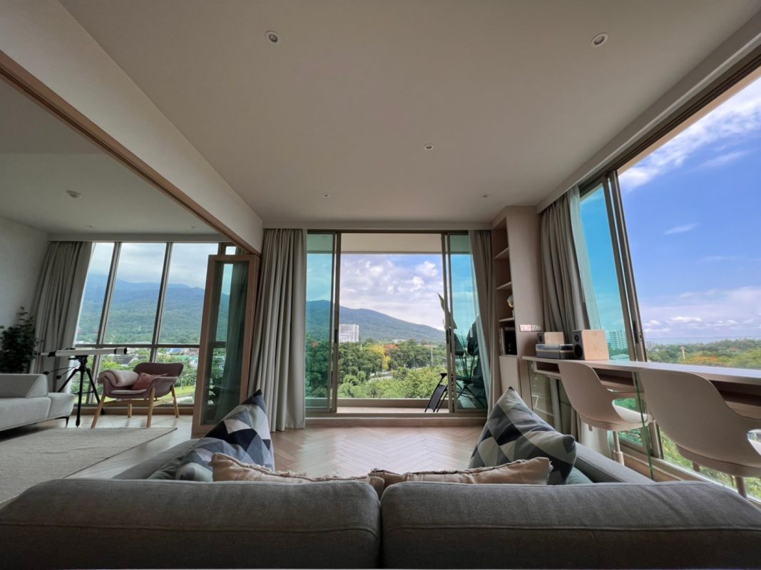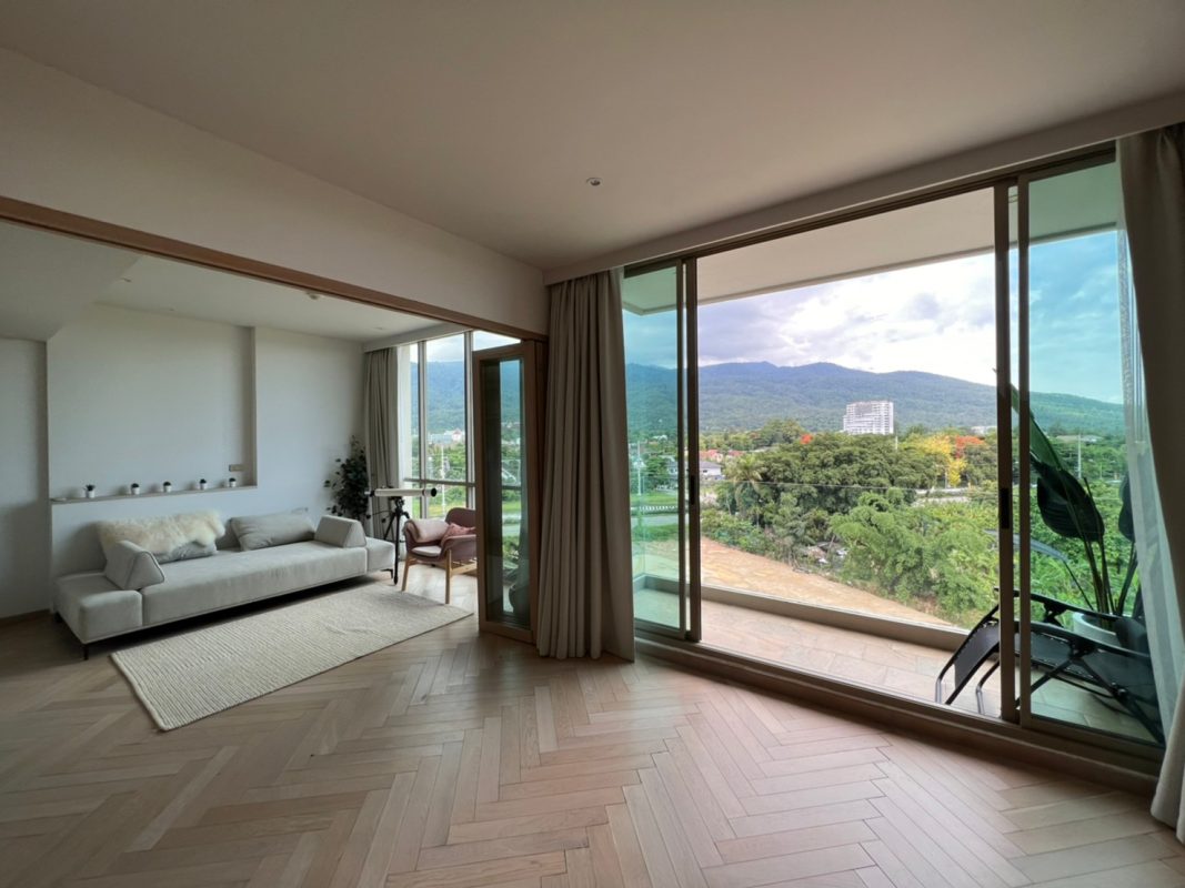 To the right, there is the master bedroom, ensuite with a walking closet and access to the terrace with a view of the mountain. The unit is well furnished with high-quality furniture and fittings as well as lighting. The project offers to park, swimming pool, fitness room, beautiful garden and a rooftop garden where one can enjoy a sundowner with a view of Doi Suthep mountain and mini golf.
