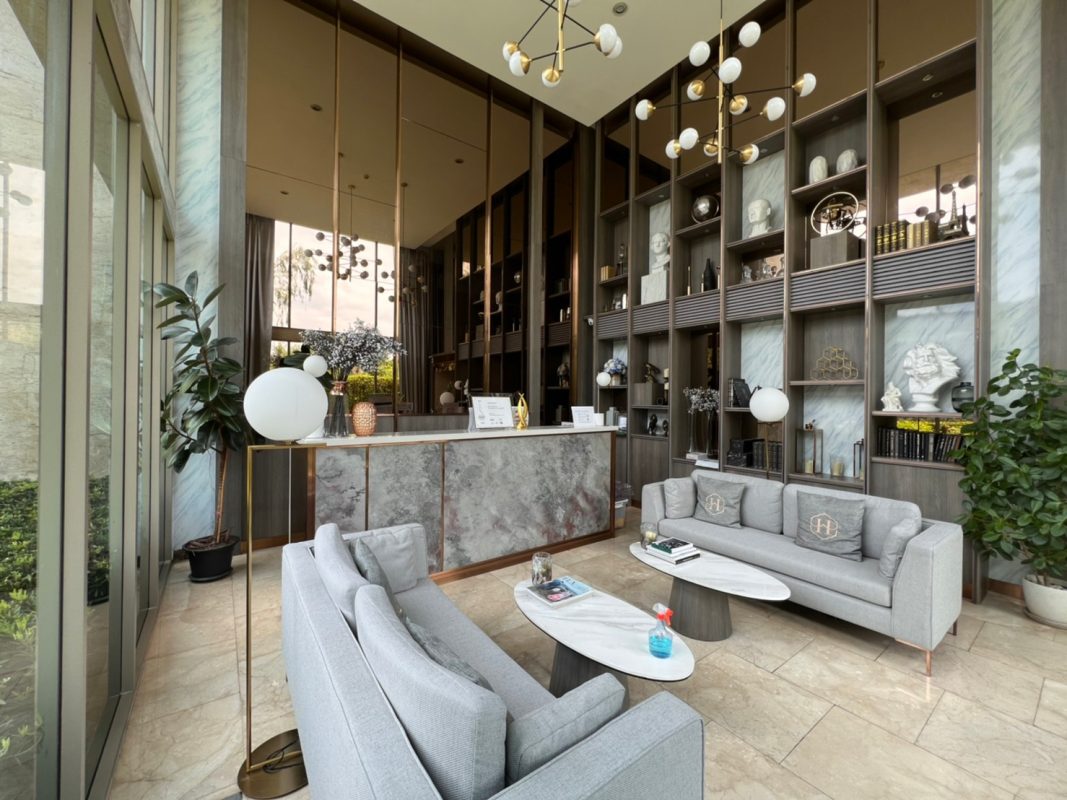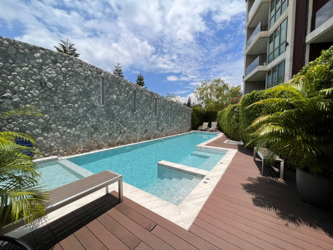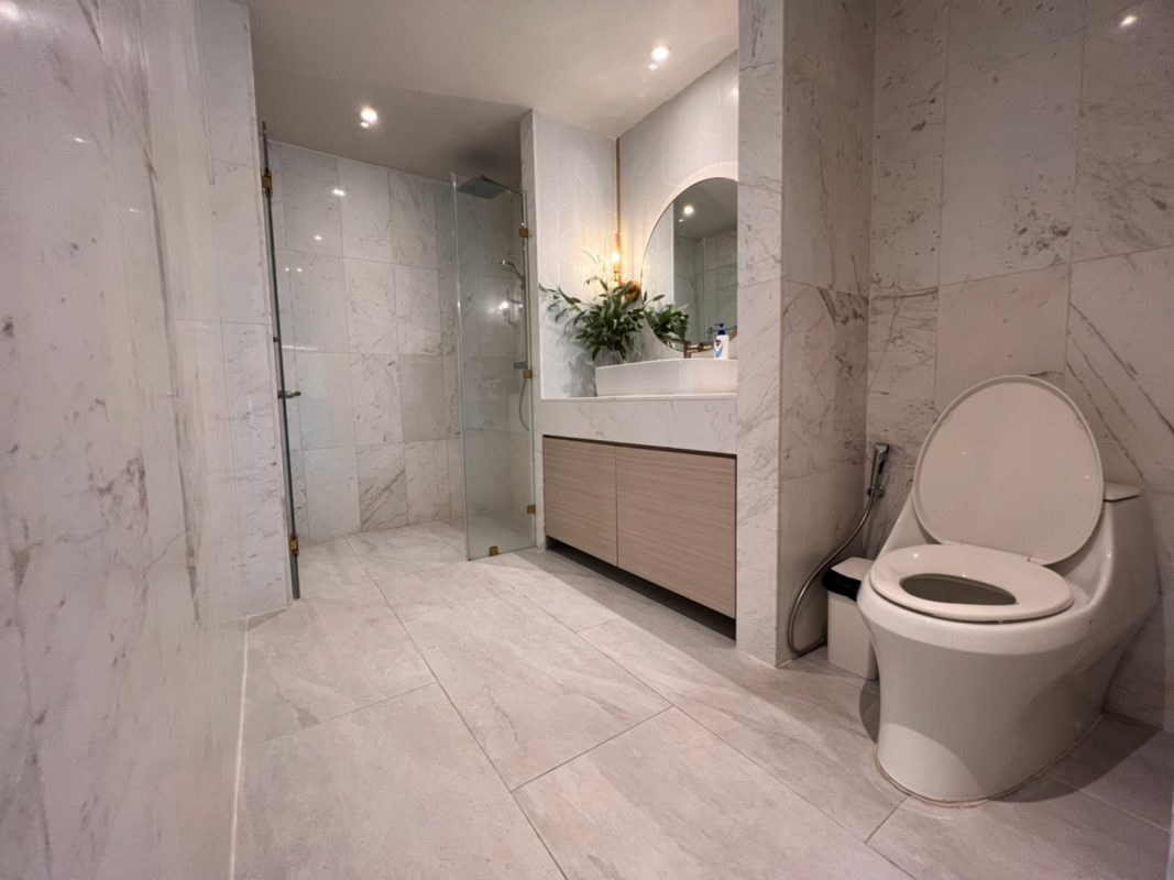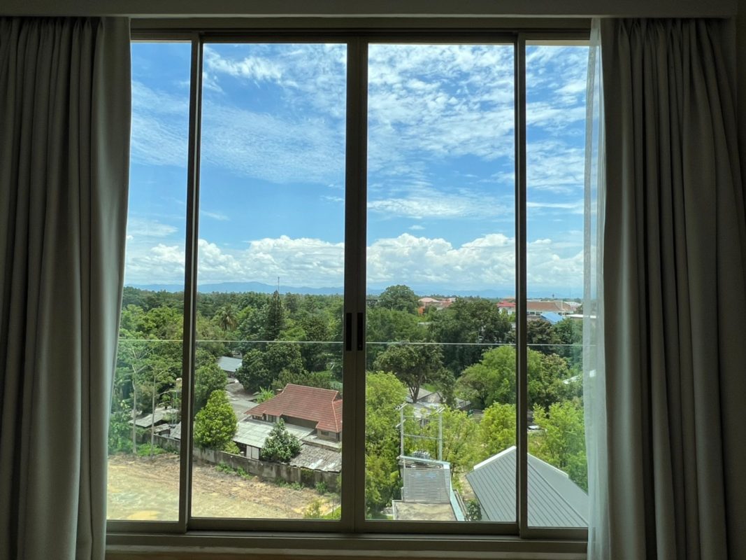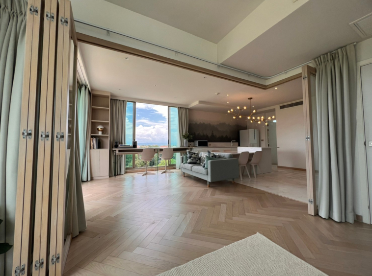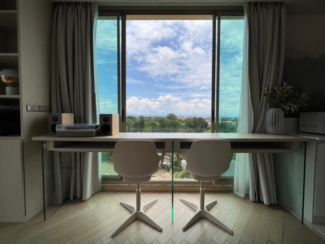 To the right, there is the master bedroom, ensuite with a walking closet and access to the terrace with a view of the mountain. The unit is well furnished with high-quality furniture and fittings as well as lighting. The project offers to park, swimming pool, fitness room, beautiful garden and a rooftop garden where one can enjoy a sundowner with a view of Doi Suthep mountain and mini golf.