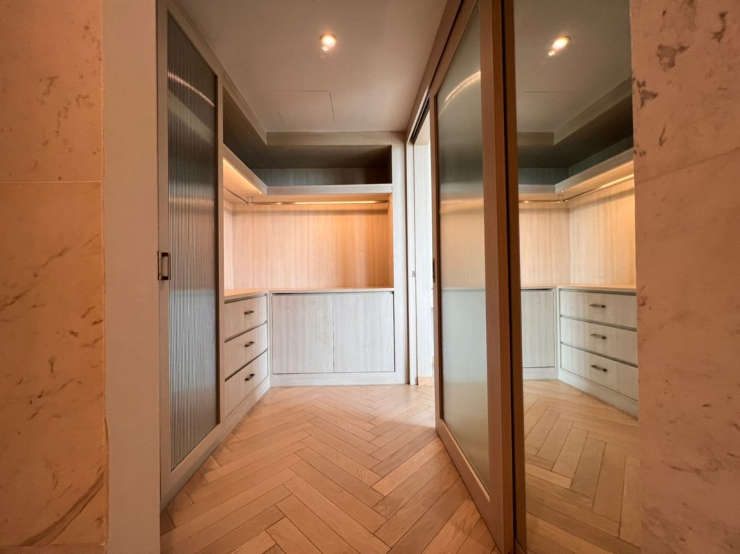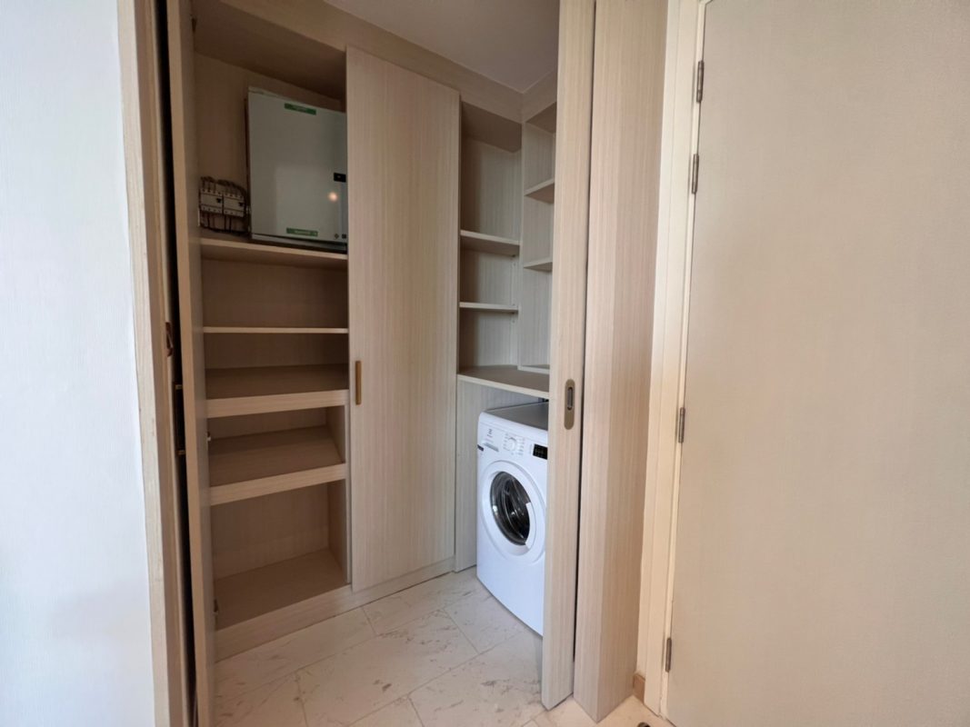 The unit is on the 7th floor and is elaborately furnished. To the right is a storage room with a washing machine, guest bathroom, kitchen with dining table and sitting room with access to the terrace and slide door access to bedroom one/ currently use as part of the living room.