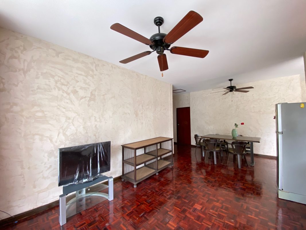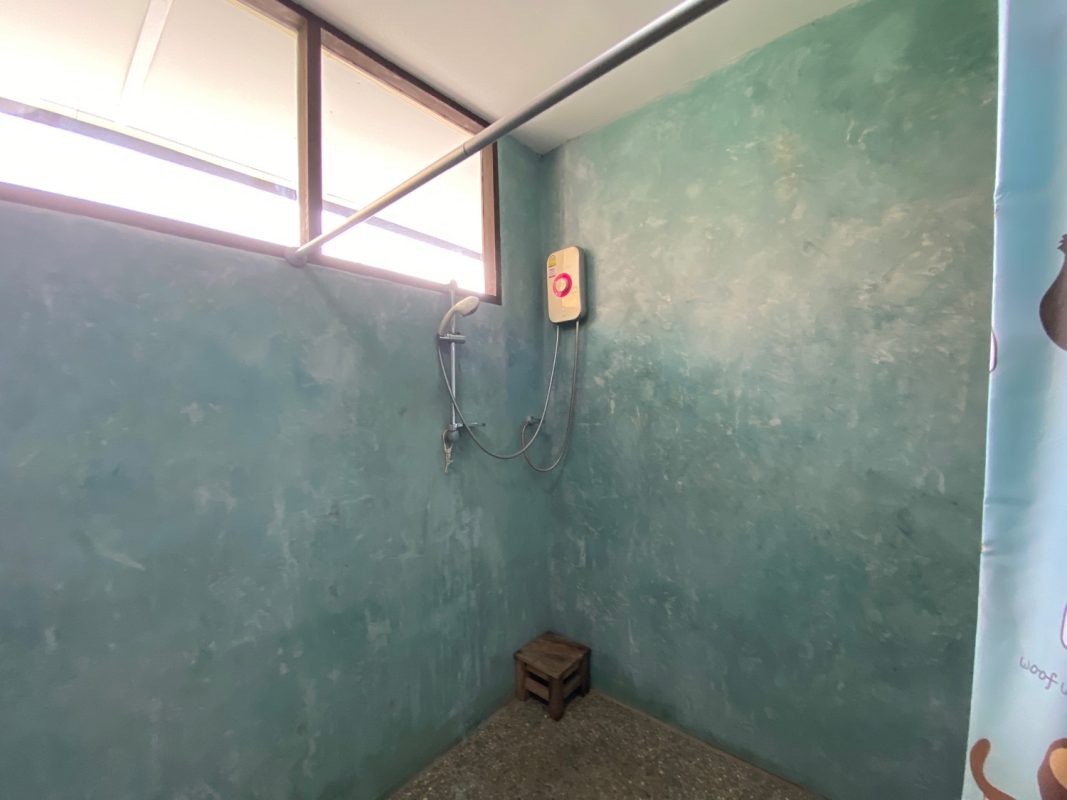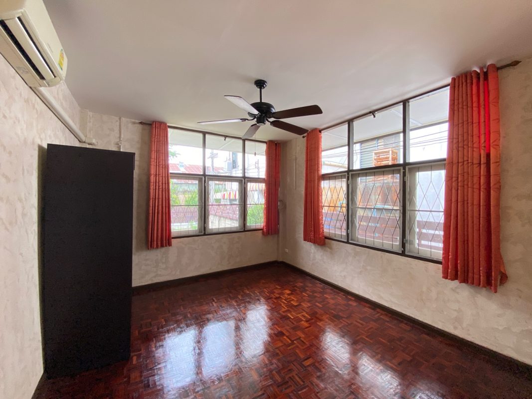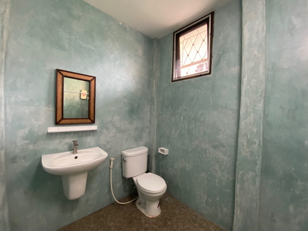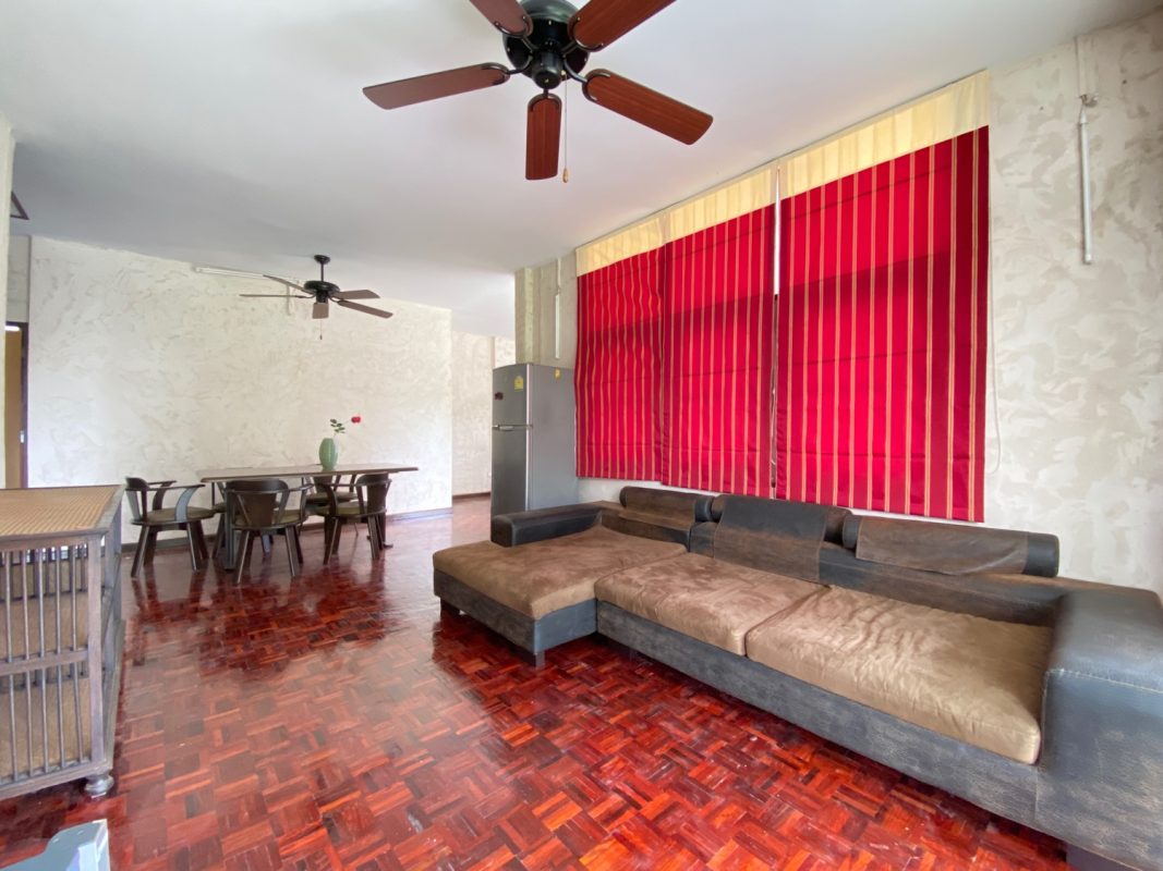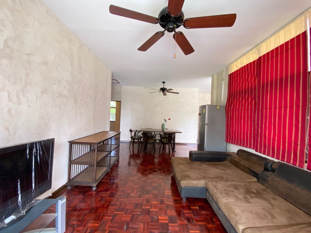 The house sits on a good-sized plot of land, fenced in and has a driveway to the covered carport where the washing machine is kept. A cute covered porch with seating is at the entrance of the house. Inside, the floor is of red hardwood floor, tall ceiling and all rooms are fitted with ceiling fans and A/C. There is a living room, dining area and kitchen with access to the washing area at the back. Two bedrooms are ensuite while the third shares a guest bathroom. The third bedroom could also be used as an office space. Furniture will be provided as per tenant requests. Rent does not include a gardener.