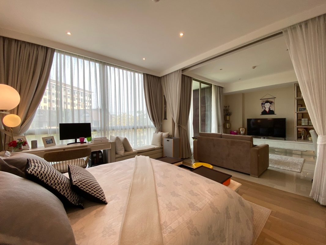 The unit is on the second floor from the beautiful lobby. From the entrance on the left is the storage cupboard where the washing machine is also kept. The dining table and the built-in Western kitchen. The sitting room has full-length glass door access to the terrace. There is a glass sliding door and curtain to separate the sitting room from the bedroom for privacy. The bedroom also has full-length glass windows providing good natural light as well as a desk and reading area. A dressing table, a built-in wardrobe unit and then there is the marble bathroom with a bathtub. The entire apartment oozes class and a luxurious feel. Tastefully furnished in a natural tone and with all high-quality fittings, this ready-to-move-in apartment needs to be viewed to truly appreciate.