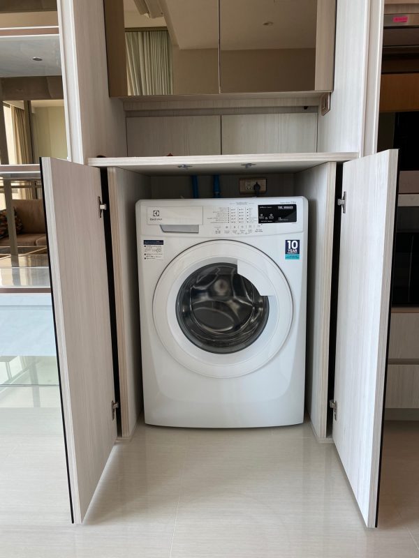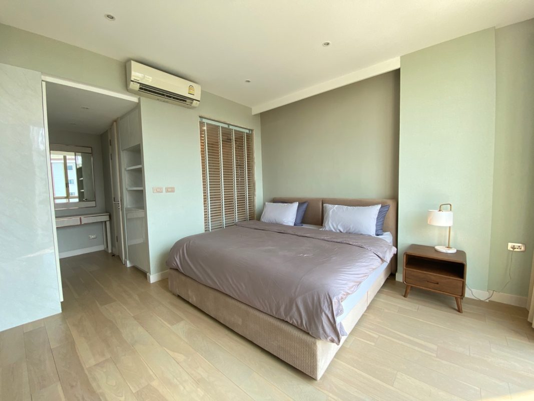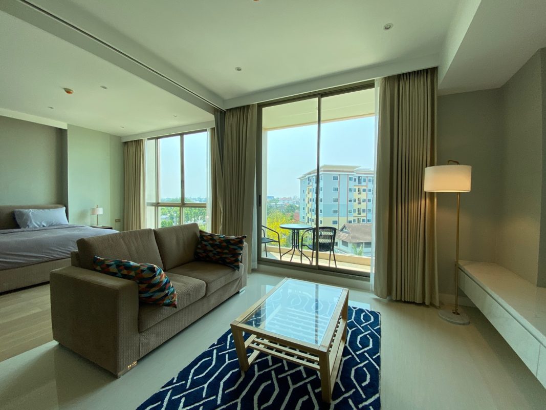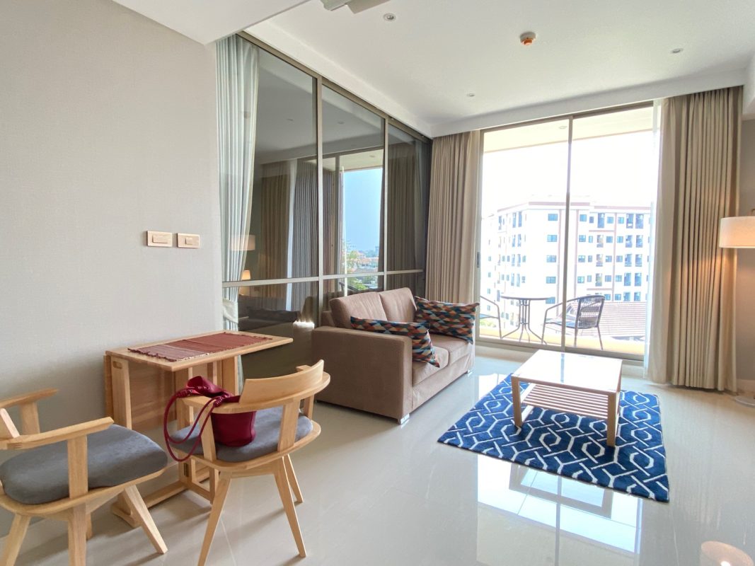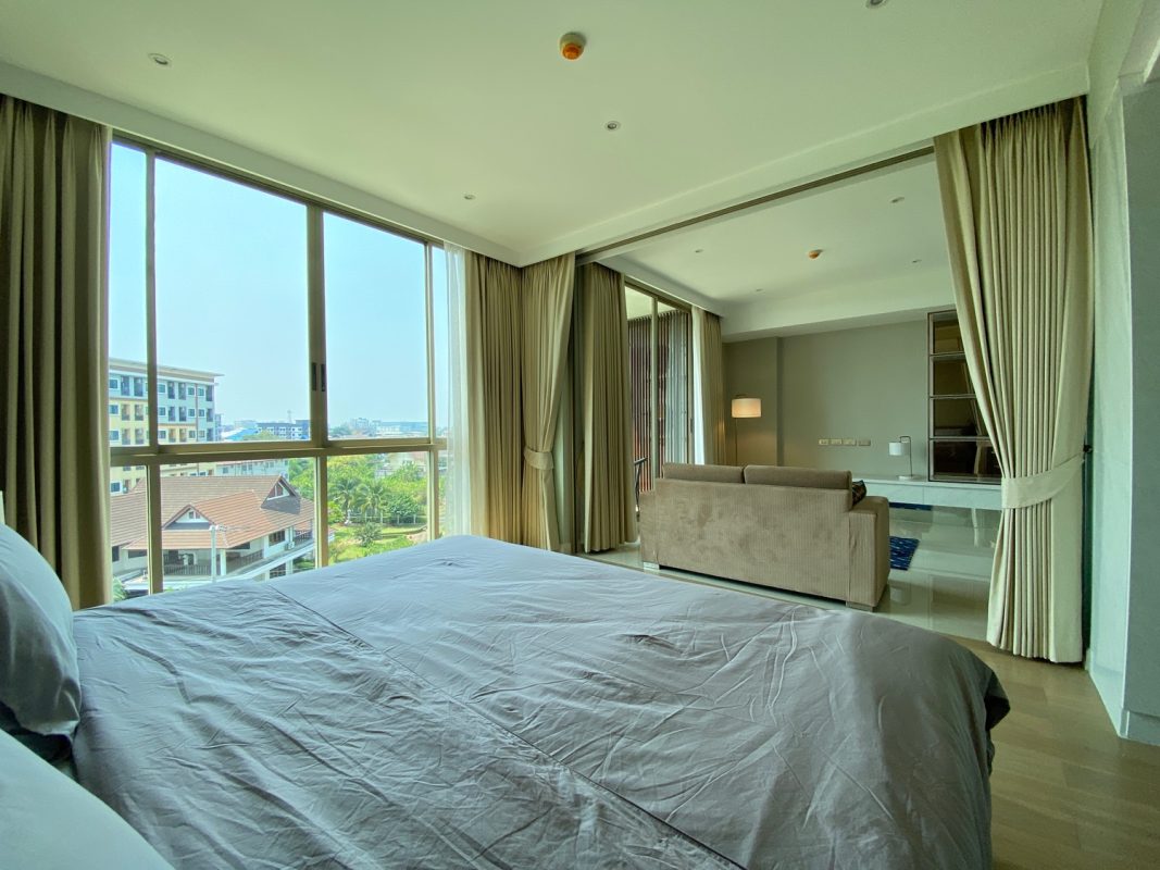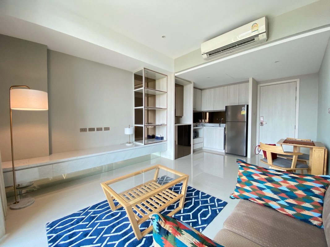 The unit is on the 5th floor with a city view so not too hot afternoon sun. To the left is a fully built-in kitchen with a stove, hood, microwave, refrigerator and washing machine. The sitting room has access to the terrace. There is a glass sliding door between the sitting room and bedroom. The bedroom comes with a built-in closet and ensuite with a bathtub. The room is tastefully furnished with quality furniture and fittings. The building has a rooftop area with a mini driving range and stunning views of mountains and is perfect for a sundowner. The facilities include a swimming pool, fitness, a charming English country garden, parking and 24-hour security.
