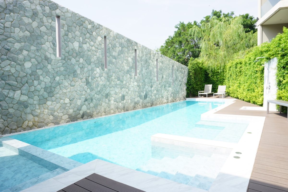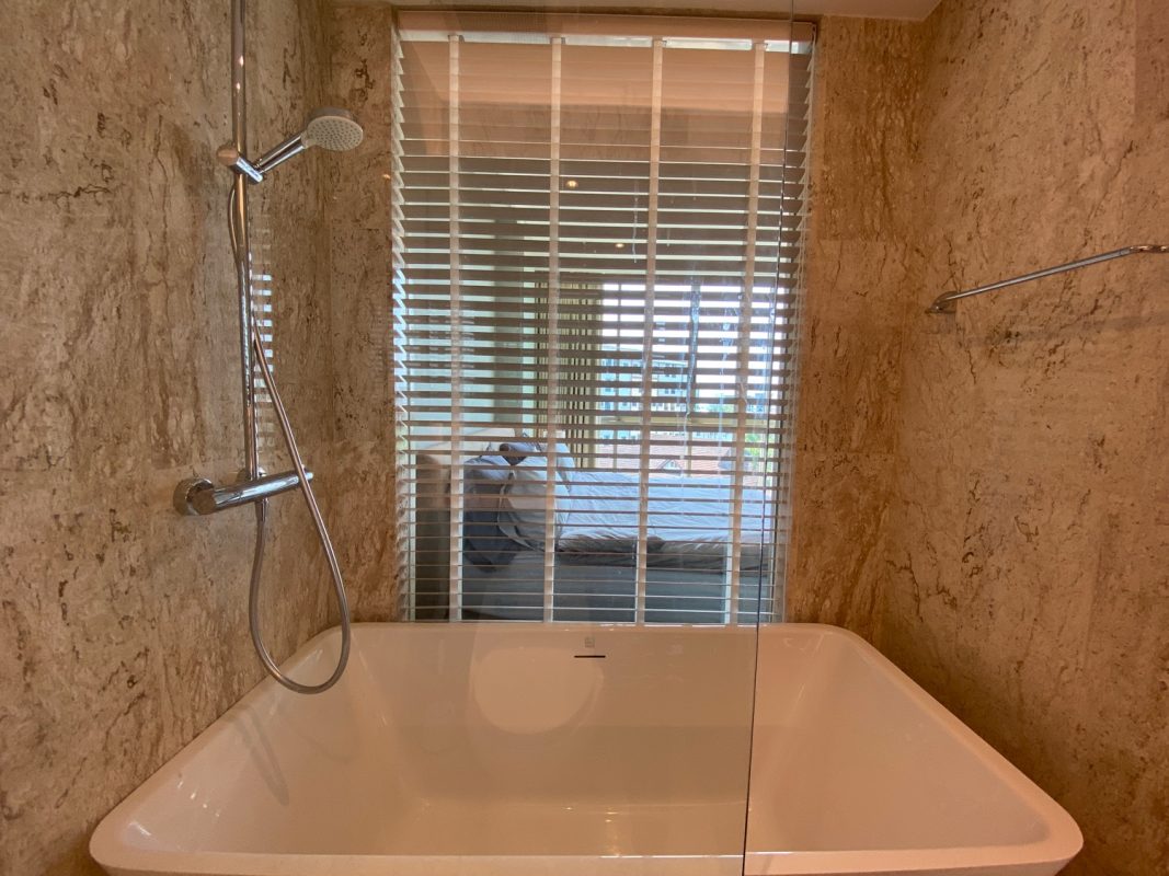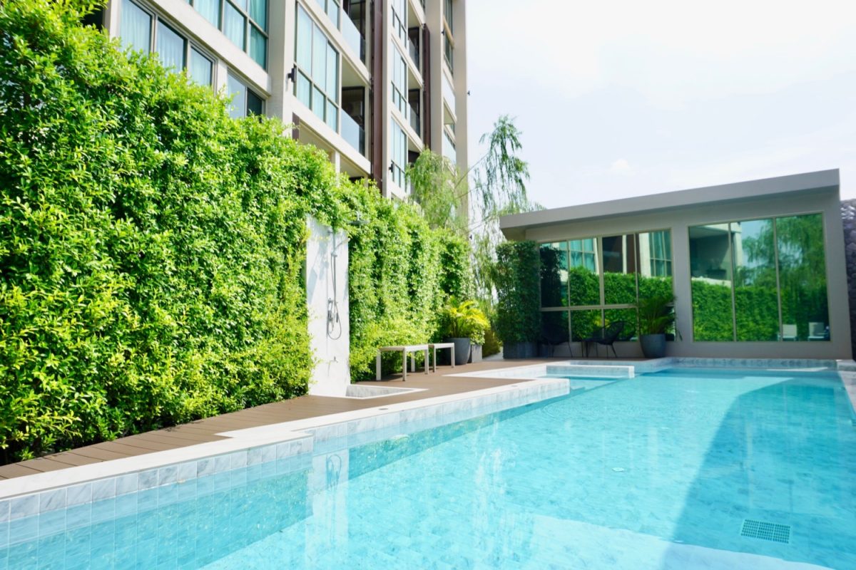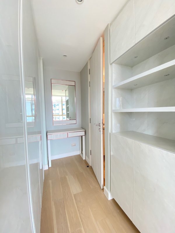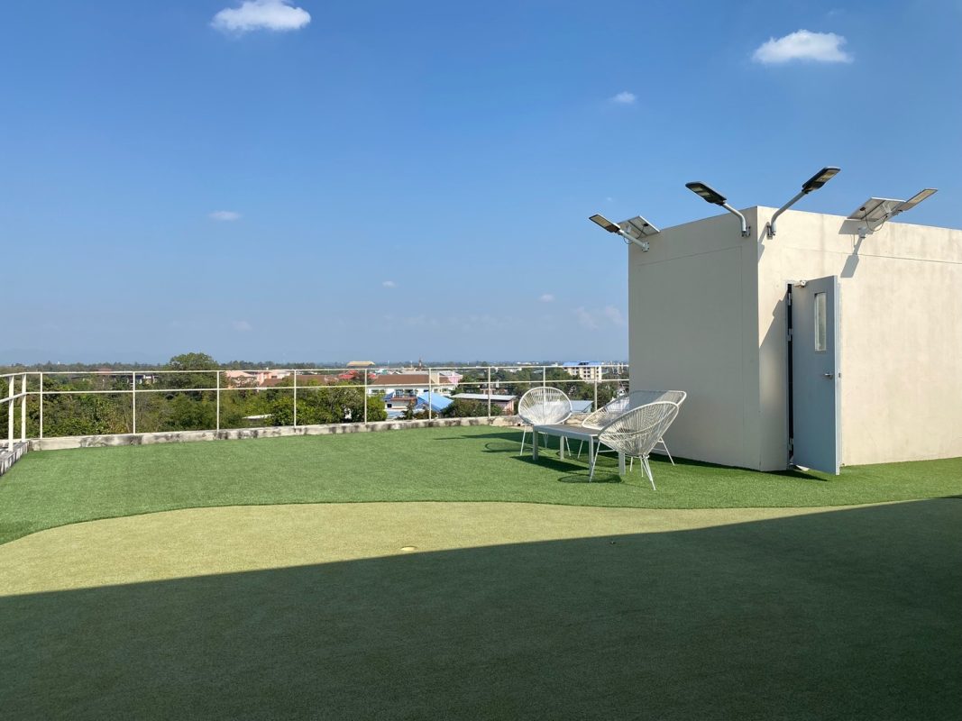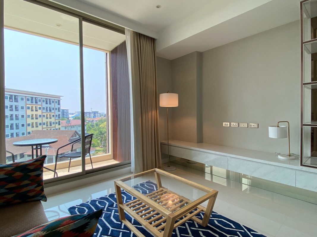 The unit is on the 5th floor with a city view so not too hot afternoon sun. To the left is a fully built-in kitchen with a stove, hood, microwave, refrigerator and washing machine. The sitting room has access to the terrace. There is a glass sliding door between the sitting room and bedroom. The bedroom comes with a built-in closet and ensuite with a bathtub. The room is tastefully furnished with quality furniture and fittings. The building has a rooftop area with a mini driving range and stunning views of mountains and is perfect for a sundowner. The facilities include a swimming pool, fitness, a charming English country garden, parking and 24-hour security.