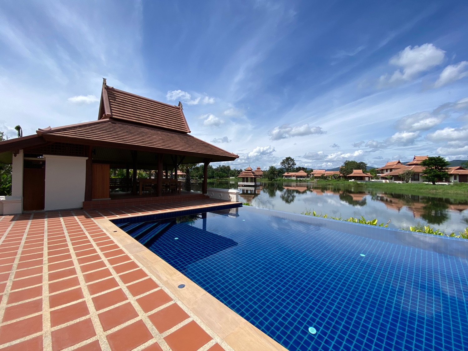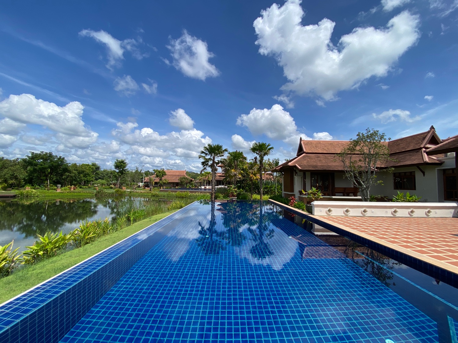 Custom designed by Chiang Mai own renown Lanna architect Ajarn Adul Heranya, this stunning 3 bedroom villa with infinity pool is for sale fully furnished in greenery area of Doi Saket, Chiang Mai. About 30 minutes drive from town center there are several restaurants, cafes, spa within short driving distance. Fresh market and hospital are also a short drive away. About 20 minutes drive to the neartest Rimping, about 30 minutes drive to town and 40 minutes to the airport.