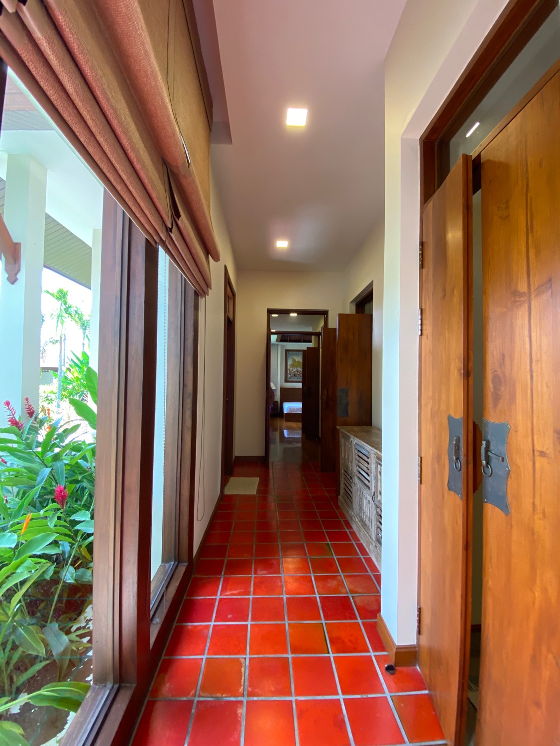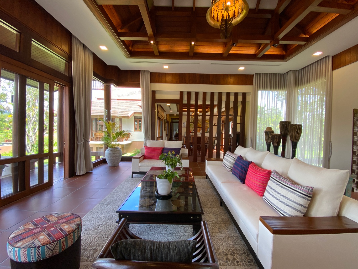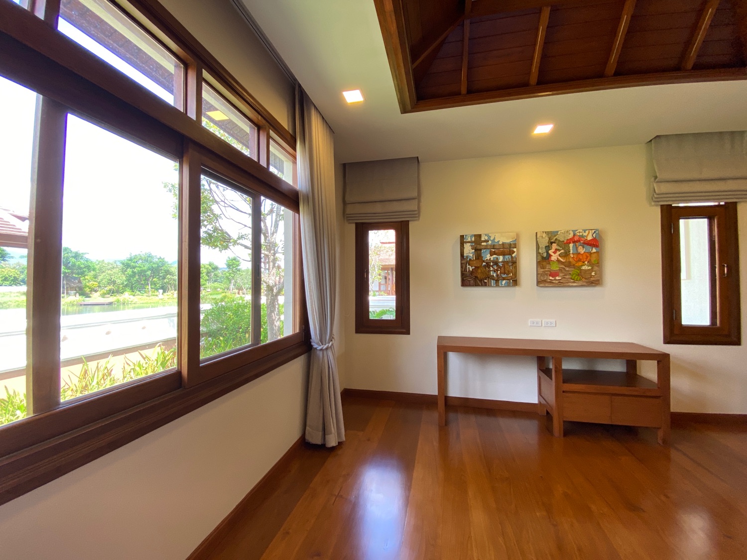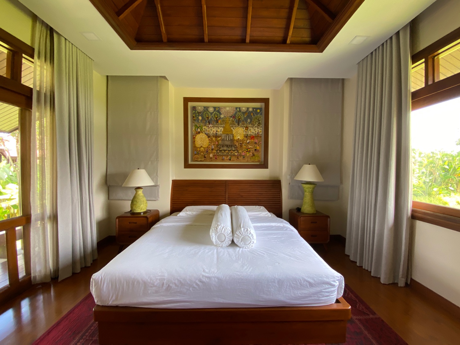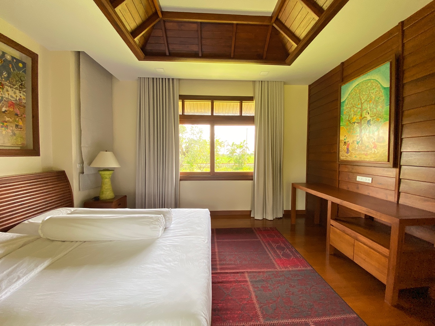This villa is one of the smaller ones with 4 bedroom, sits amidst large landscape garden, it comes with covered and open parking and 2 entrances, one main entrance and another one from the carport that leads to storage room and bedroom three on the south wing. Some steps leading up to the main entrance where the large sitting room awaits, overlooking the pool and lake beyond. Tall wood beams ceiling allowing for breeze, airflow and natural light. To the right is a dining room, fully fitted Western kitchen, and split level leading to master bedroom at the north wing and the second bedroom. All rooms are tastefully furnished featuring lot of wood fixture, furniture are either handpicked or custom made. From the pool to the left is a large sala for dining and relaxing. It comes with a pantry as well a shower and bathroom. The service area for the pool is underneath this sala.