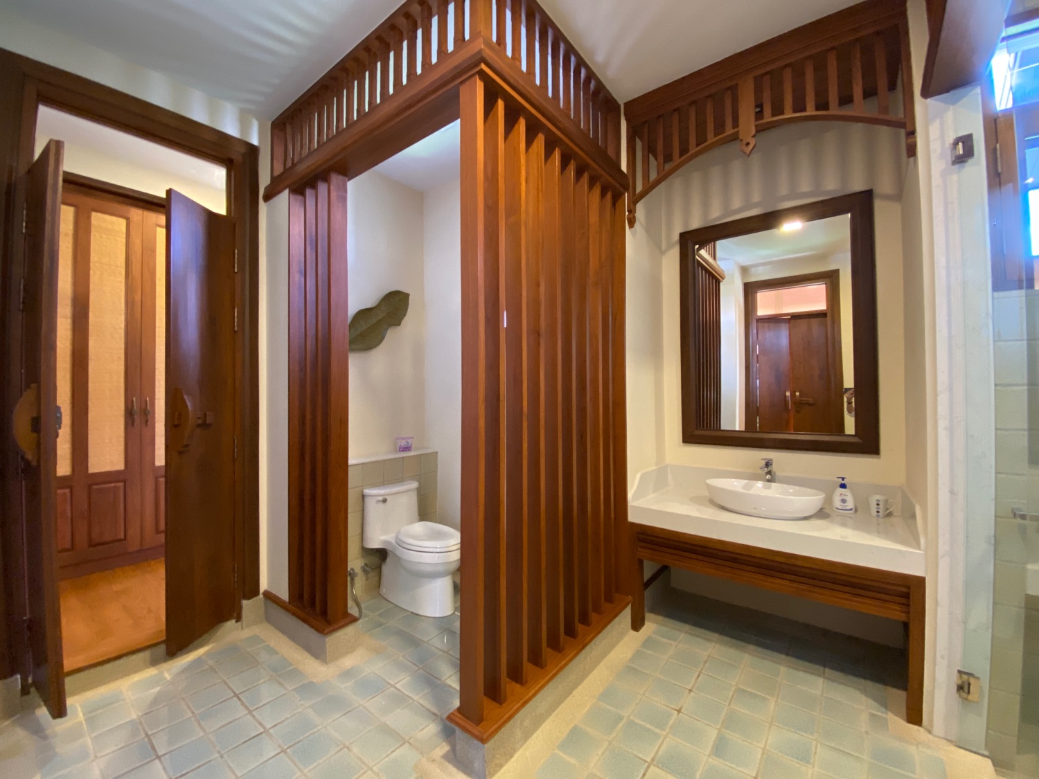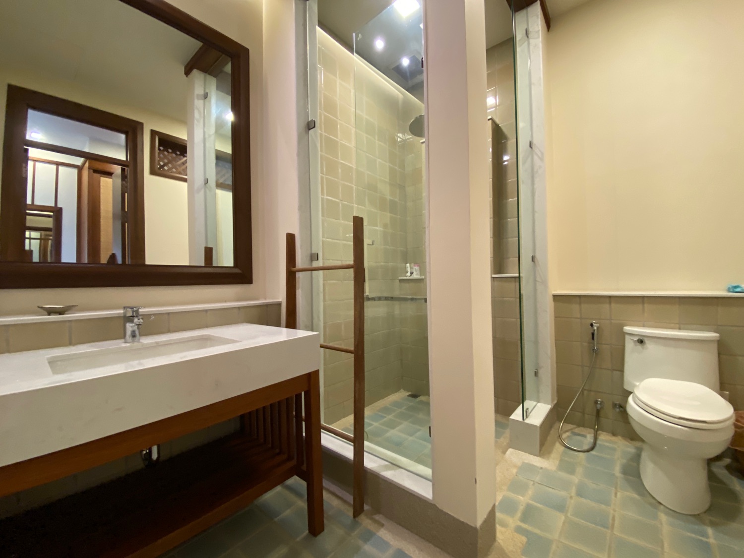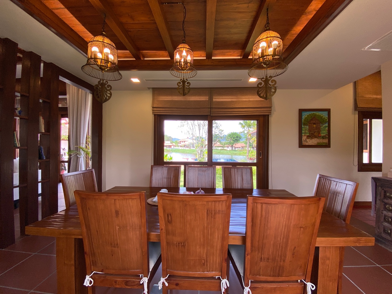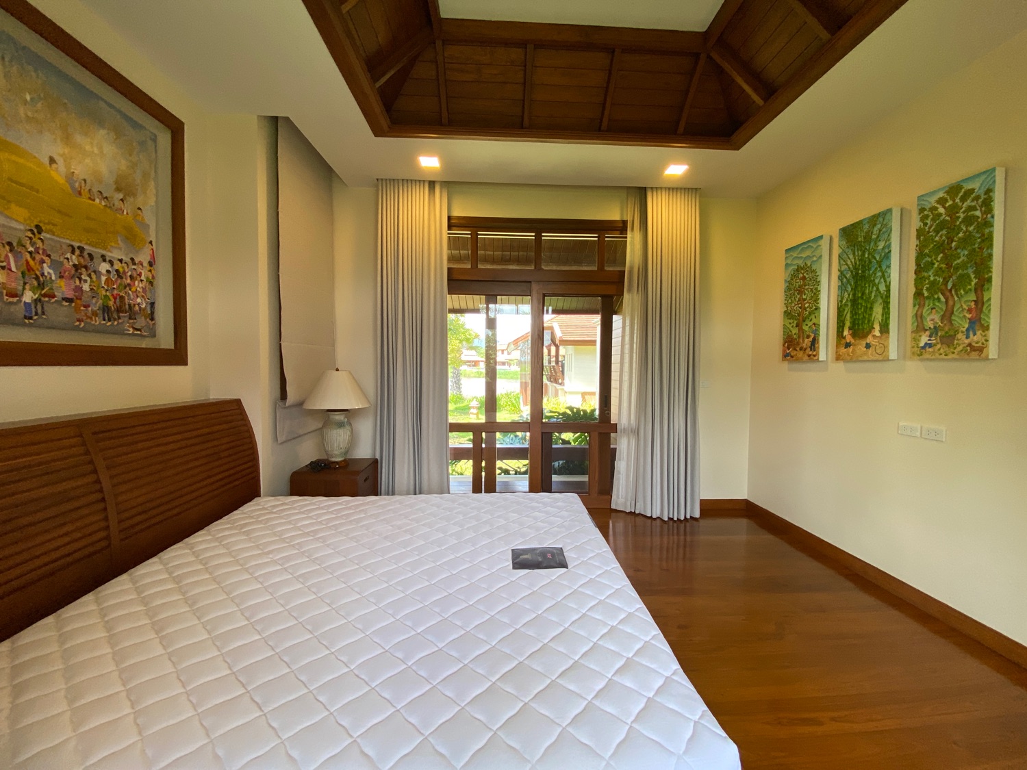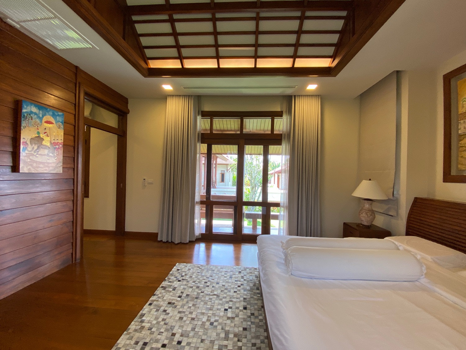 This villa is one of the smaller ones with 4 bedroom, sits amidst large landscape garden, it comes with covered and open parking and 2 entrances, one main entrance and another one from the carport that leads to storage room and bedroom three on the south wing. Some steps leading up to the main entrance where the large sitting room awaits, overlooking the pool and lake beyond. Tall wood beams ceiling allowing for breeze, airflow and natural light. To the right is a dining room, fully fitted Western kitchen, and split level leading to master bedroom at the north wing and the second bedroom. All rooms are tastefully furnished featuring lot of wood fixture, furniture are either handpicked or custom made. From the pool to the left is a large sala for dining and relaxing. It comes with a pantry as well a shower and bathroom. The service area for the pool is underneath this sala.
