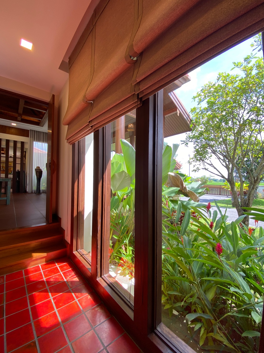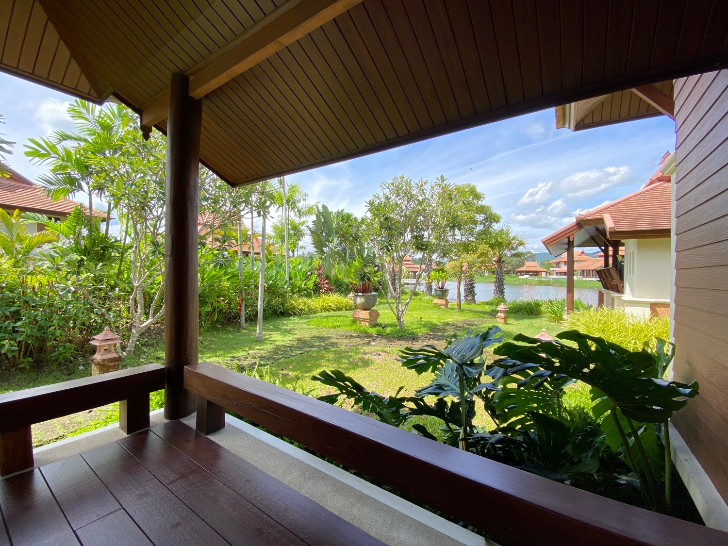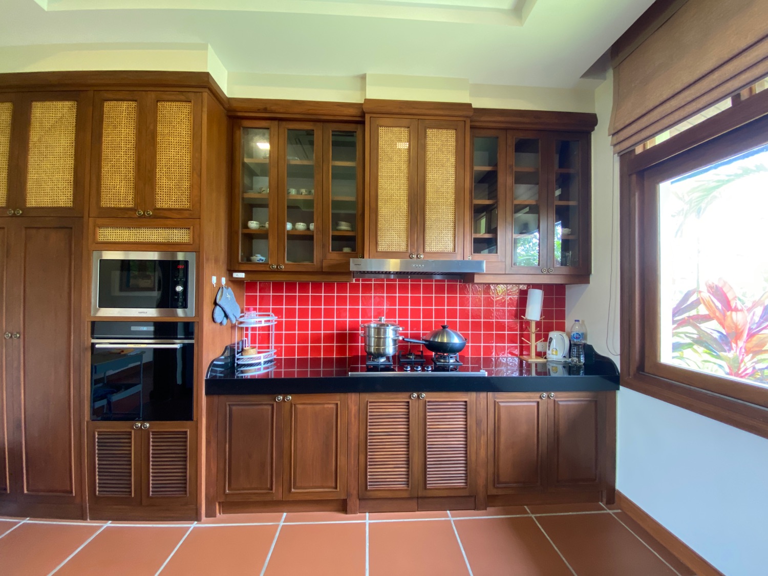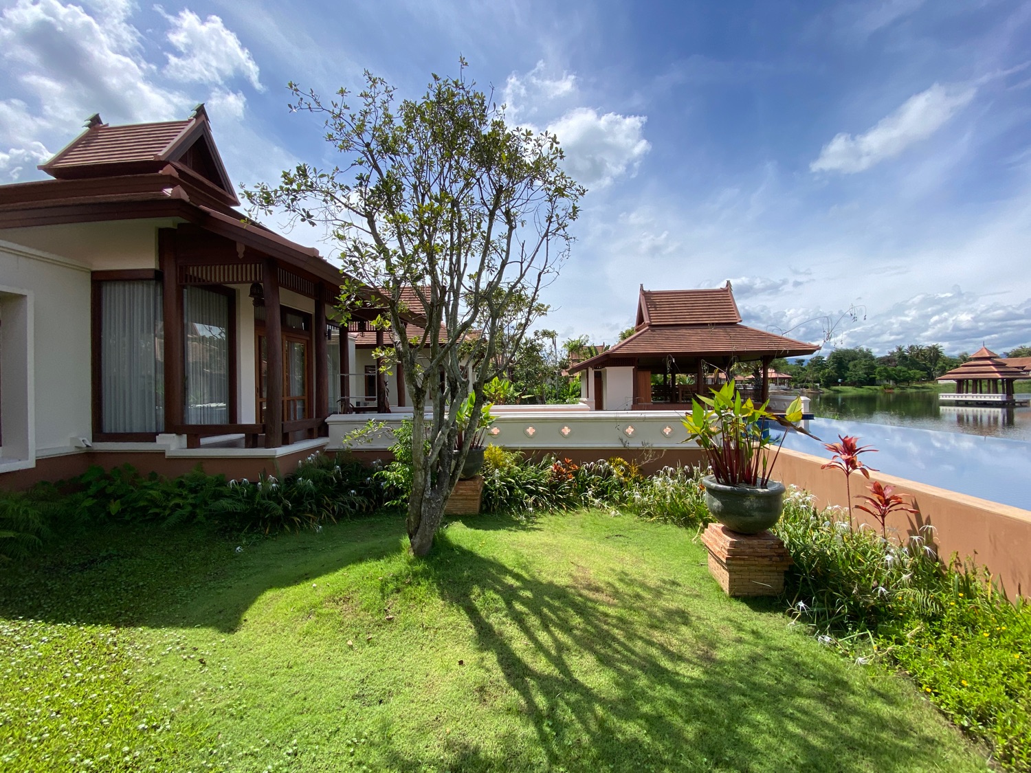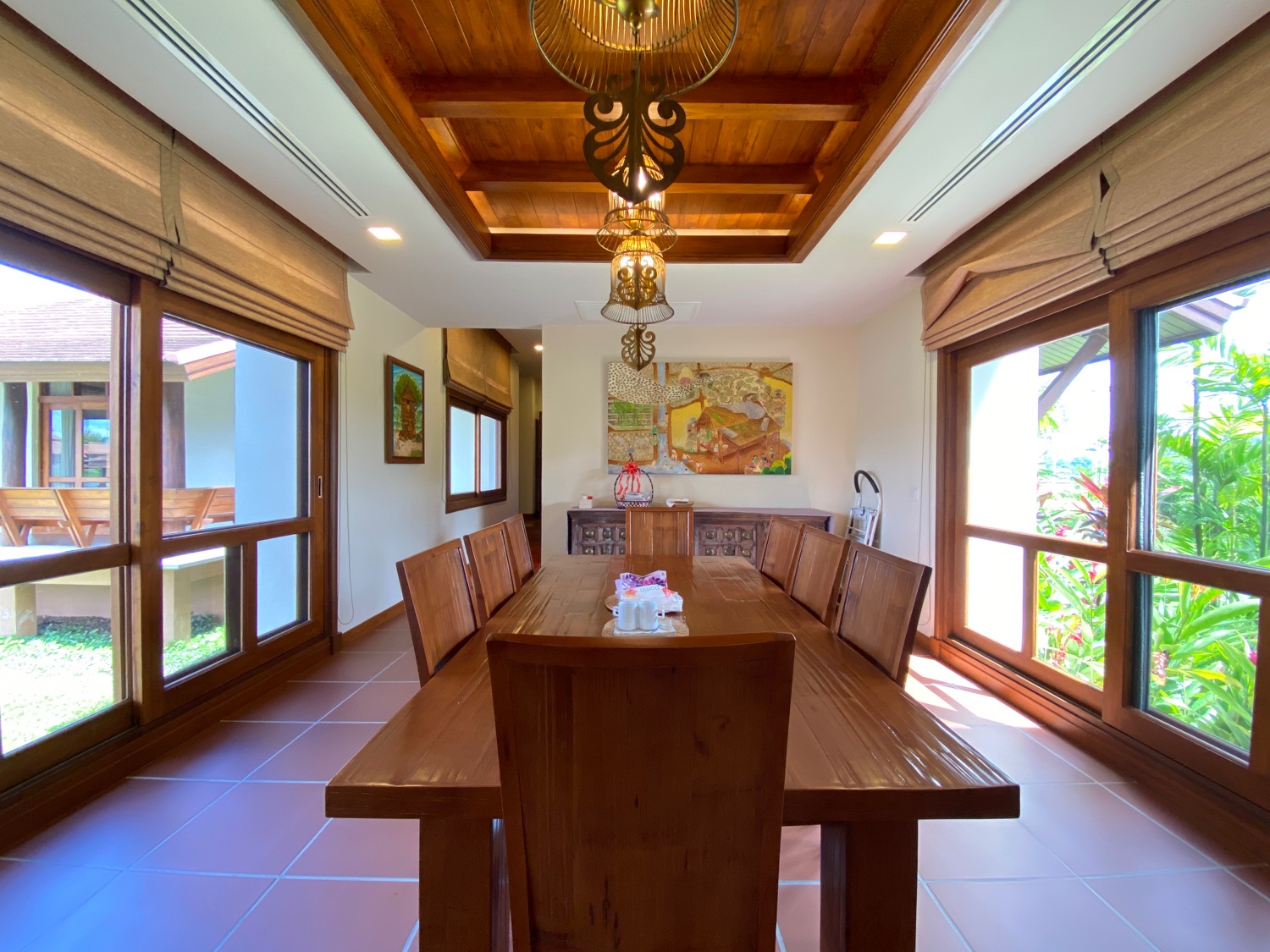 This villa is one of the smaller ones with 4 bedroom, sits amidst large landscape garden, it comes with covered and open parking and 2 entrances, one main entrance and another one from the carport that leads to storage room and bedroom three on the south wing. Some steps leading up to the main entrance where the large sitting room awaits, overlooking the pool and lake beyond. Tall wood beams ceiling allowing for breeze, airflow and natural light. To the right is a dining room, fully fitted Western kitchen, and split level leading to master bedroom at the north wing and the second bedroom. All rooms are tastefully furnished featuring lot of wood fixture, furniture are either handpicked or custom made. From the pool to the left is a large sala for dining and relaxing. It comes with a pantry as well a shower and bathroom. The service area for the pool is underneath this sala.