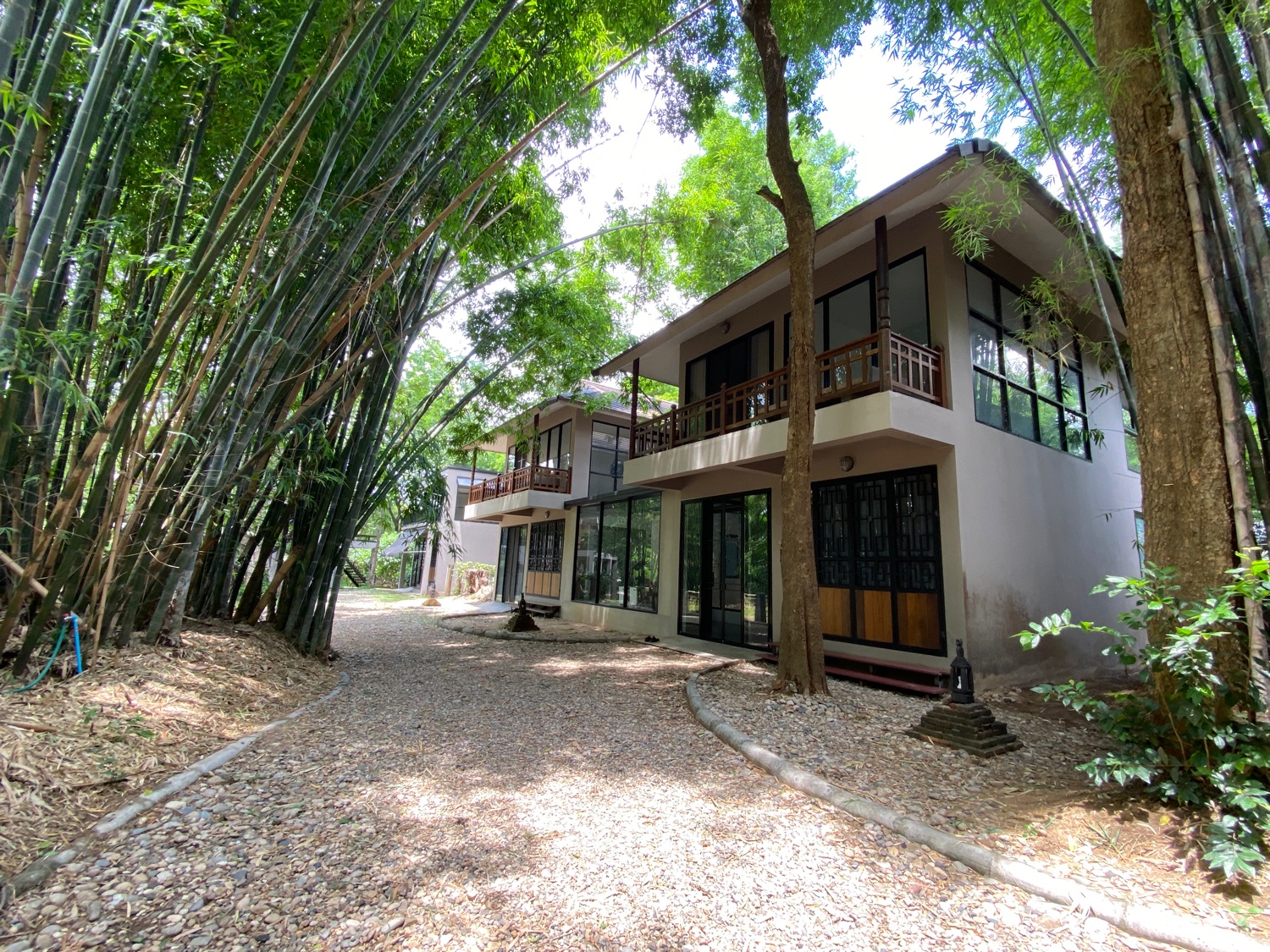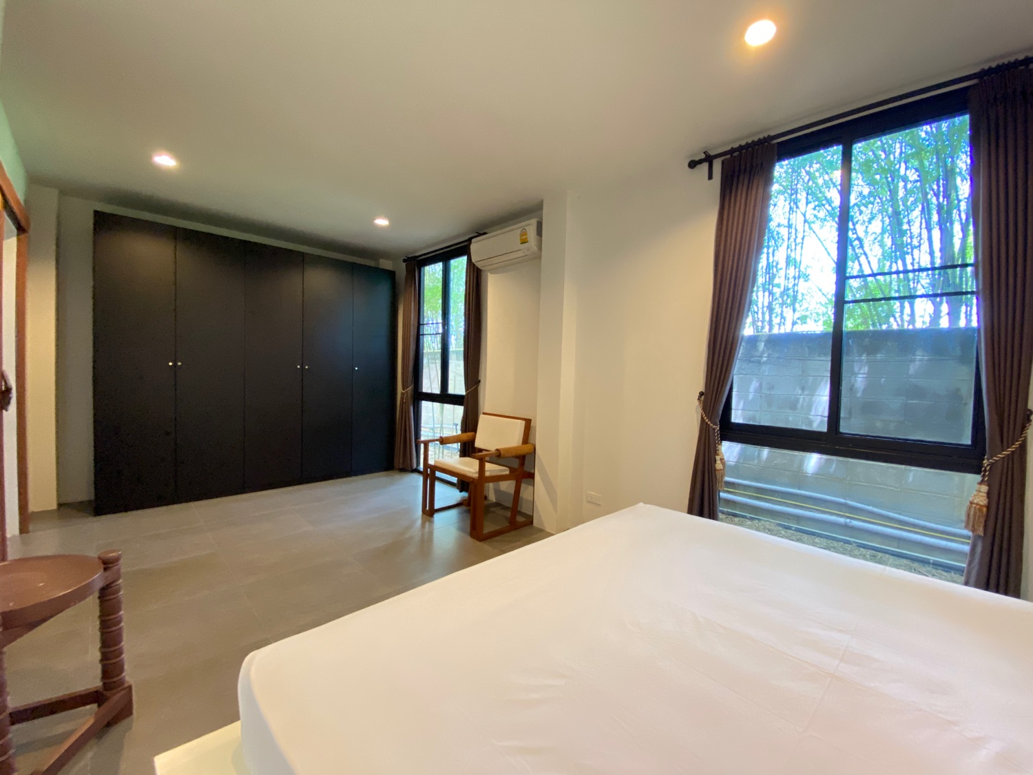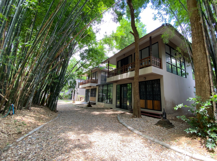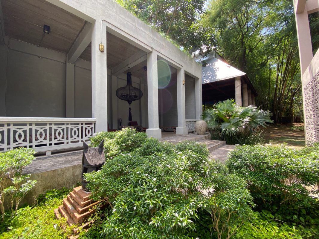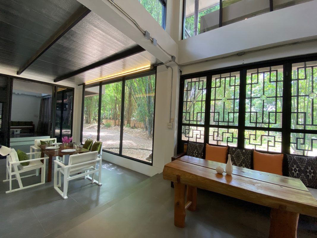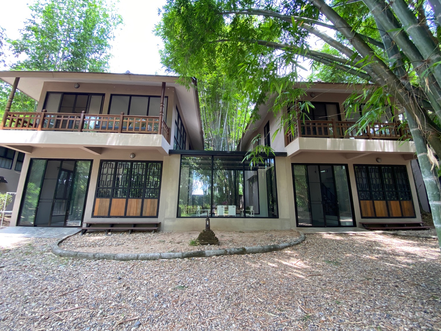 Modern and stylish 6-bedroom twin house for rent fully furnished near Ping River in Don Kaew area of Chiang Mai. Located just north of the city about 10 minutes drive to Mee Chok Plaza and 700 years stadium, the location also offers convenient reach to hospitals, schools and downtown Chiang Mai. About 20 minutes drive to the airport. The property is one of only 5 properties in this exclusive estate. Originally two houses, the owner has connected them with a conservatory or sunroom-style dining room in the middle. The two houses are identical with an open-plan living area with a tall ceiling, and a cute kitchen on the ground floor as well as a guest bathroom with a Victorian bathtub and a guest bedroom which can also be used as a study. On the second floor there are two further bedrooms both ensuite and come with terraces to enjoy the peaceful surroundings. The house is stylishly decorated using good quality and unique furniture pieces. The estate is cosy with gravel ground and bamboo. There is a common house by the river that residents can use for entertaining and a vegetable patch area where residents can grow their own vegetables. A unique and charming set-up in nature surroundings so close to town!