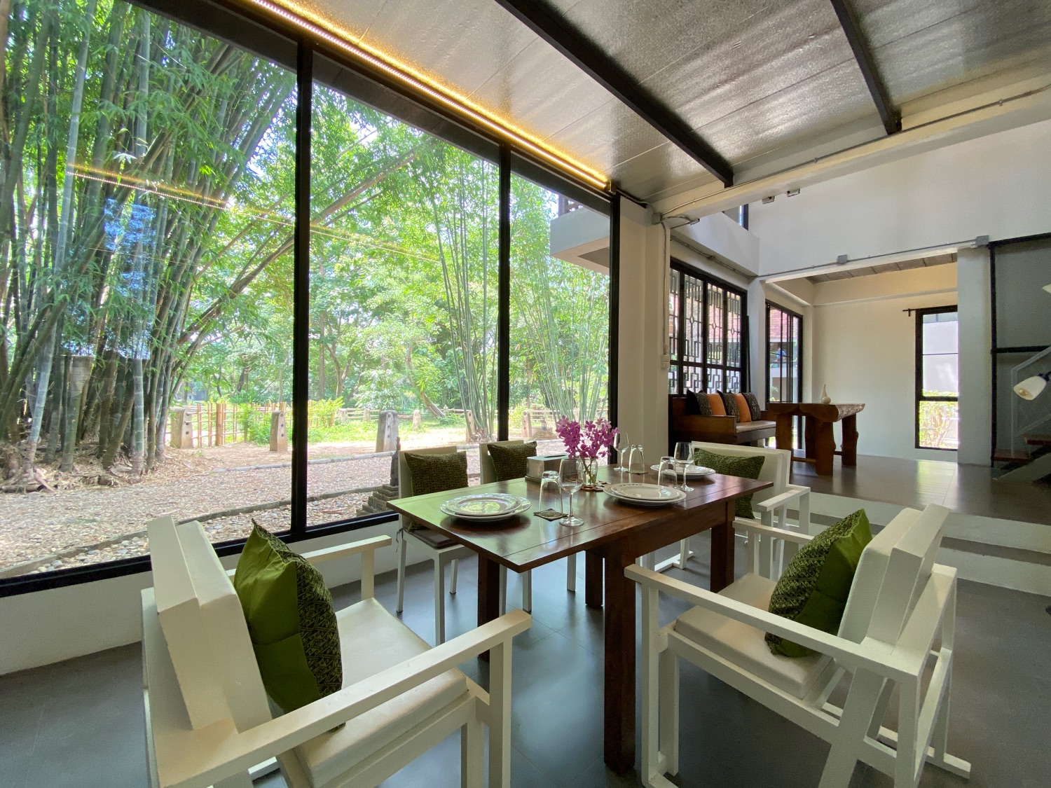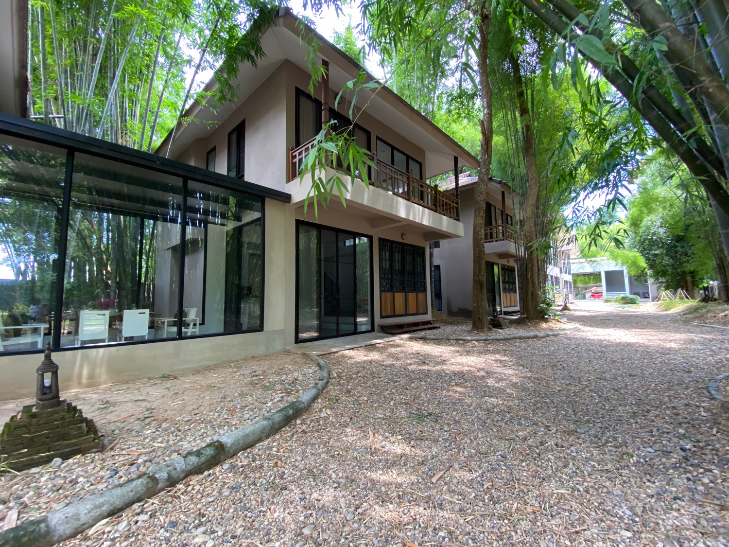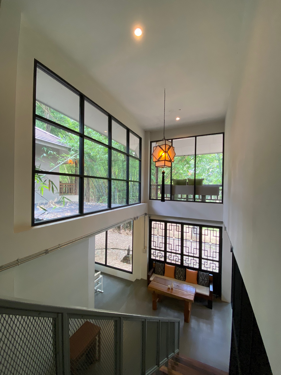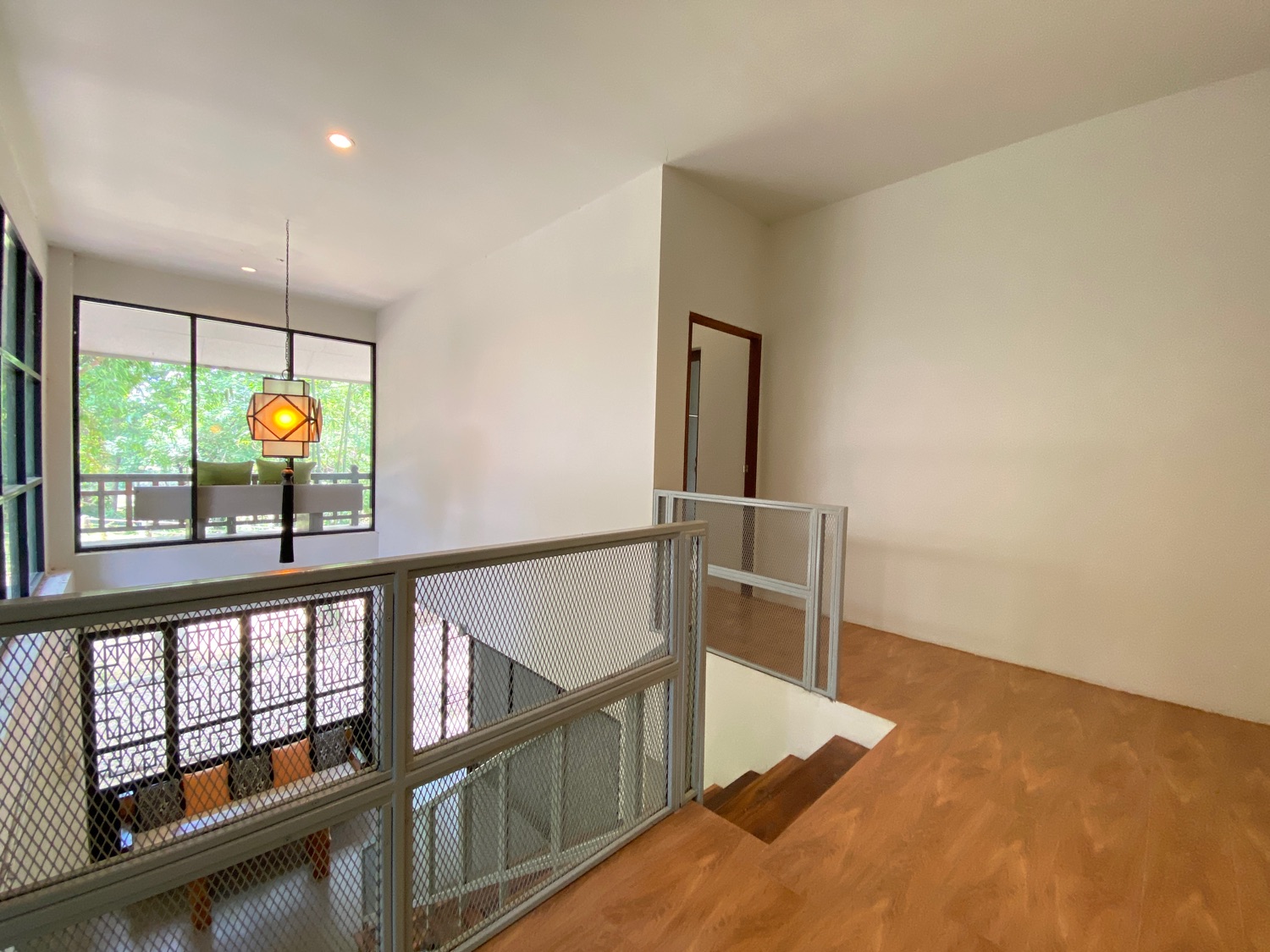 Modern and stylish 6-bedroom twin house for rent fully furnished near Ping River in Don Kaew area of Chiang Mai. Located just north of the city about 10 minutes drive to Mee Chok Plaza and 700 years stadium, the location also offers convenient reach to hospitals, schools and downtown Chiang Mai. About 20 minutes drive to the airport. The property is one of only 5 properties in this exclusive estate. Originally two houses, the owner has connected them with a conservatory or sunroom-style dining room in the middle. The two houses are identical with an open-plan living area with a tall ceiling, and a cute kitchen on the ground floor as well as a guest bathroom with a Victorian bathtub and a guest bedroom which can also be used as a study. On the second floor there are two further bedrooms both ensuite and come with terraces to enjoy the peaceful surroundings. The house is stylishly decorated using good quality and unique furniture pieces. The estate is cosy with gravel ground and bamboo. There is a common house by the river that residents can use for entertaining and a vegetable patch area where residents can grow their own vegetables. A unique and charming set-up in nature surroundings so close to town!