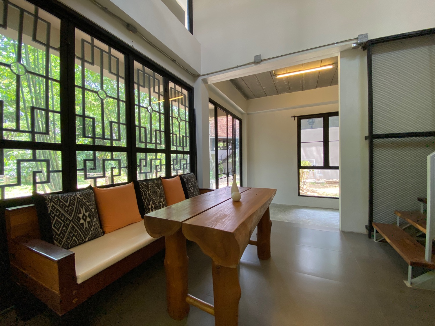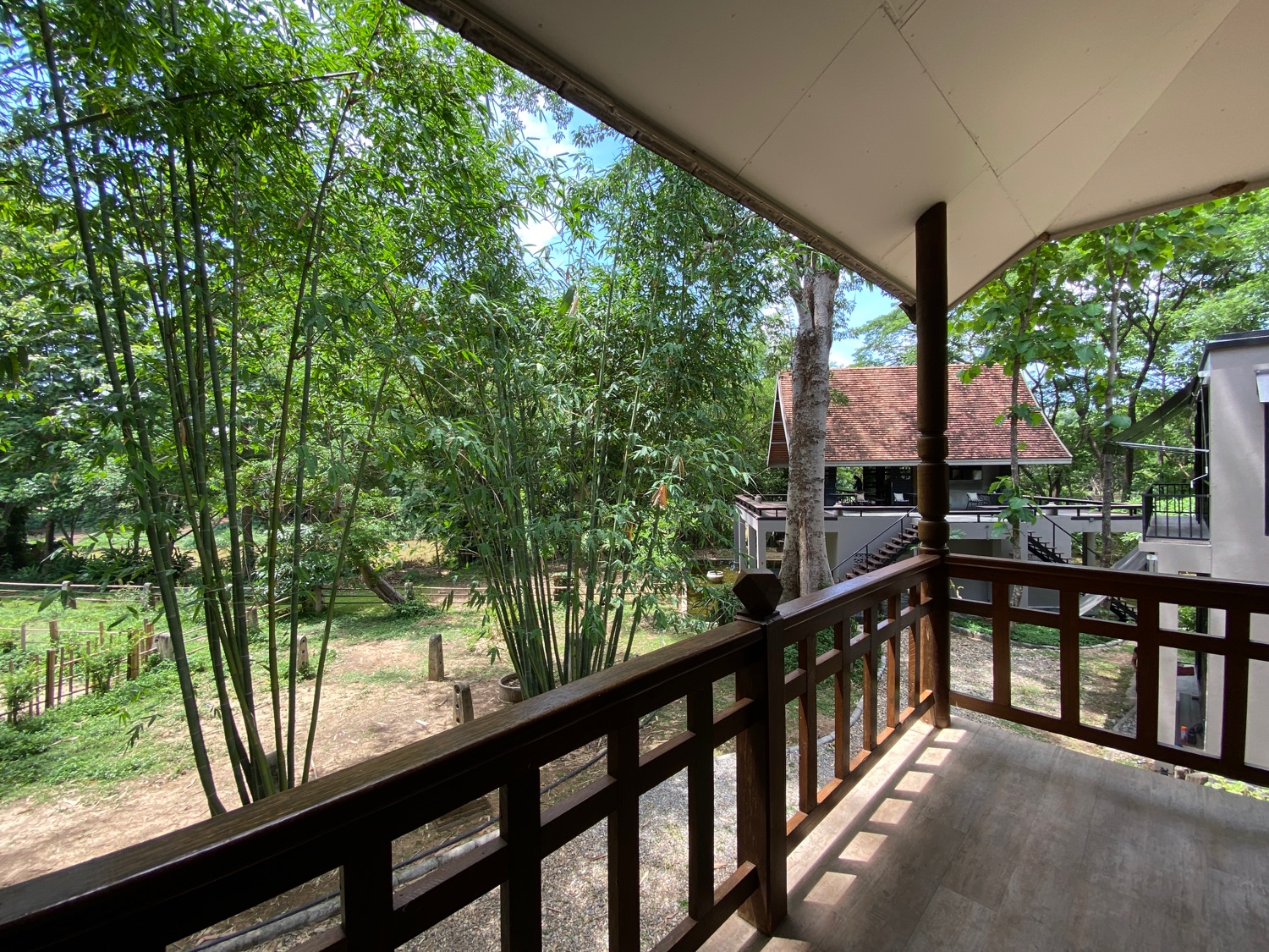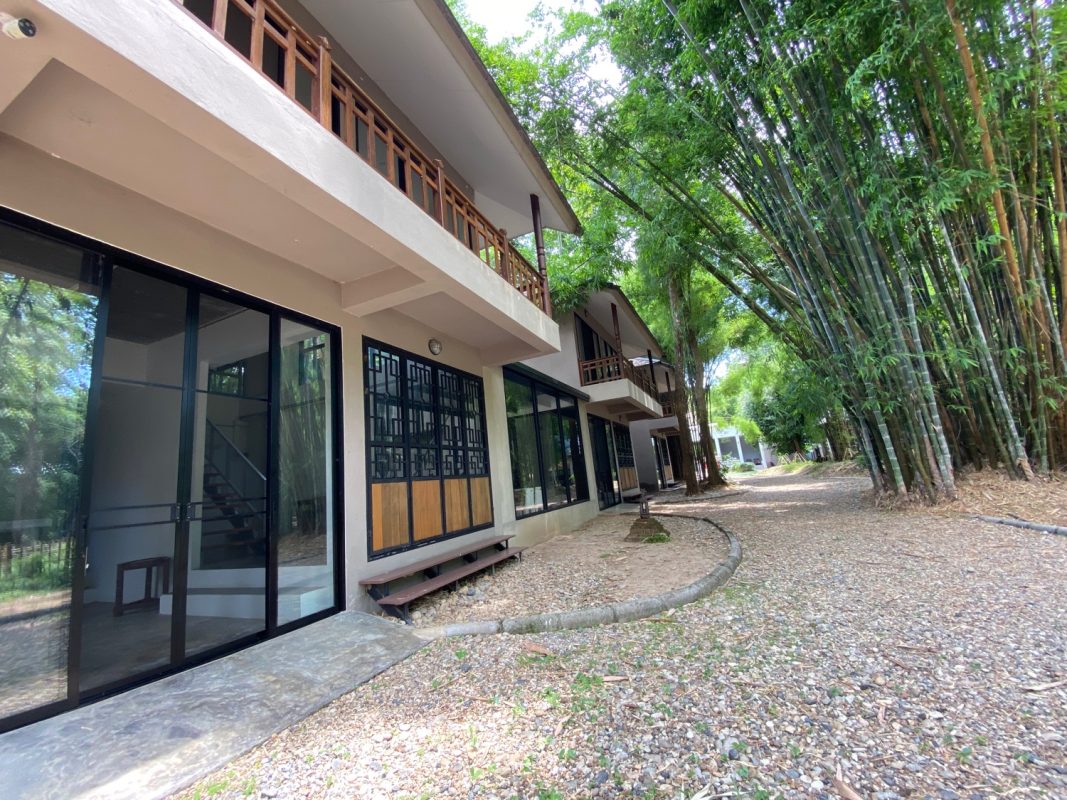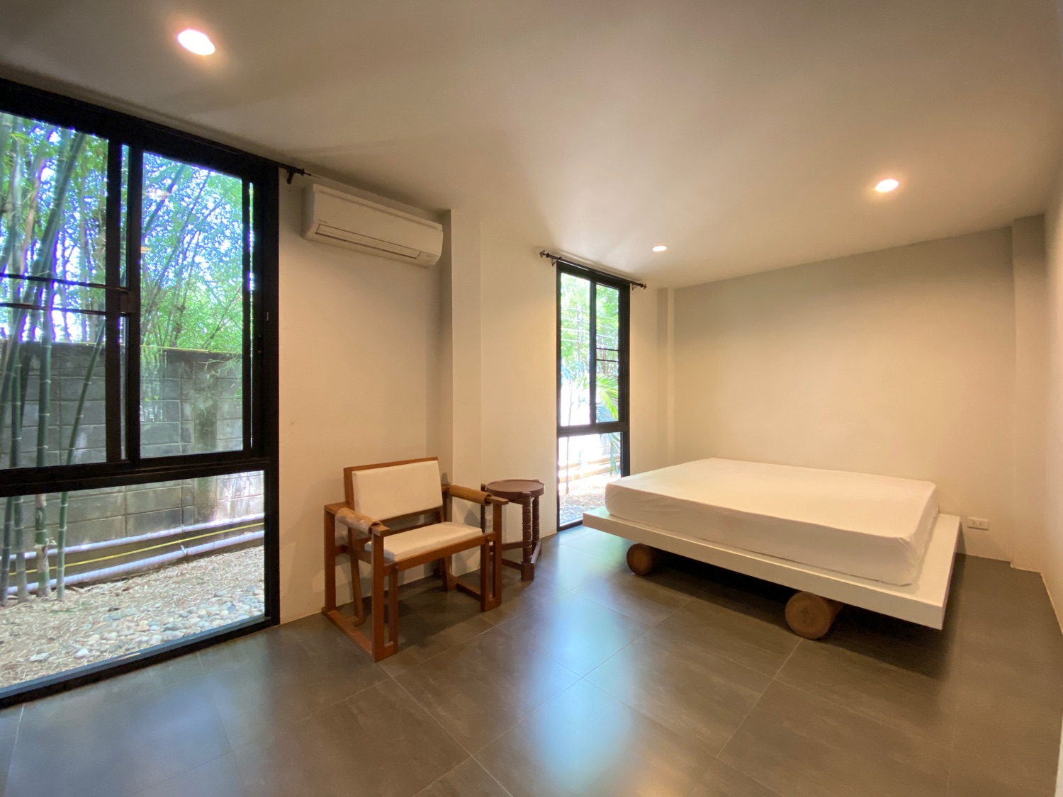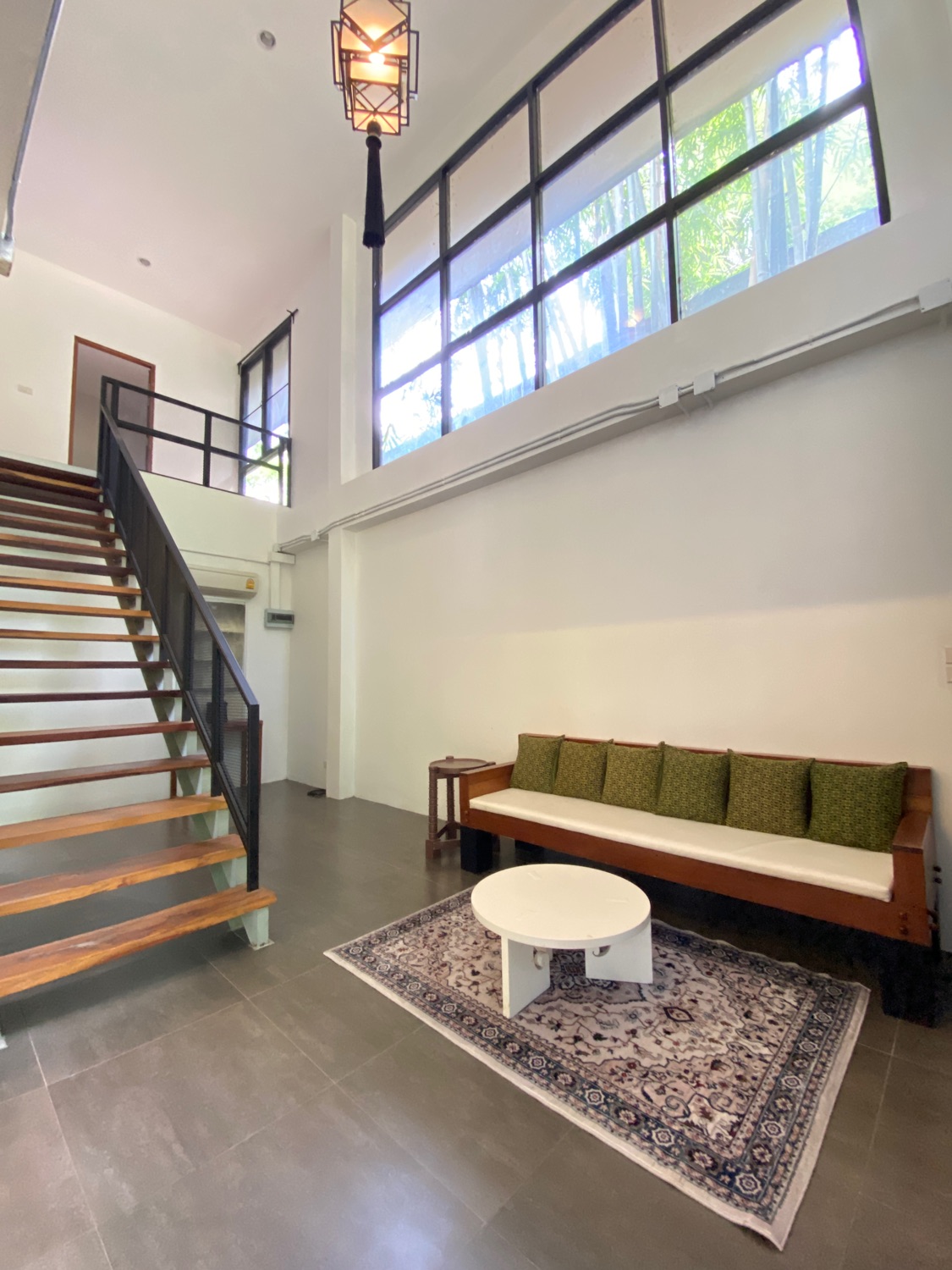 Modern and stylish 6-bedroom twin house for rent fully furnished near Ping River in Don Kaew area of Chiang Mai. Located just north of the city about 10 minutes drive to Mee Chok Plaza and 700 years stadium, the location also offers convenient reach to hospitals, schools and downtown Chiang Mai. About 20 minutes drive to the airport. The property is one of only 5 properties in this exclusive estate. Originally two houses, the owner has connected them with a conservatory or sunroom-style dining room in the middle. The two houses are identical with an open-plan living area with a tall ceiling, and a cute kitchen on the ground floor as well as a guest bathroom with a Victorian bathtub and a guest bedroom which can also be used as a study. On the second floor there are two further bedrooms both ensuite and come with terraces to enjoy the peaceful surroundings. The house is stylishly decorated using good quality and unique furniture pieces. The estate is cosy with gravel ground and bamboo. There is a common house by the river that residents can use for entertaining and a vegetable patch area where residents can grow their own vegetables. A unique and charming set-up in nature surroundings so close to town!